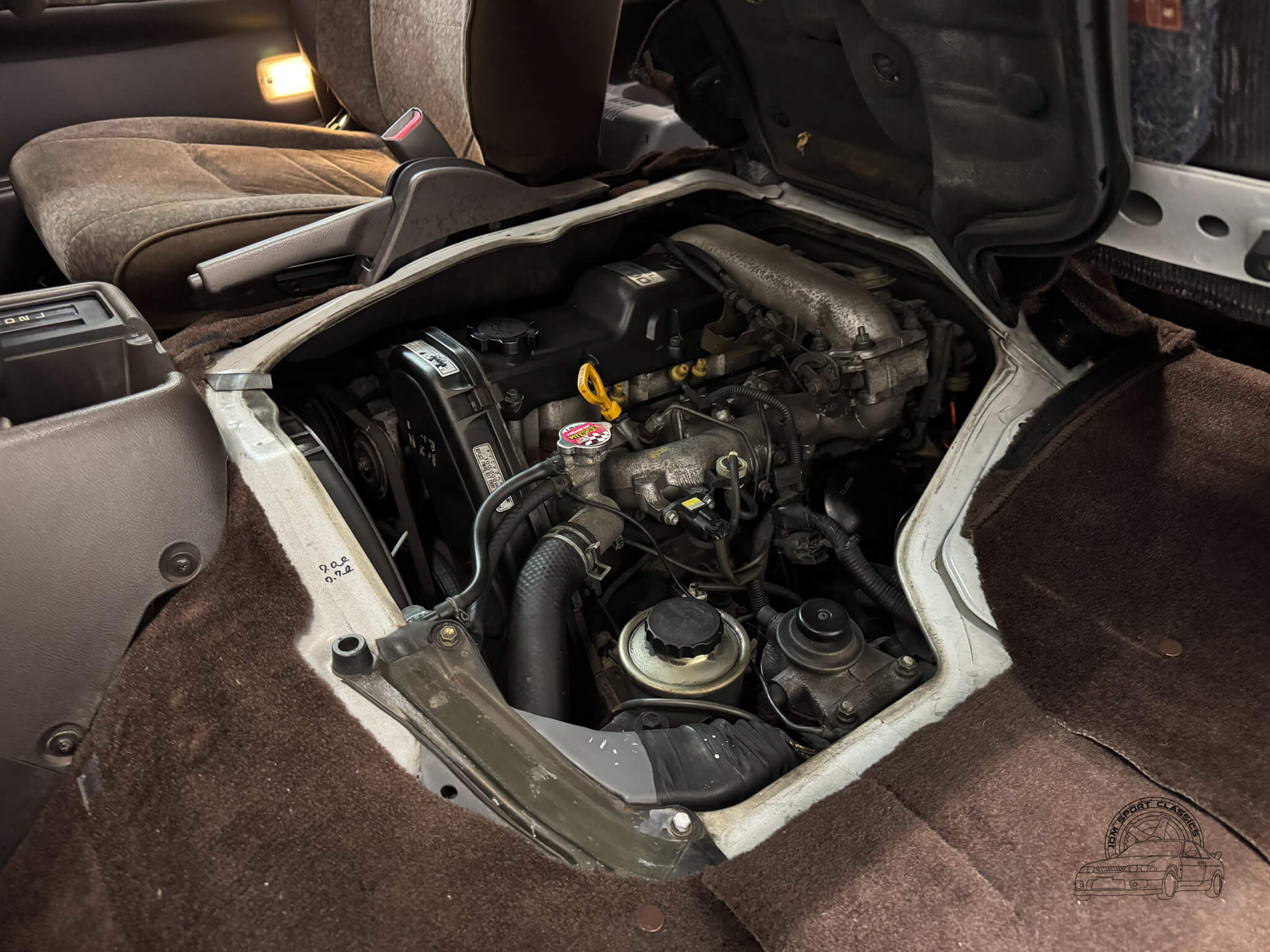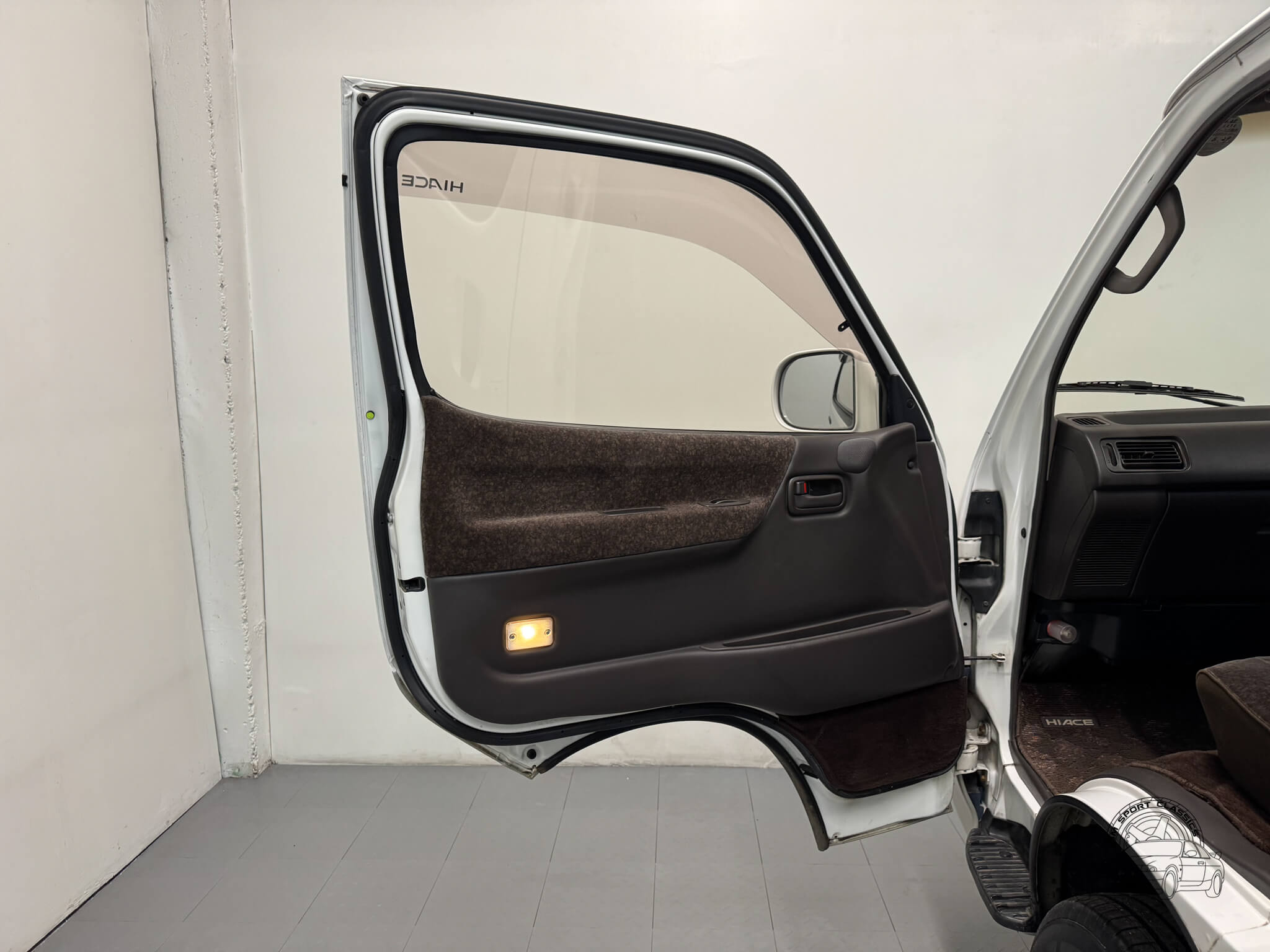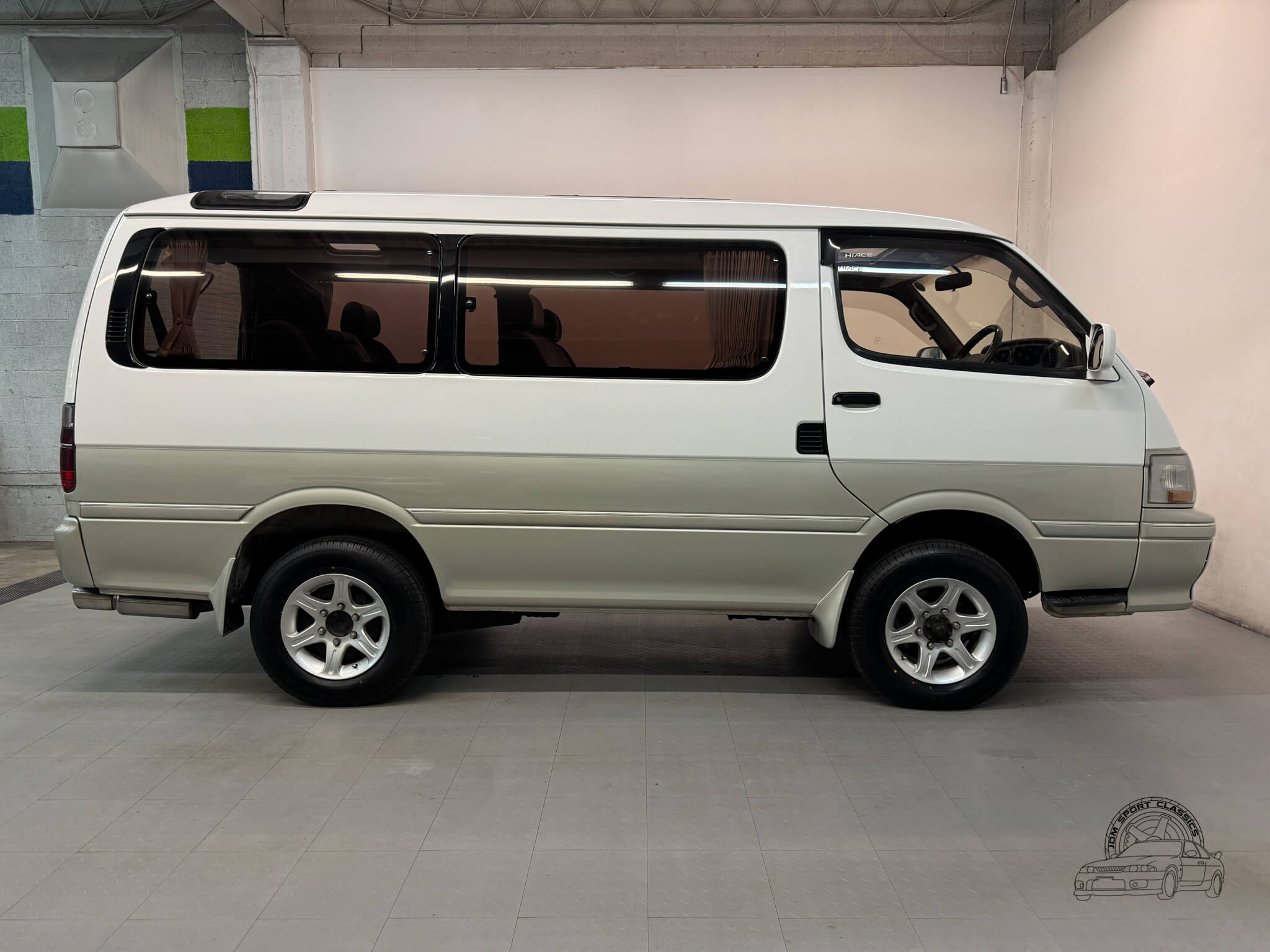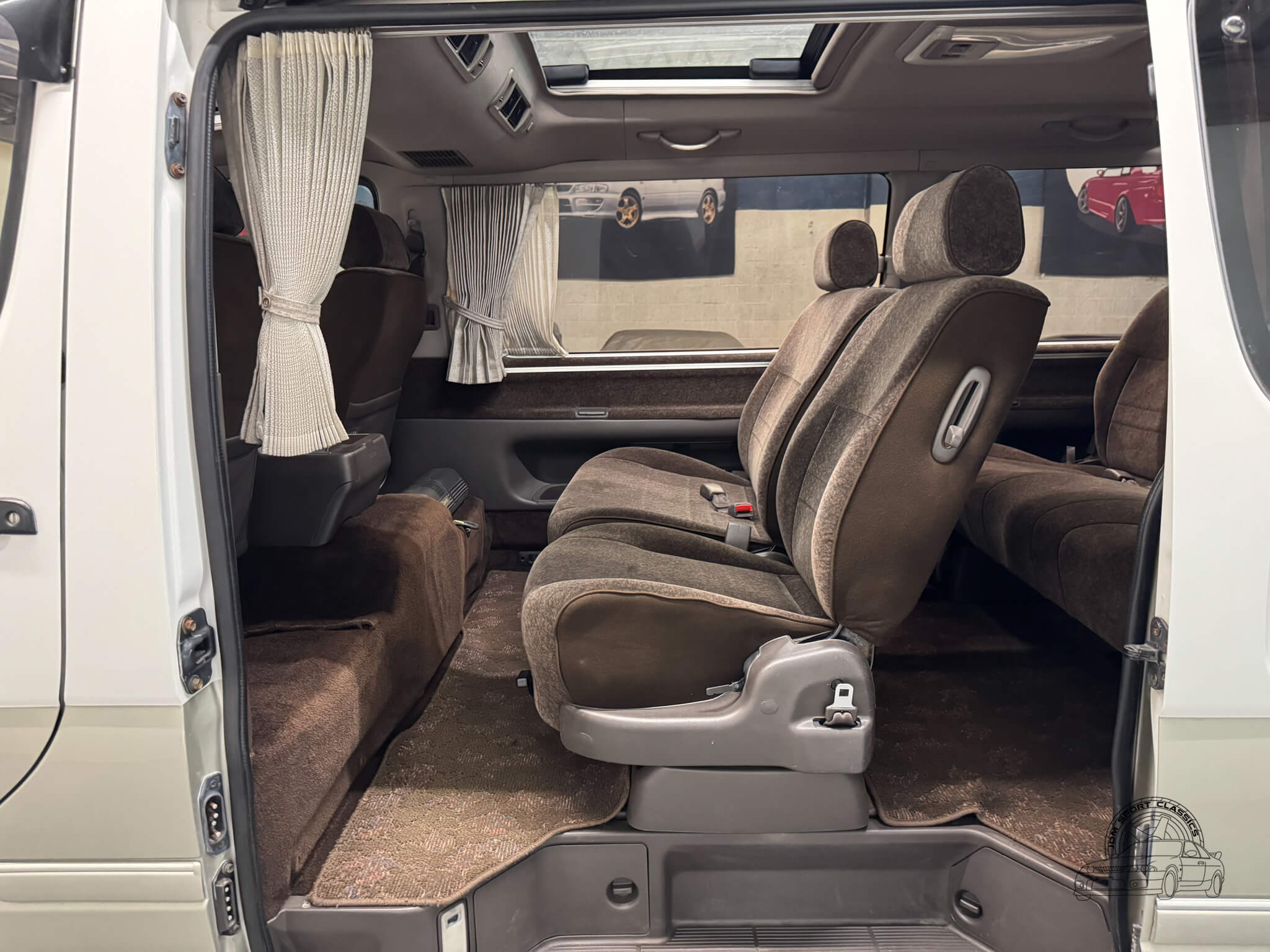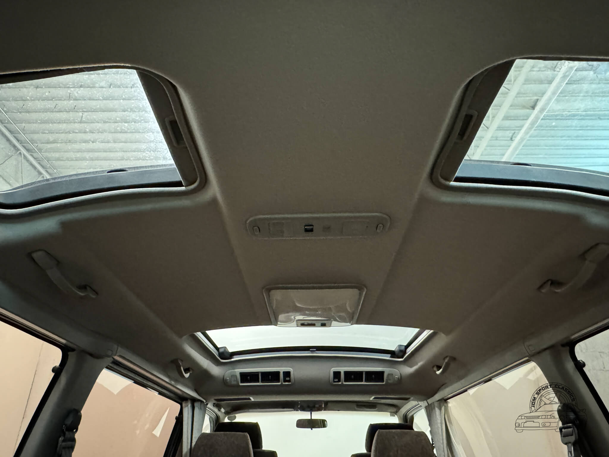 The Super Custom cabin is a masterclass in 90s modularity, centered around a versatile 8 seater layout and the iconic triple sunroof suite. This configuration features a manual front pop-up roof, a massive power operated panoramic moonroof over the middle row, and dual power tilting skylights at the rear. The comfortable brown cloth interior remains well-preserved, with a middle row that can swivel and rotate to face the rear or be configured in multiple ways to suit the trip. For those looking to camp, both the second and third rows can be folded to create a large sleeping platform. The cabin is further equipped with front and rear climate control, privacy curtains, and a factory air purifier. Details like the OEM HiAce floor mats, tilting steering wheel, and integrated cupholders complete a space that is as functional as it is unique.