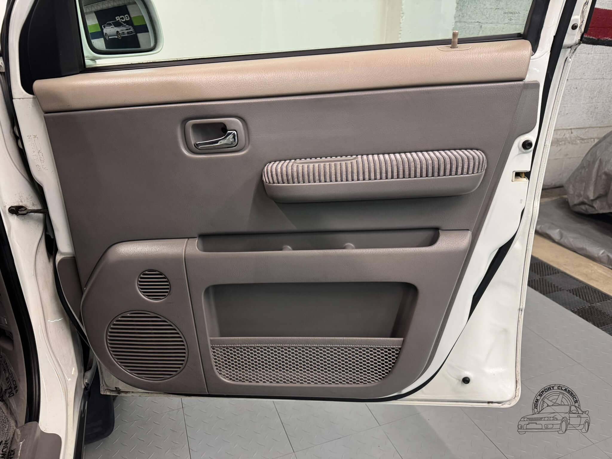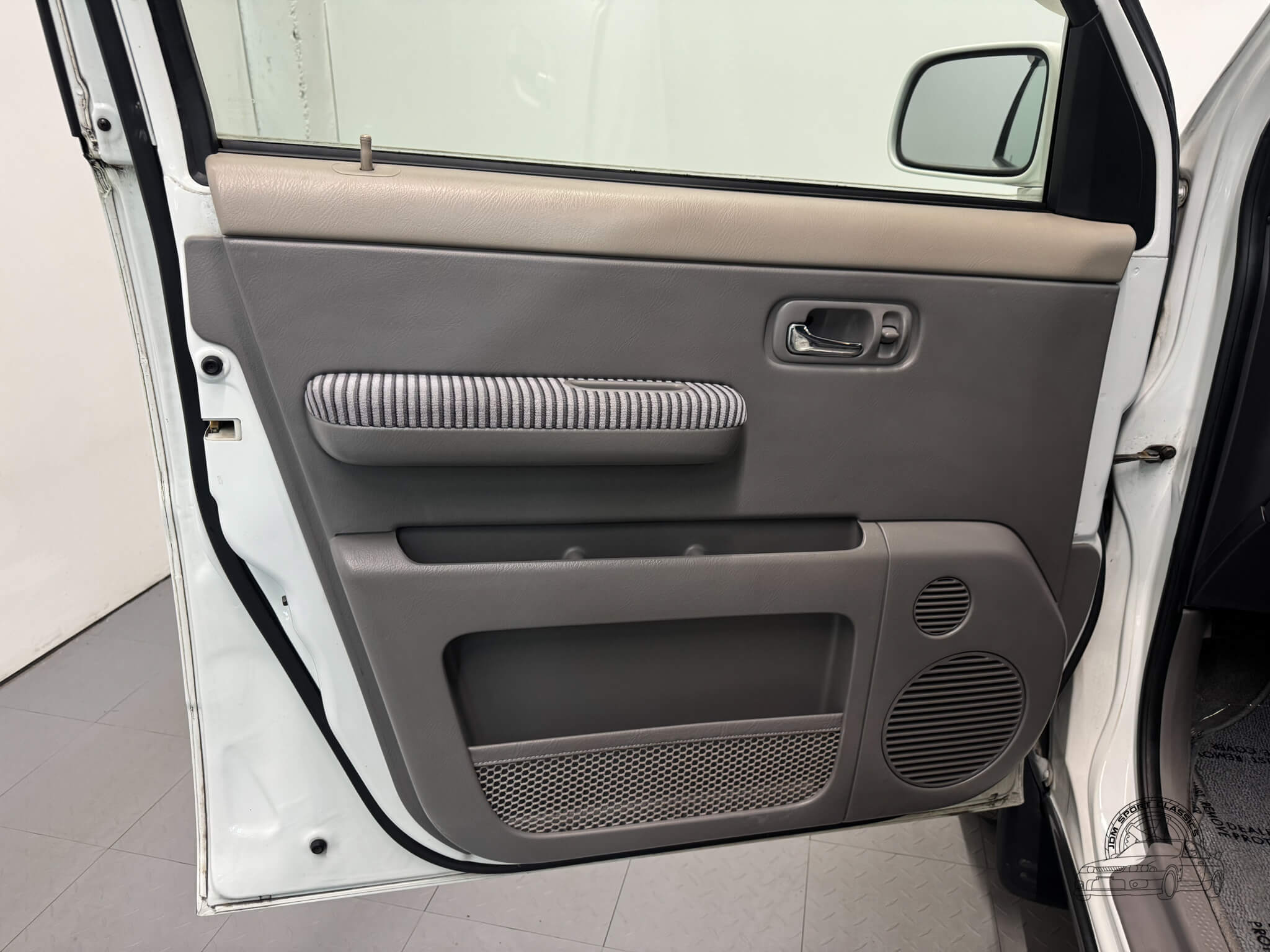 On the outside, this StepWgn G wears a tasteful two-tone finish of Taffeta White over Gray Metallic, a combination that highlights its boxy, upright shape and crisp edges. The paint is in good condition, and rainguards on the windows add a practical touch for all weather driving. Its tall, boxy exterior maximizes interior space and visibility but also gives the StepWgn a timeless look that is unlike anything ever offered in the USA.