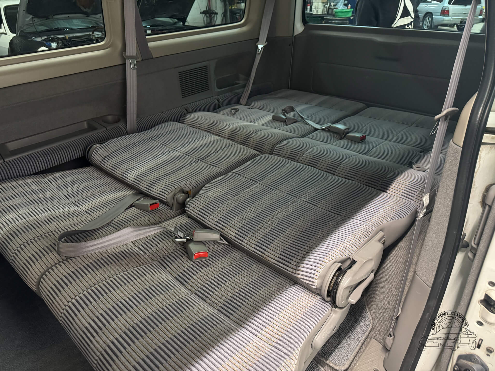 Step inside the StepWgn G and the interior immediately shows why these vans are so easy to live with. Comfortable cloth seats, large windows, and a high roofline make the cabin bright and spacious, while front and rear climate control, a tilting steering wheel, and rear pop-out windows with privacy tint keep everyone comfortable. The seating layout is highly adaptable: middle-row seats fold forward to create extra space, third-row jump seats fold and stow to the sides when you need more cargo room, and both middle and third rows fold flat to form a cozy sleeping area for overnight trips. Thoughtful touches like cupholders, power windows, and adjustable mirrors make everyday use effortless, and with just 57,133 miles, this StepWgn’s interior is ready for daily life and weekend adventures alike.