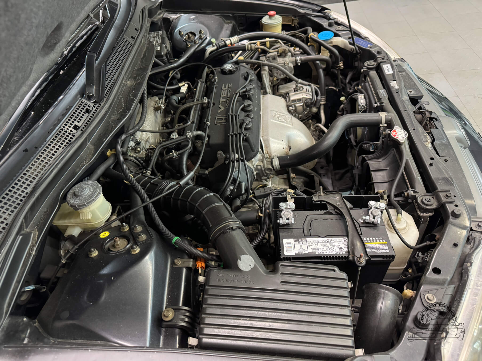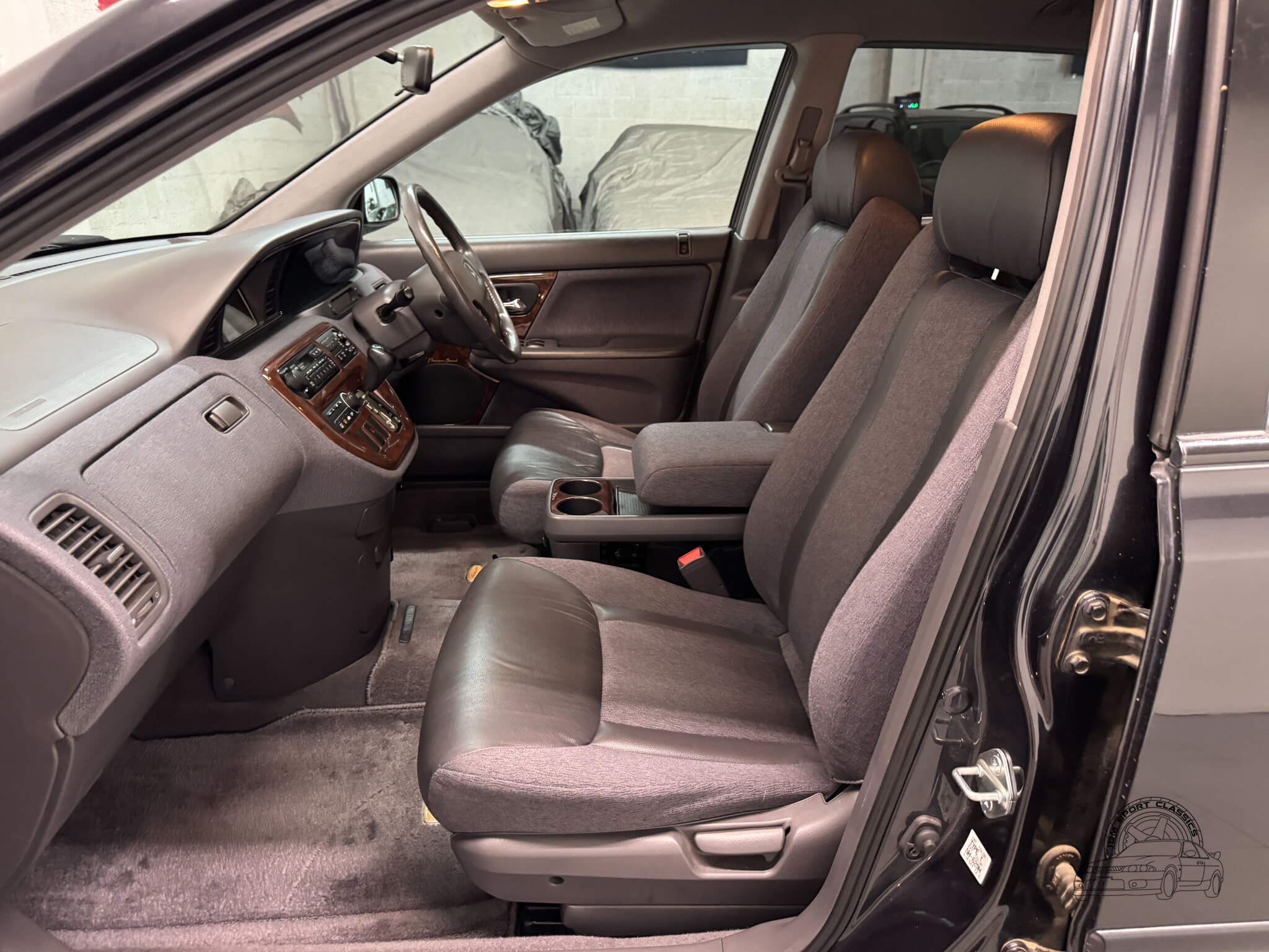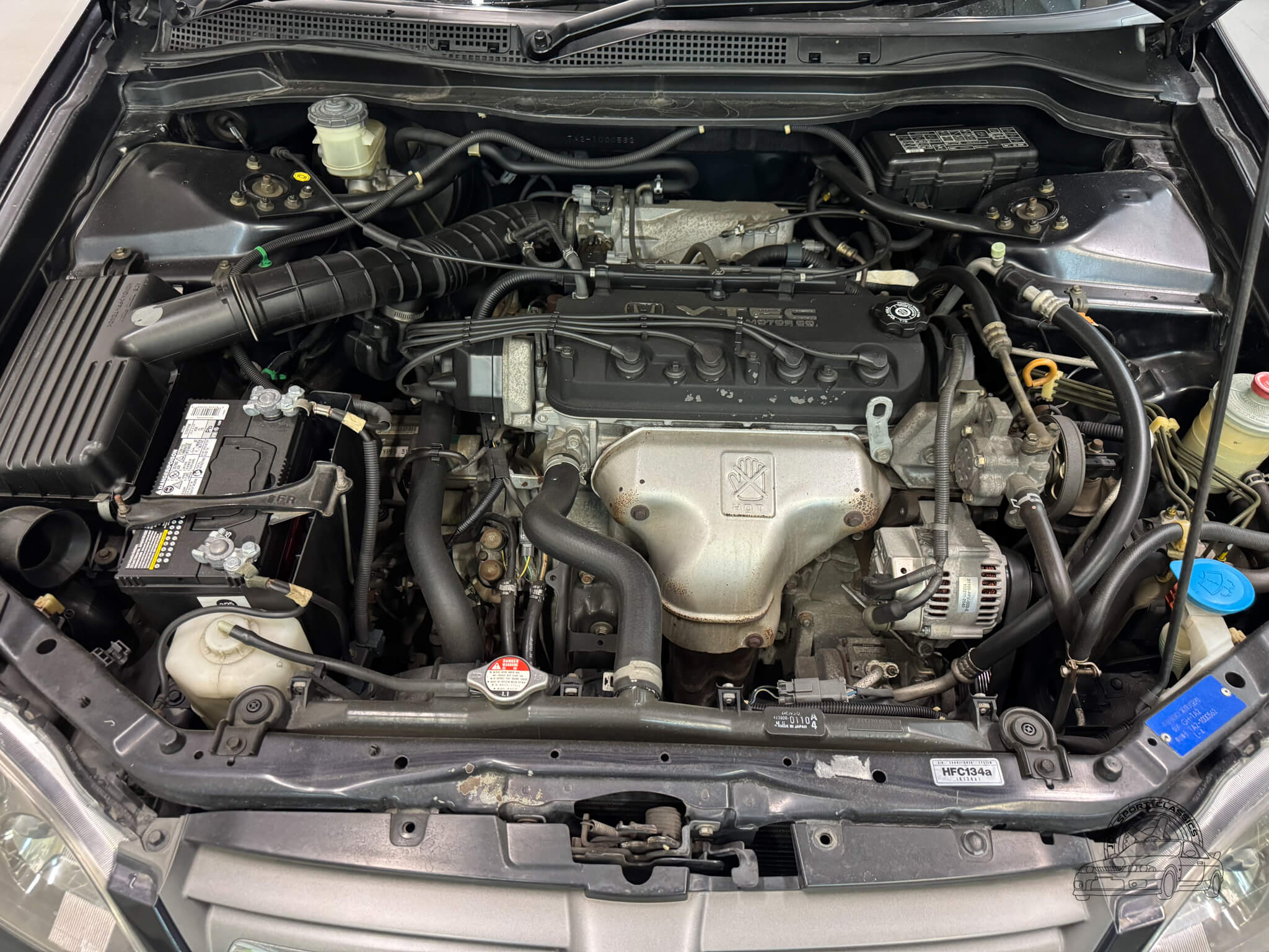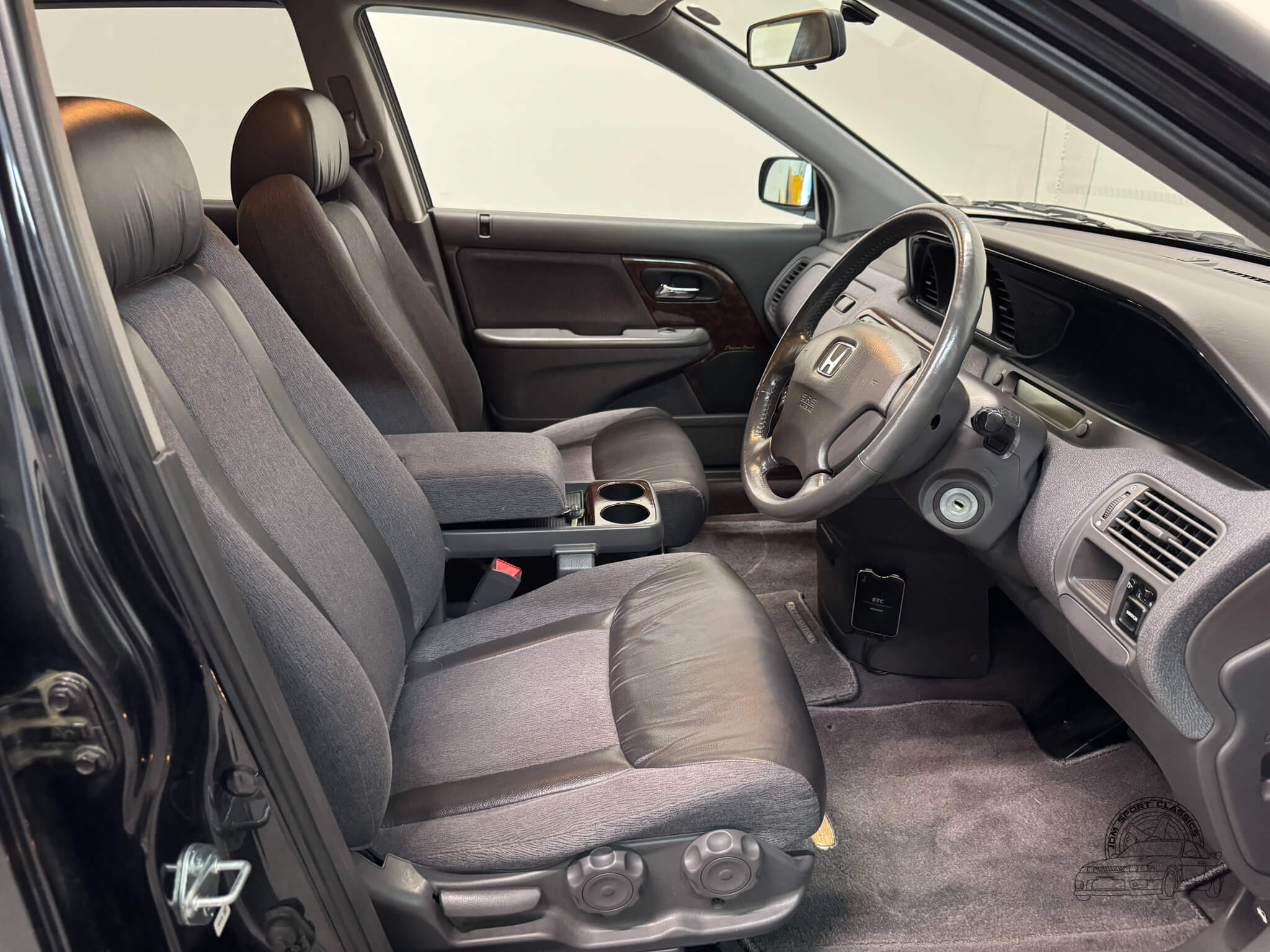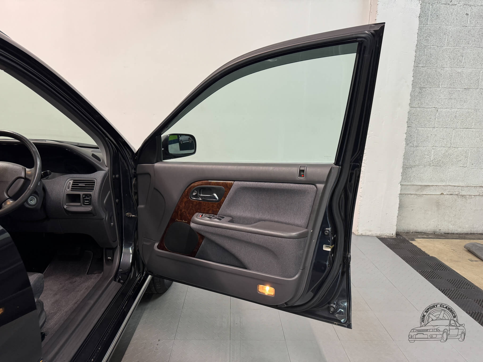 The exterior is finished in Quantum Grey Metallic (NH629M), a sharp color with a fine metallic flake that catches the light and highlights the car’s clean, understated lines. The paint is in excellent condition, reflecting the high quality finish of Honda’s premium models from this period. The design is balanced and functional, with subtle chrome accents and an upright stance that makes it a versatile choice for daily driving, a functional rural mail carrier, or even a compact weekend camper.