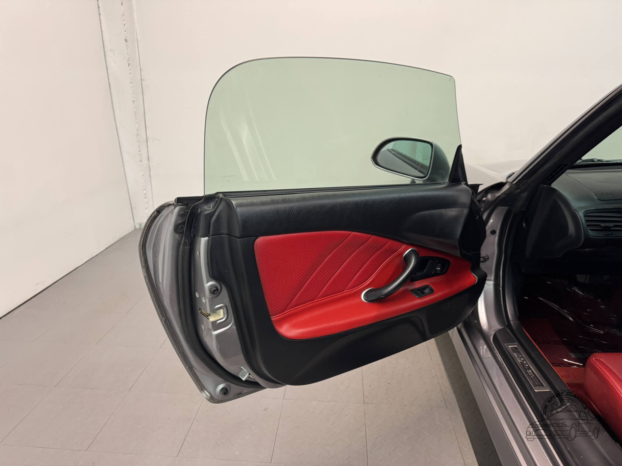 Inside, the S2000 features a driver focused cockpit with factory optional red leather seats, a digital instrument cluster, a leather wrapped steering wheel, and push button start. The manually operated soft top functions smoothly and includes a glass rear window with defroster. Power windows, power adjusting mirrors, cold A/C, and hot heat offer everyday comfort, while a center console cupholder adds a bit of practicality. The driver’s seat shows some wear, as expected for its age, but the cabin overall remains clean and well kept.