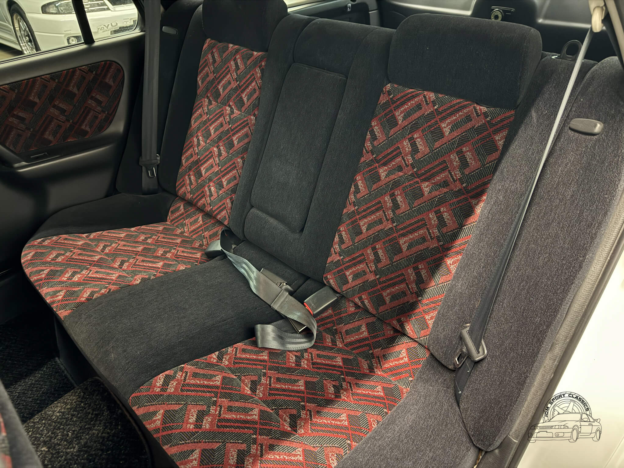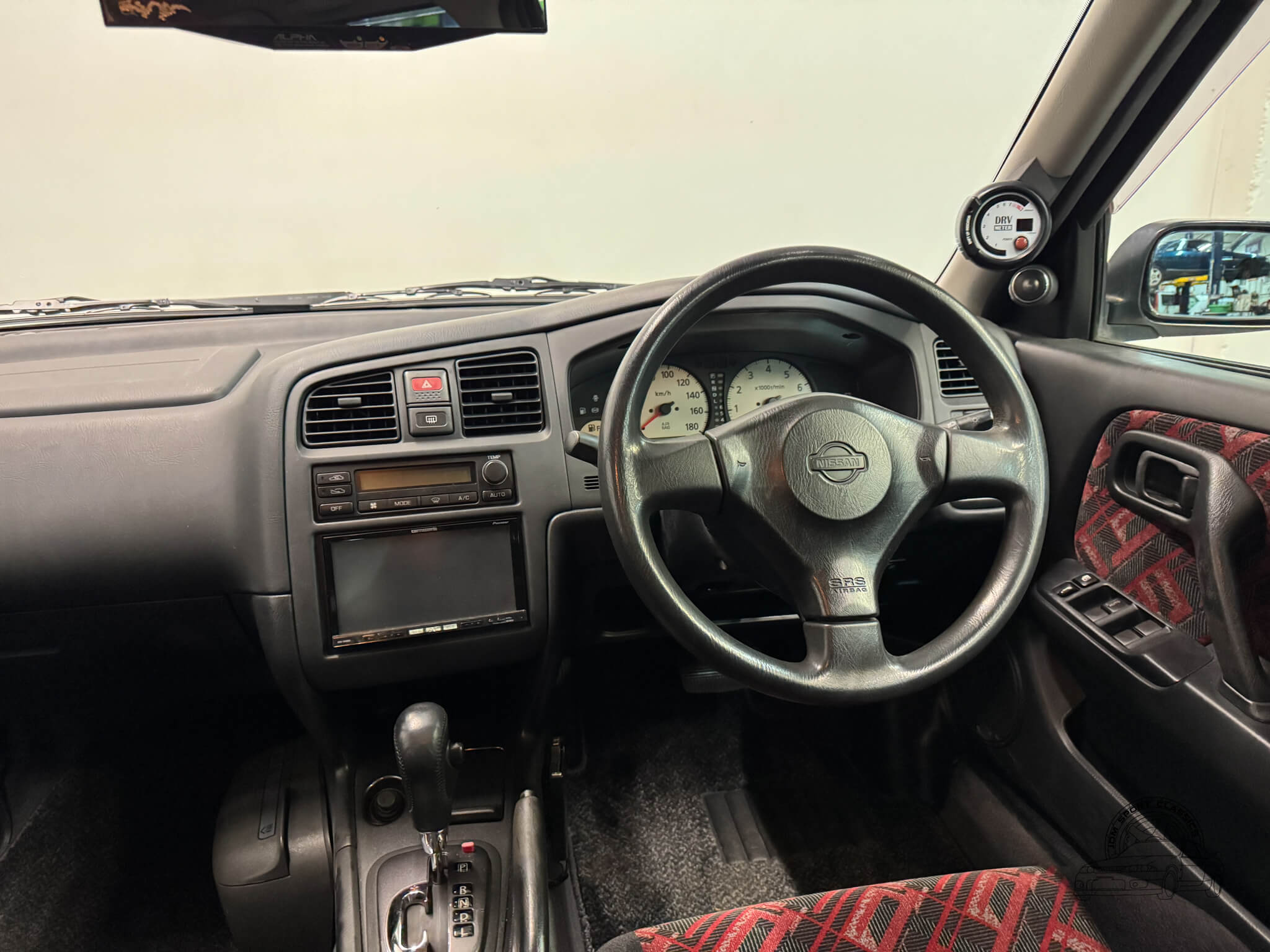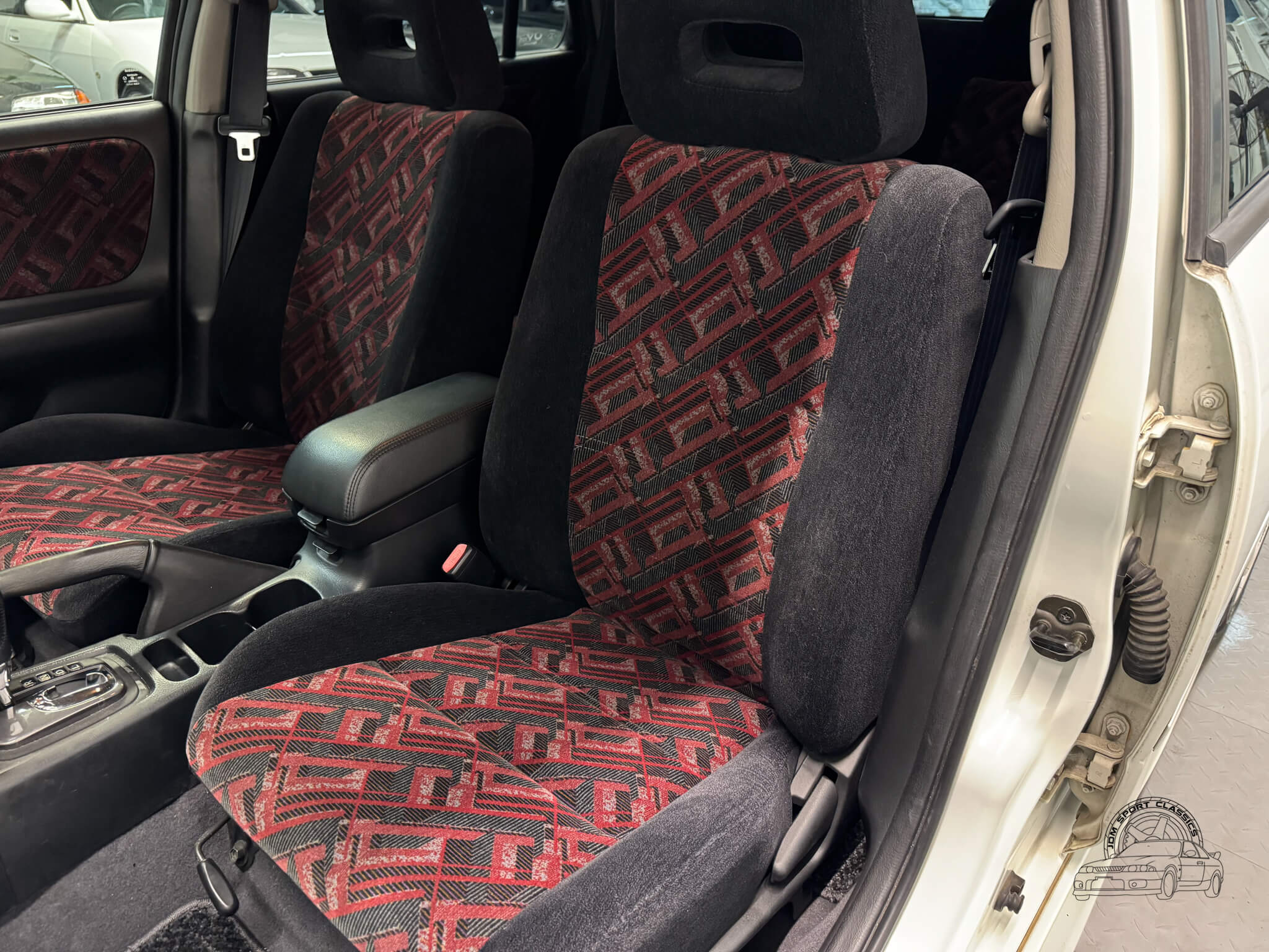 Inside, the Autech specific interior is a reminder that no areas were left untouched when the Primera was tuned. With a bold red, black, and white pattern cloth design that covers all seats and door panels, the interior stands out just as much as the exterior does. Seats are in overall great condition with no noticeable rips, tears, burns or stains, and the interior has been left largely untouched with only a Carrozzeria head unit and aftermarket RPM gauge located on the A-Pillar.