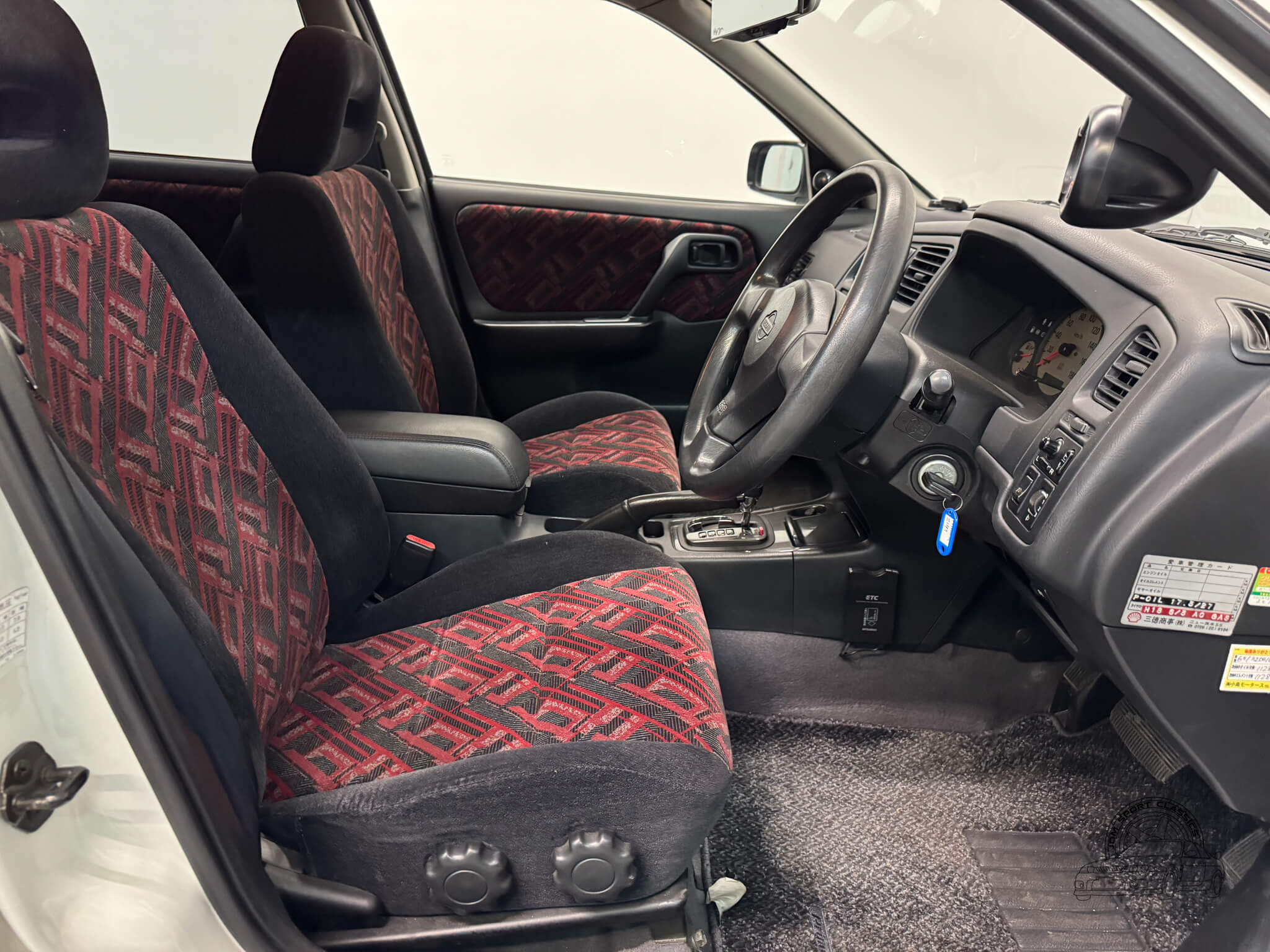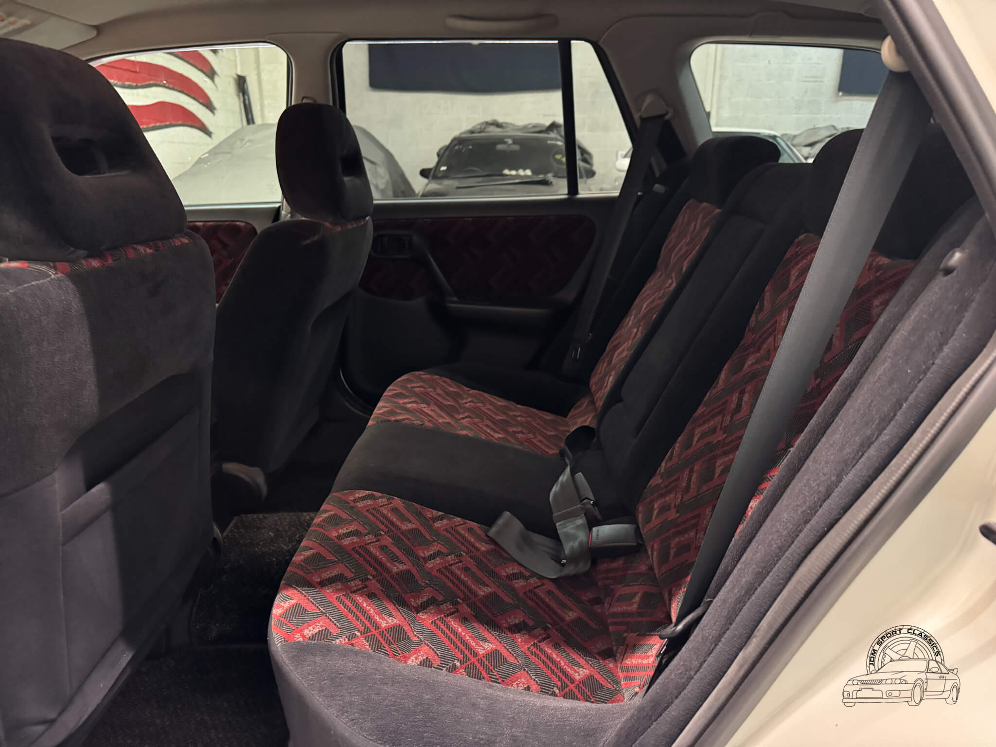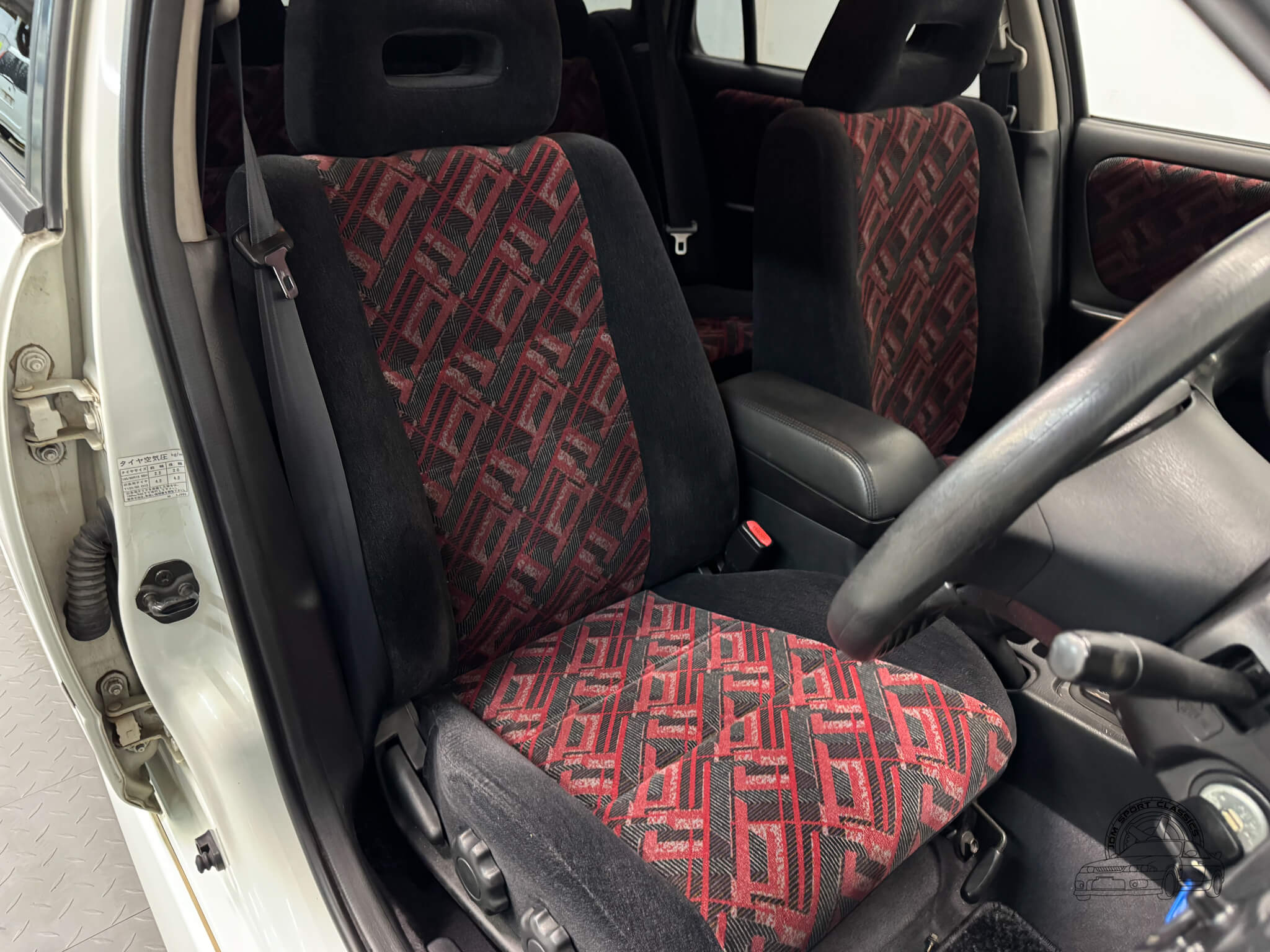 Inside, the Autech specific interior is a reminder that no areas were left untouched when the Primera was tuned. With a bold red, black, and white pattern cloth design that covers all seats and door panels, the interior stands out just as much as the exterior does. Seats are in overall great condition with no noticeable rips, tears, burns or stains, and the interior has been left largely untouched with only a Carrozzeria head unit and aftermarket RPM gauge located on the A-Pillar.