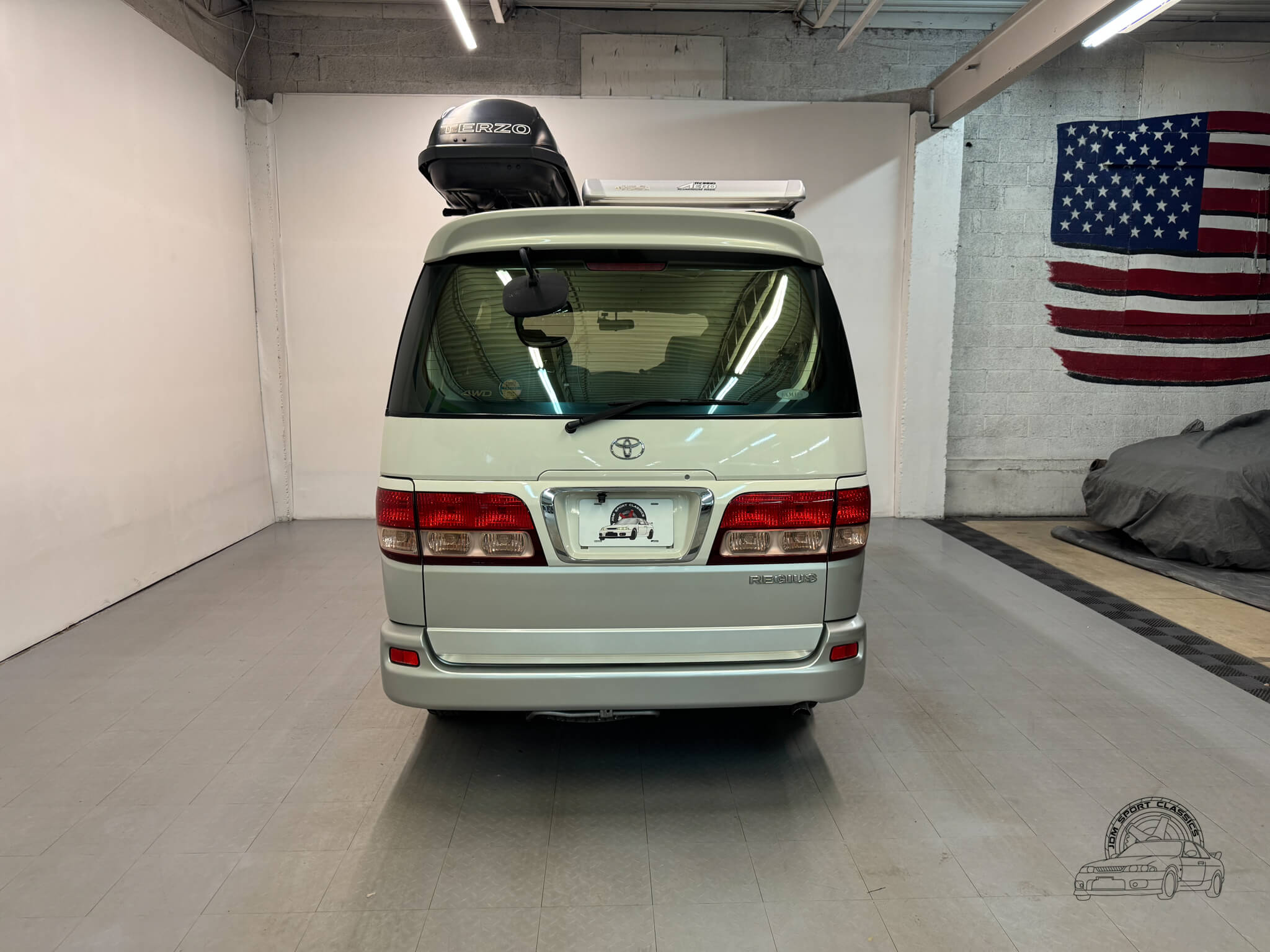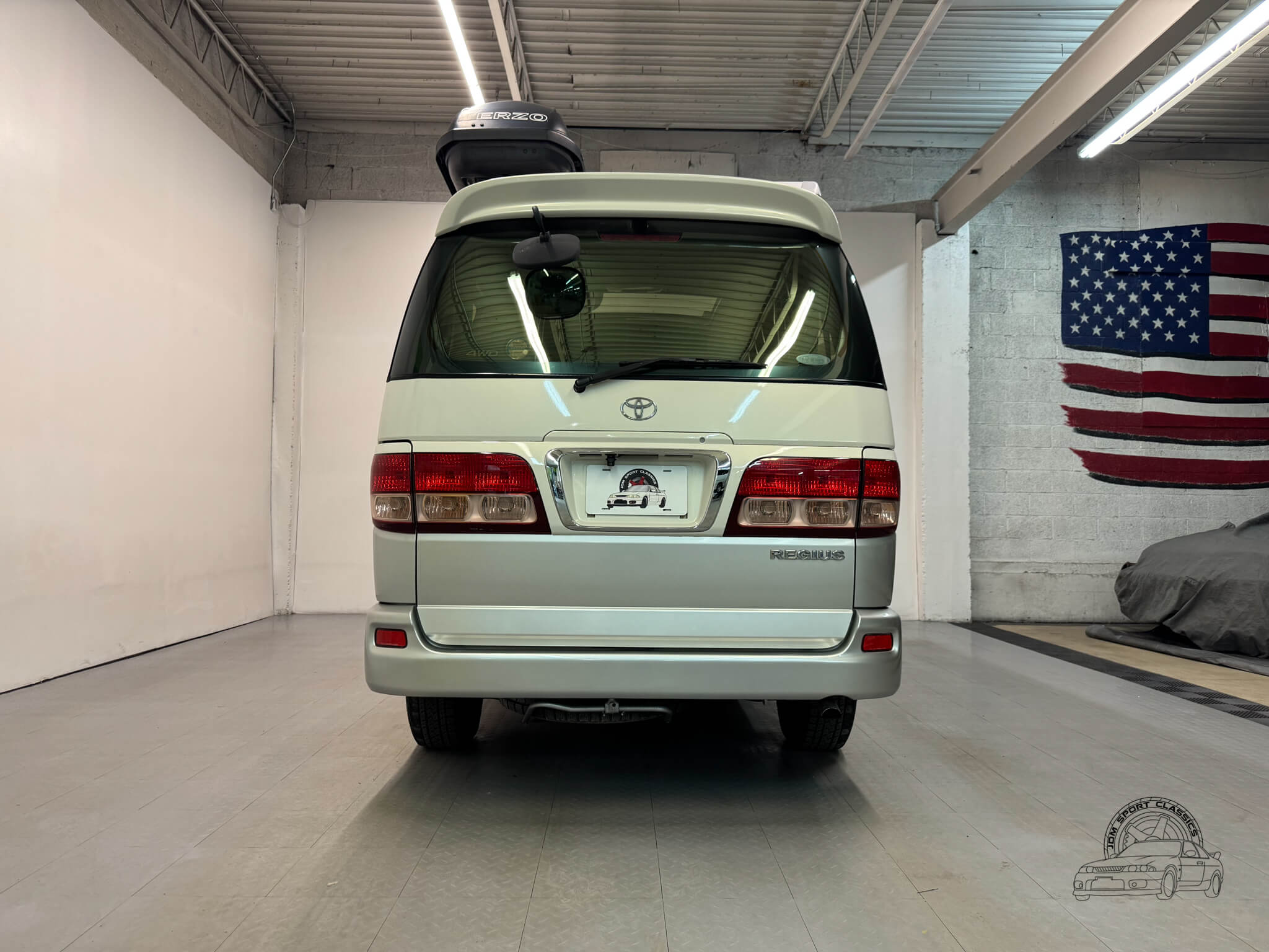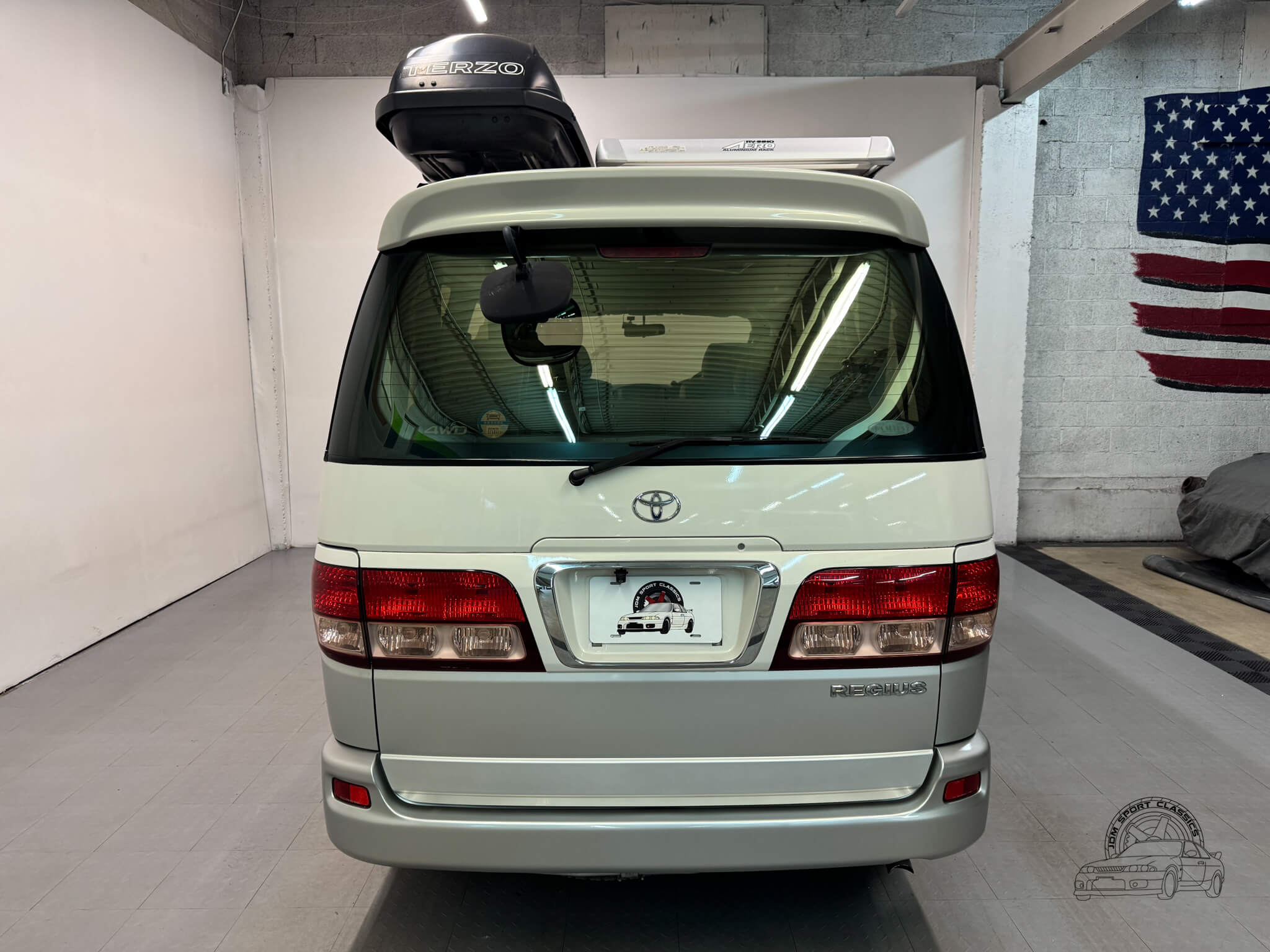 The exterior is finished in its original two-tone White Mica Pearl and Millennium Silver Metallic paint, which retains a deep shine and highlights the straight body panels. This Regius comes equipped with a functional Terzo roof rack system, featuring durable steel crossbars that provide a solid mounting point for gear. Mounted to these bars is a Team Terzo hardshell roof box, providing secure and weather protected storage, alongside an RV-Inno Aero aluminum rack designed for strapping down oversized equipment like camping crates or outdoor gear. The vehicle also features OEM rainguards, a rear parking mirror to assist with depth perception while reversing, and a full sized spare tire stowed safely underneath the chassis. The combination of the full-time 4WD and the expanded storage capacity makes this vehicle particularly well suited for extended trips and all weather use.