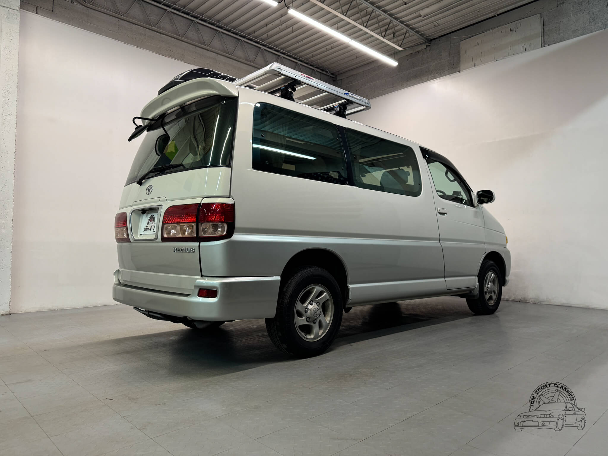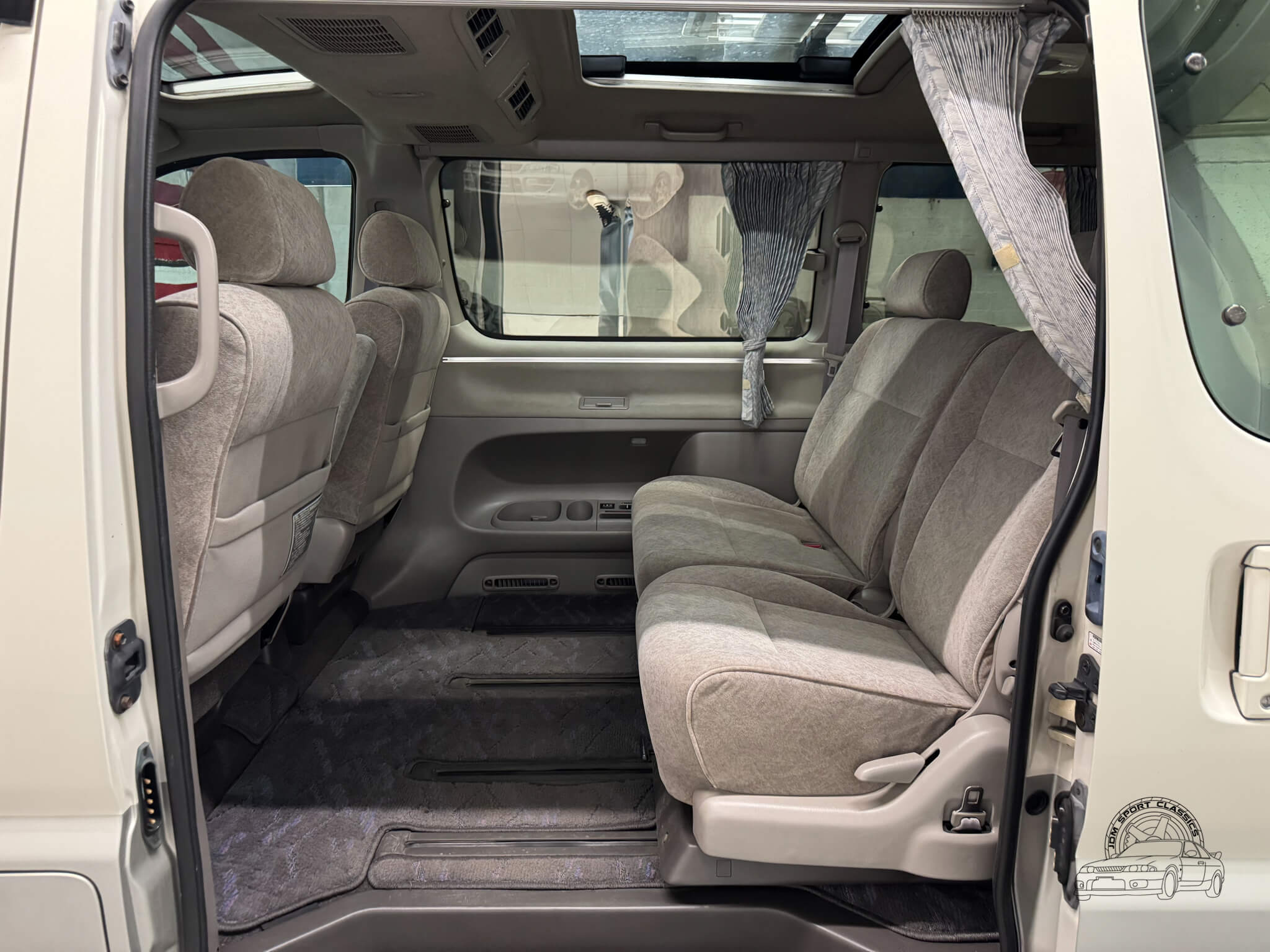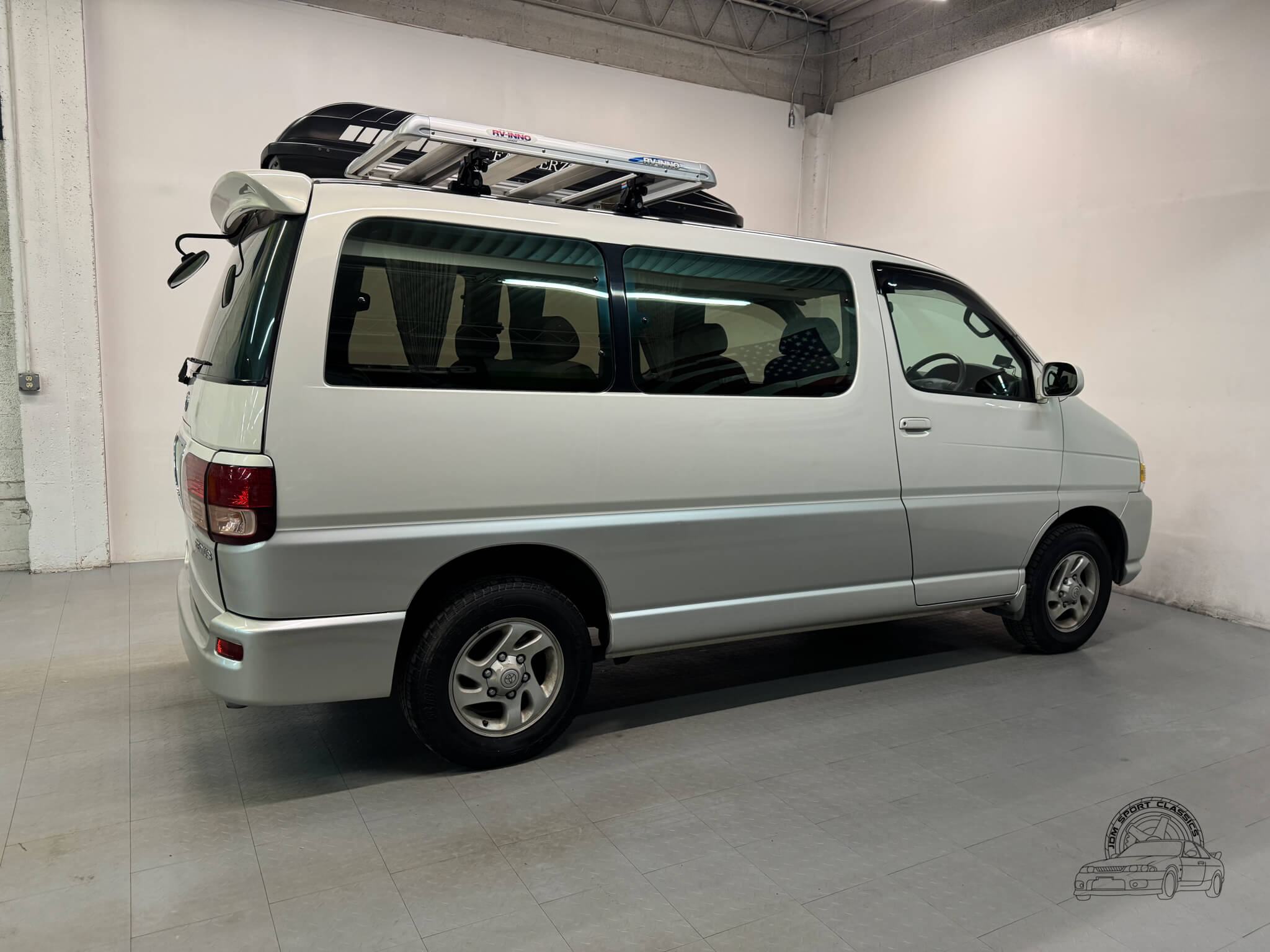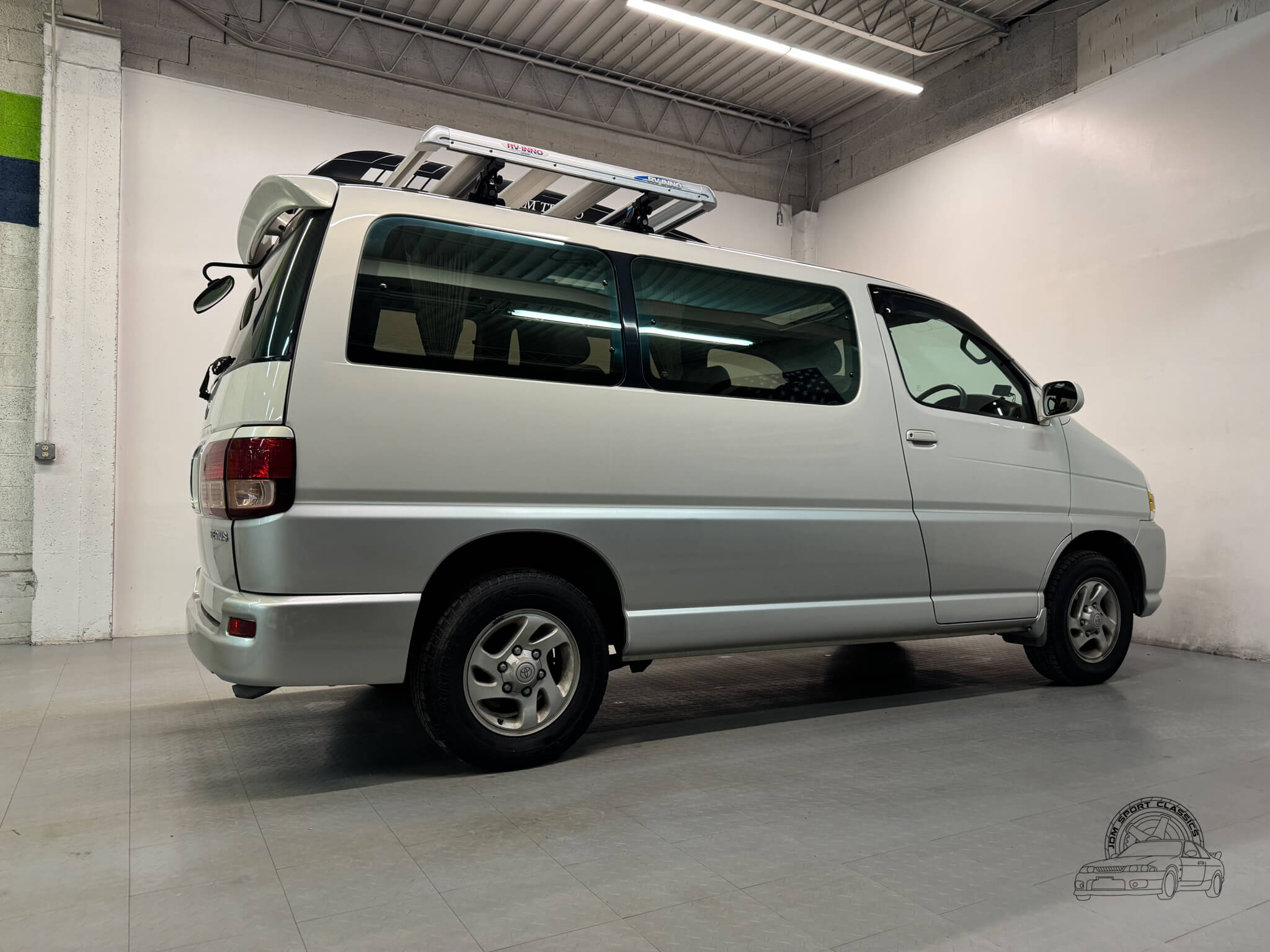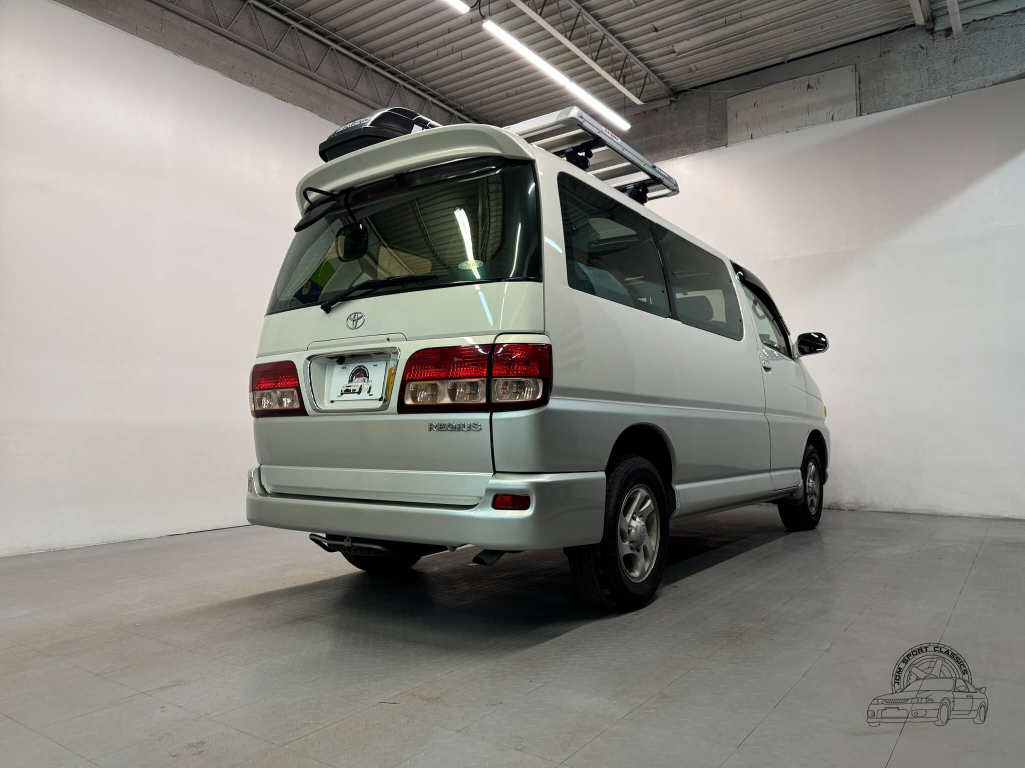 This 1999 Toyota Hiace Regius V L-Package offers a refined take on the traditional Hiace, combining the reliability of the Hiace line with enhanced interior comfort and a more aerodynamic shape. Unlike the typical cab-over model, the Regius features a front-mounted engine design that creates a flat floor, allowing for much easier movement between the front seats and the rear cabin. This 8-seater 4WD example has arrived with only 51,410 verified miles and is finished in a clean two-tone White Mica Pearl and Millennium Silver Metallic. Equipped with full-time 4WD and included rooftop accessories, it is a practical choice for those looking for a functional daily driver, a capable family hauler, or a comfortable foundation for a camping build.