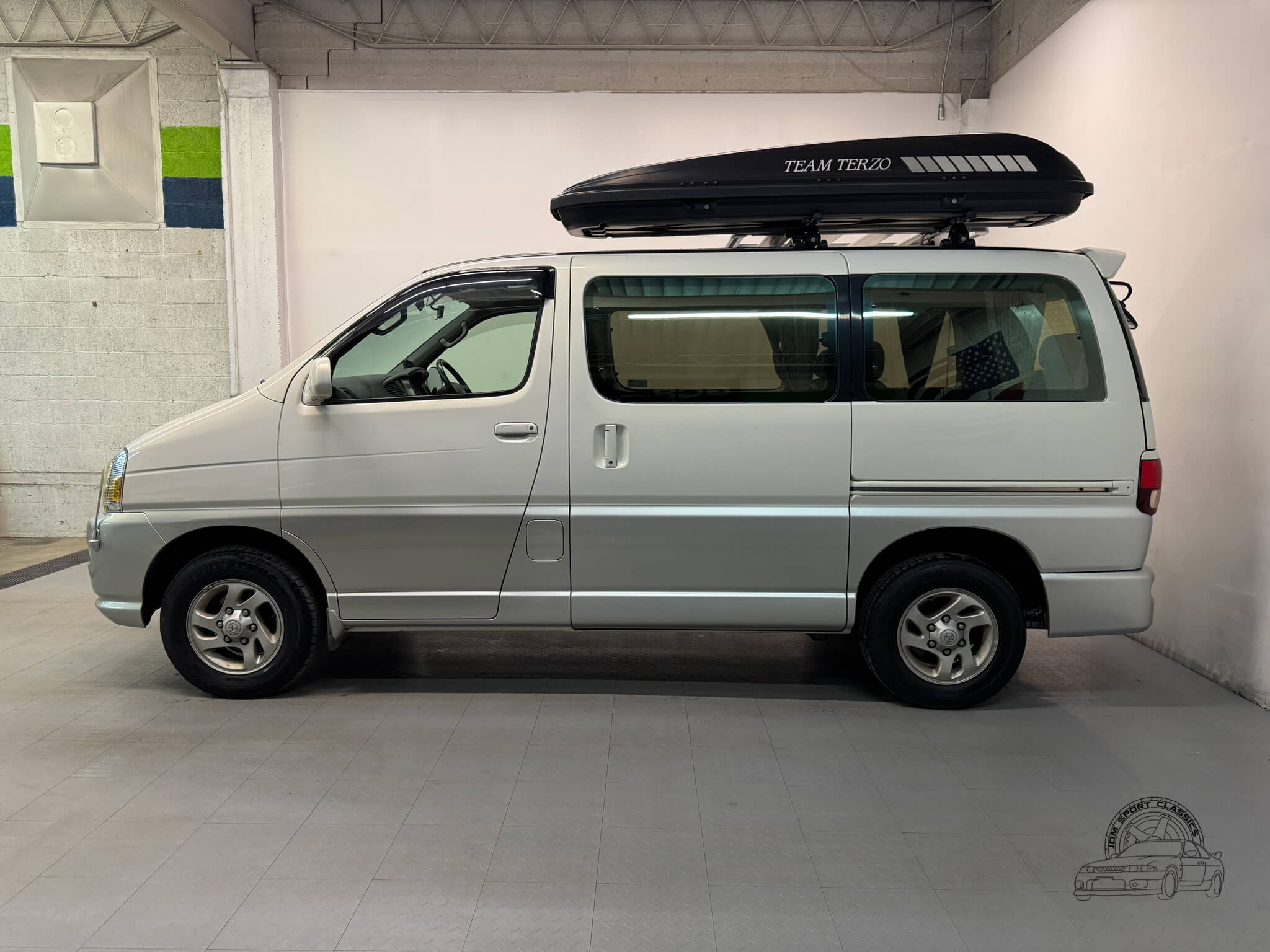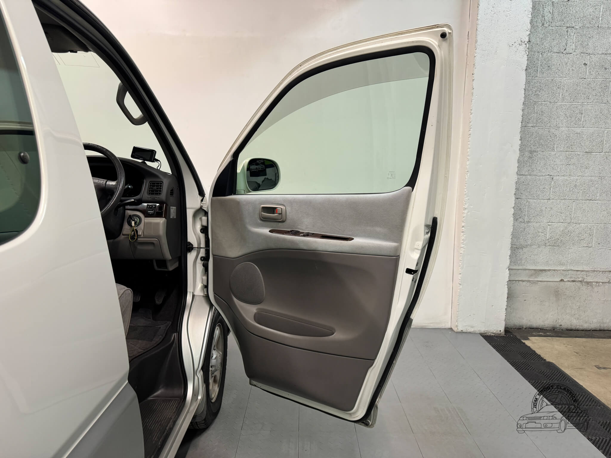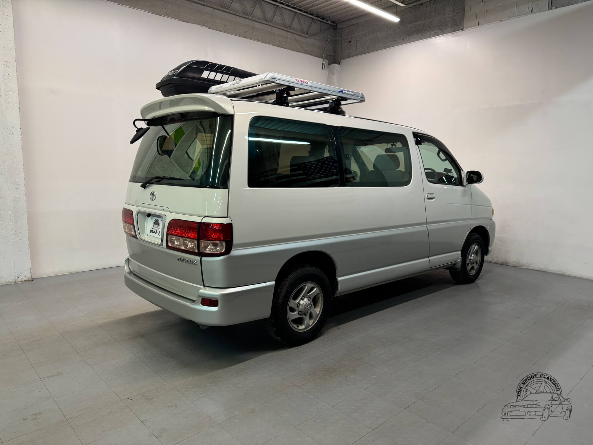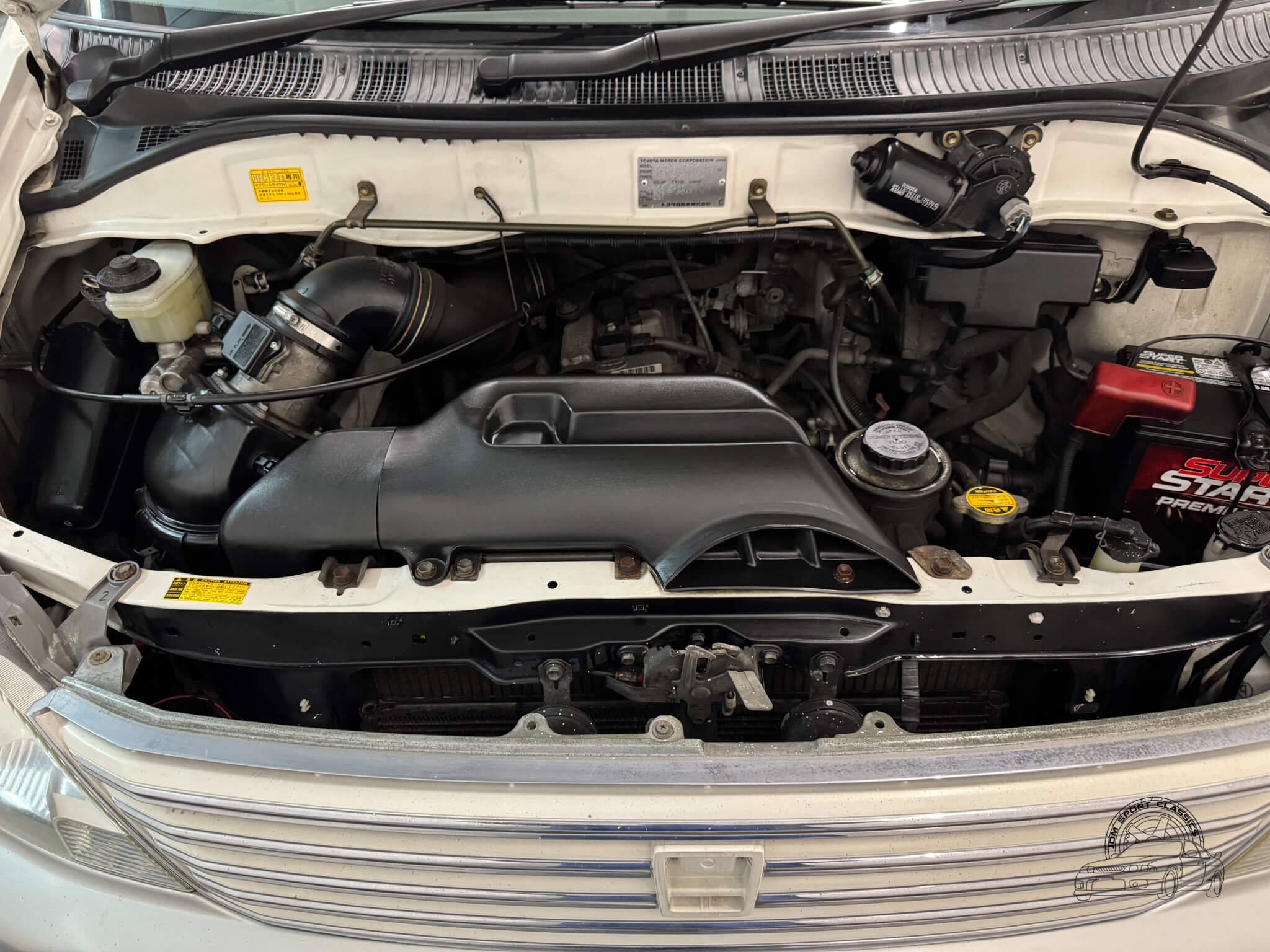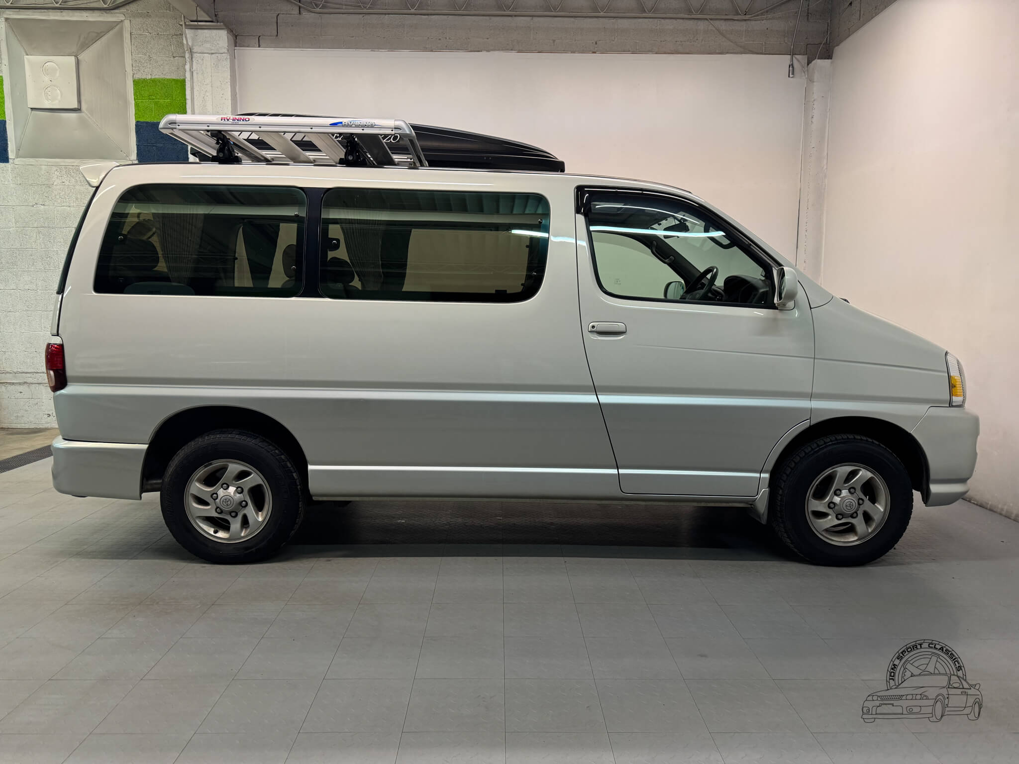 This 1999 Toyota Hiace Regius V L-Package offers a refined take on the traditional Hiace, combining the reliability of the Hiace line with enhanced interior comfort and a more aerodynamic shape. Unlike the typical cab-over model, the Regius features a front-mounted engine design that creates a flat floor, allowing for much easier movement between the front seats and the rear cabin. This 8-seater 4WD example has arrived with only 51,410 verified miles and is finished in a clean two-tone White Mica Pearl and Millennium Silver Metallic. Equipped with full-time 4WD and included rooftop accessories, it is a practical choice for those looking for a functional daily driver, a capable family hauler, or a comfortable foundation for a camping build.