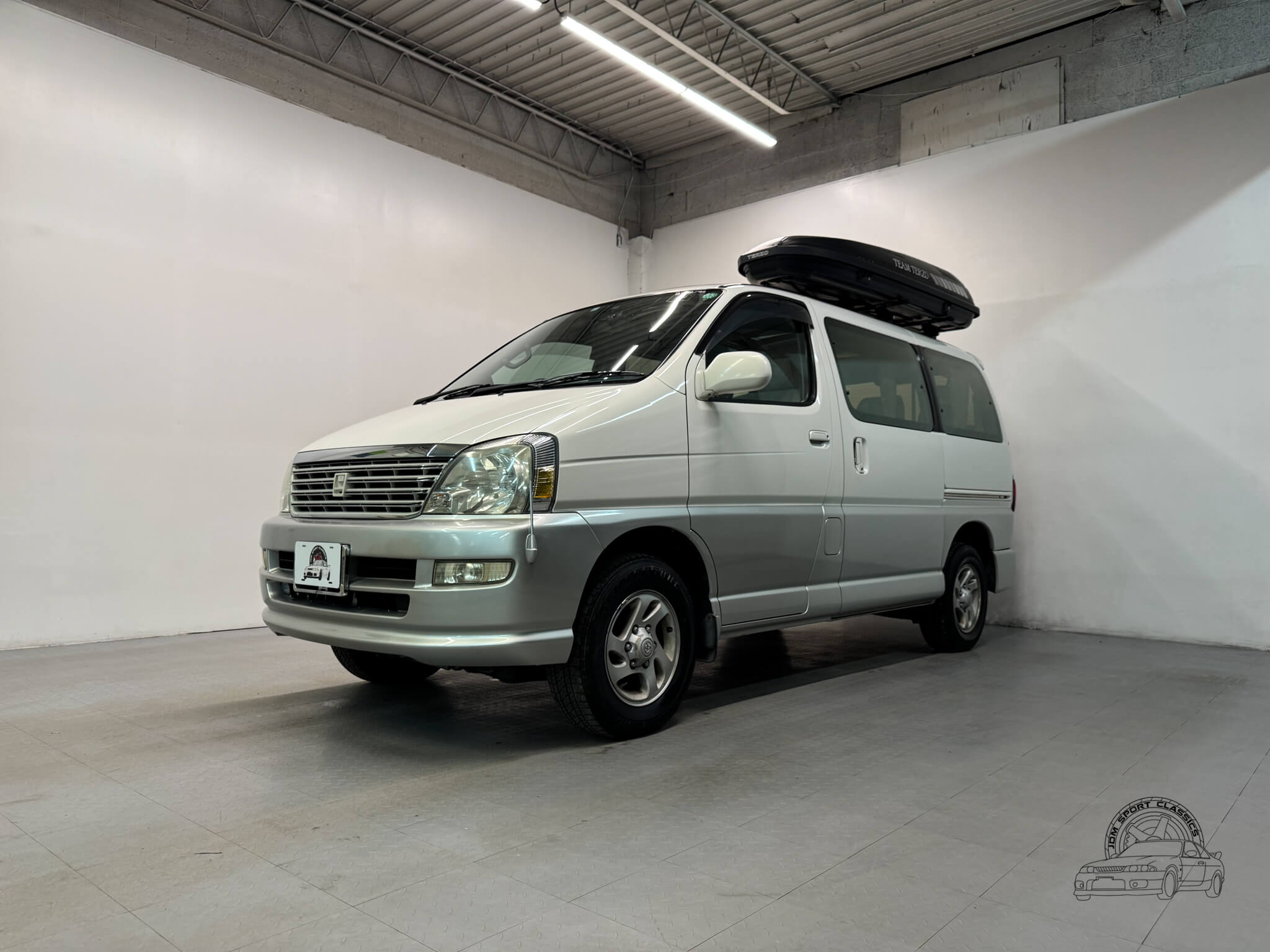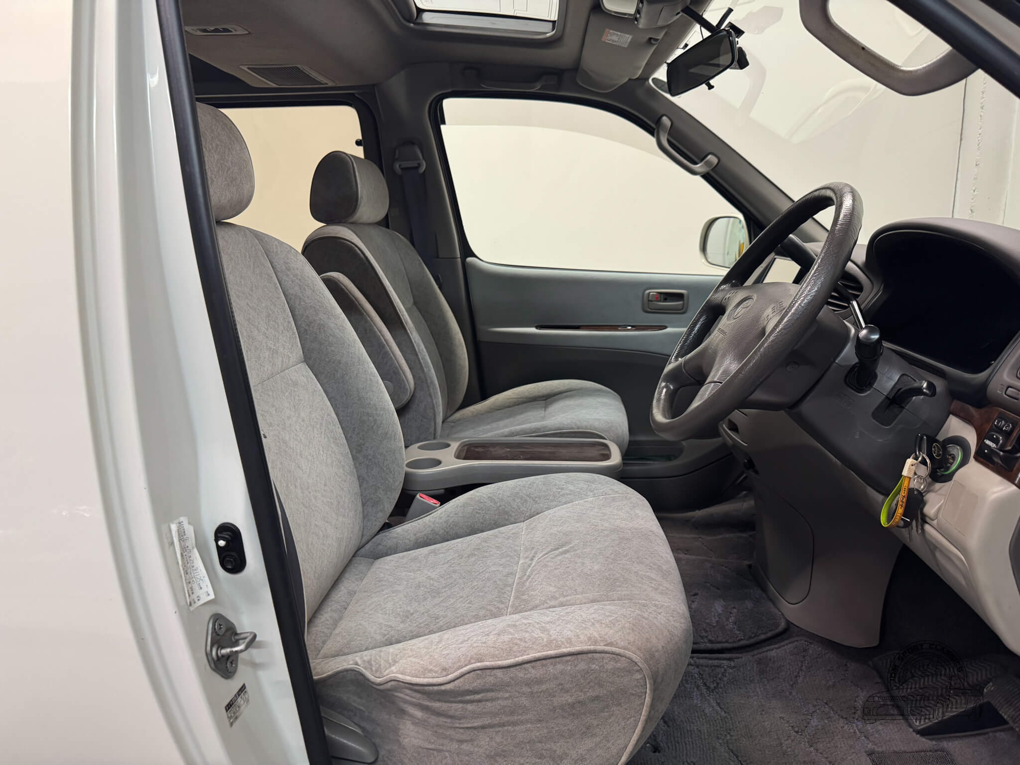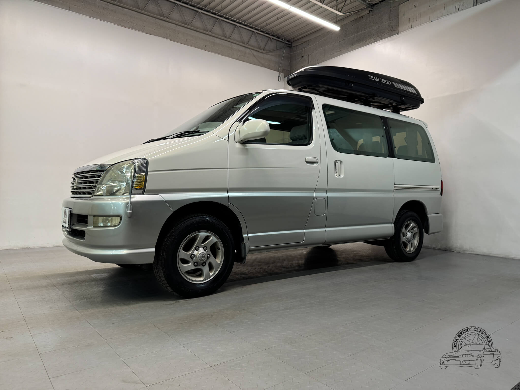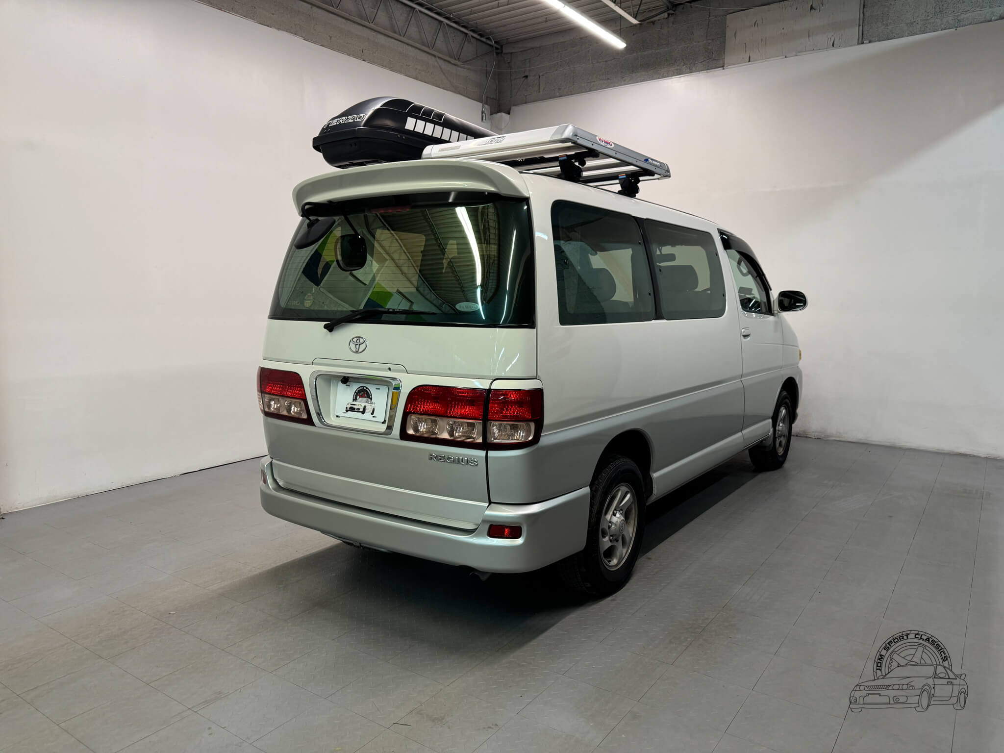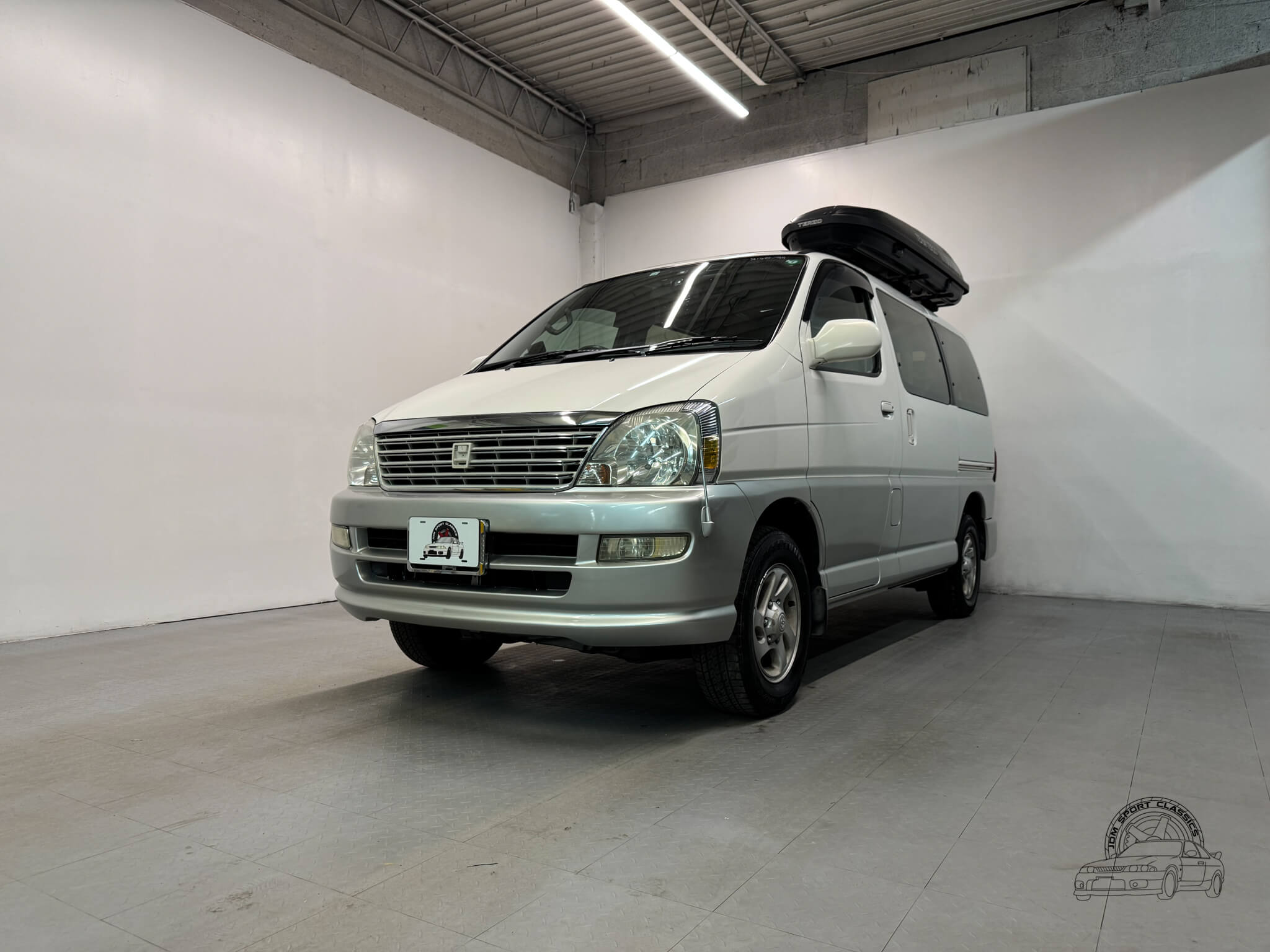 This 1999 Toyota Hiace Regius V L-Package offers a refined take on the traditional Hiace, combining the reliability of the Hiace line with enhanced interior comfort and a more aerodynamic shape. Unlike the typical cab-over model, the Regius features a front-mounted engine design that creates a flat floor, allowing for much easier movement between the front seats and the rear cabin. This 8-seater 4WD example has arrived with only 51,410 verified miles and is finished in a clean two-tone White Mica Pearl and Millennium Silver Metallic. Equipped with full-time 4WD and included rooftop accessories, it is a practical choice for those looking for a functional daily driver, a capable family hauler, or a comfortable foundation for a camping build.