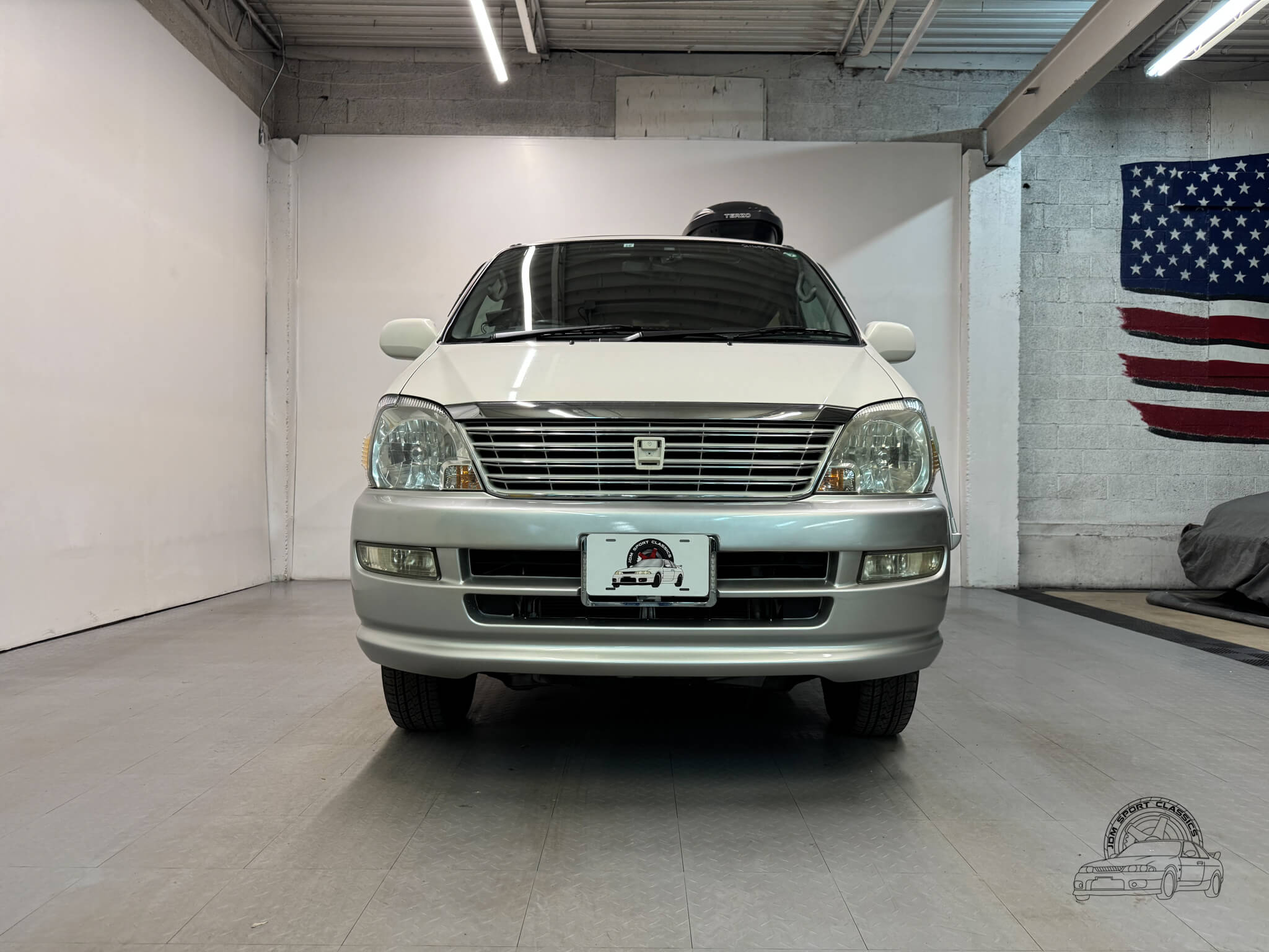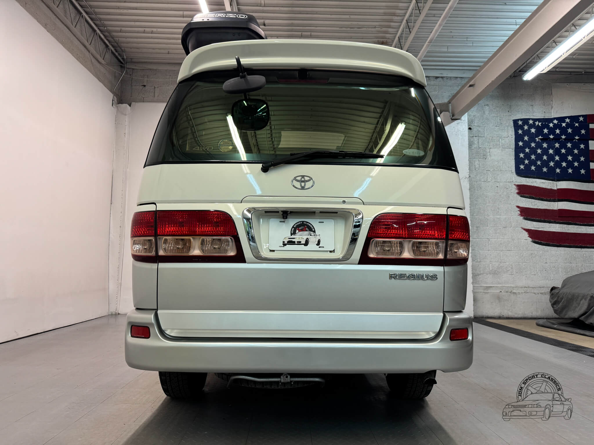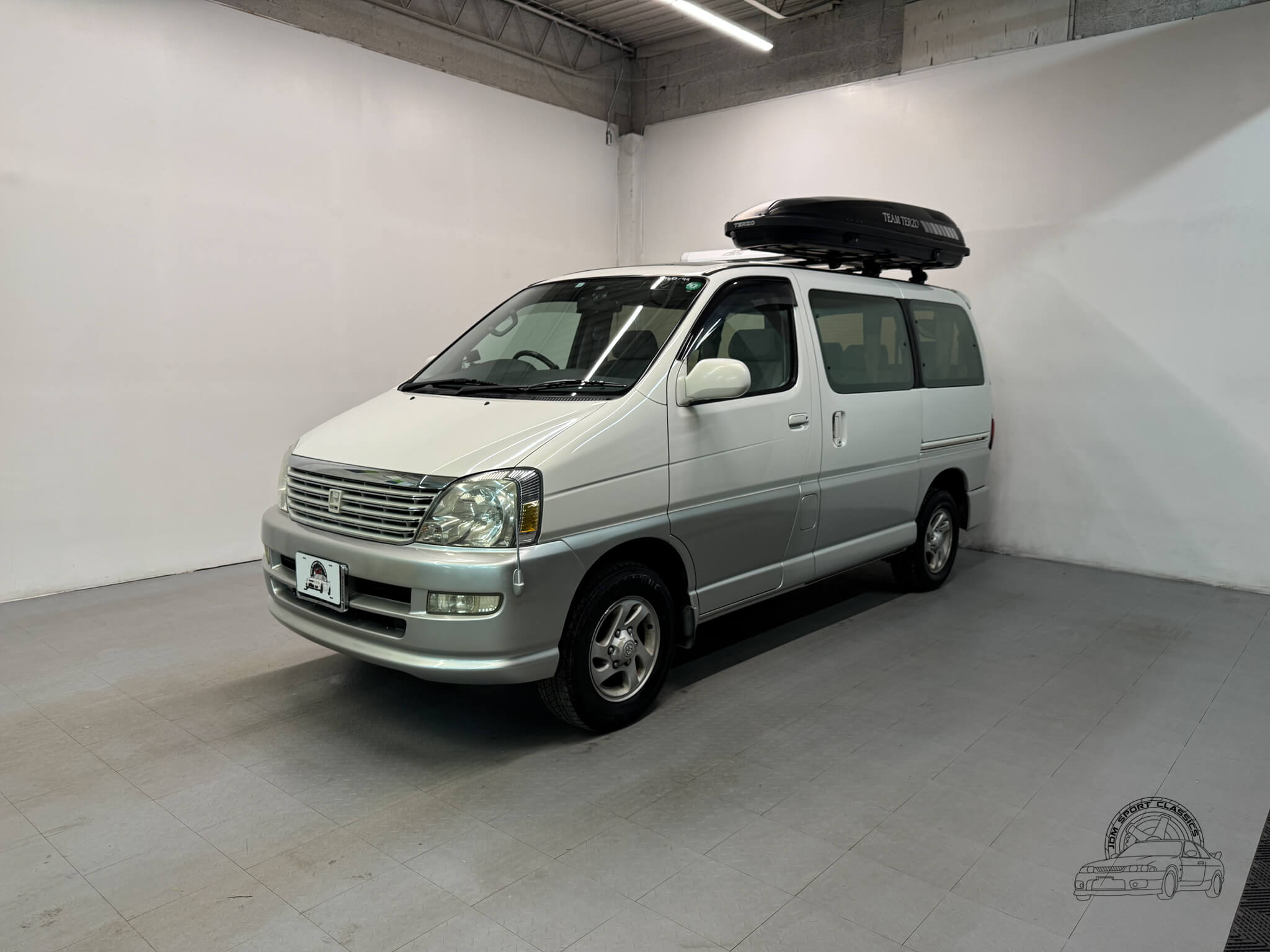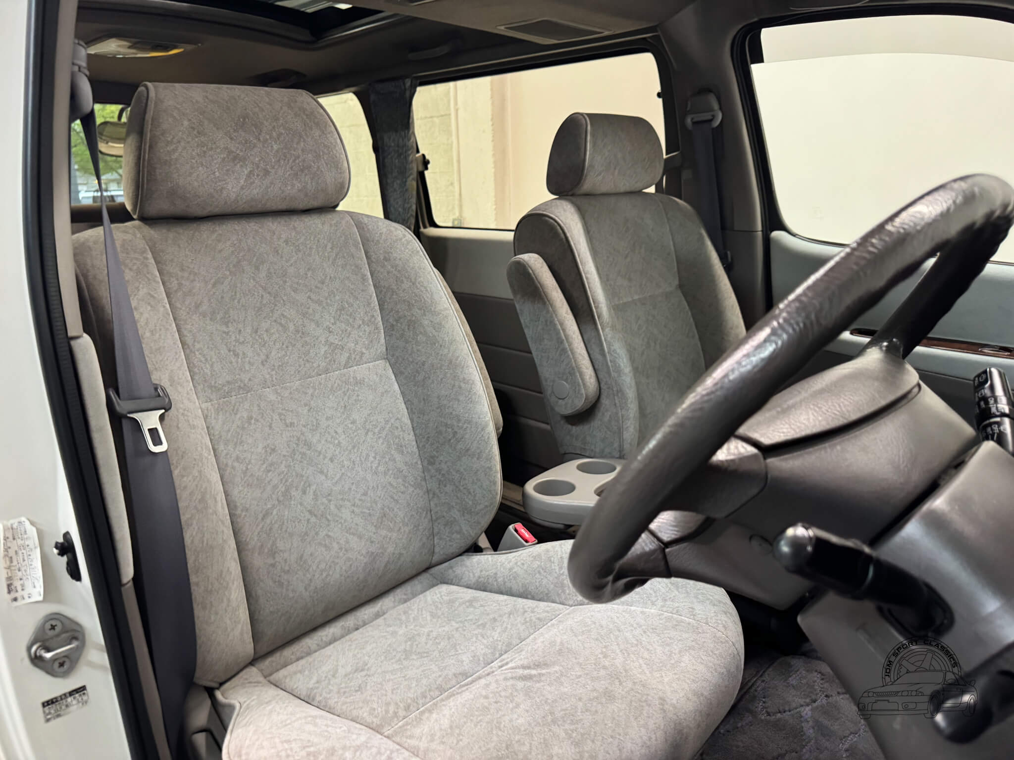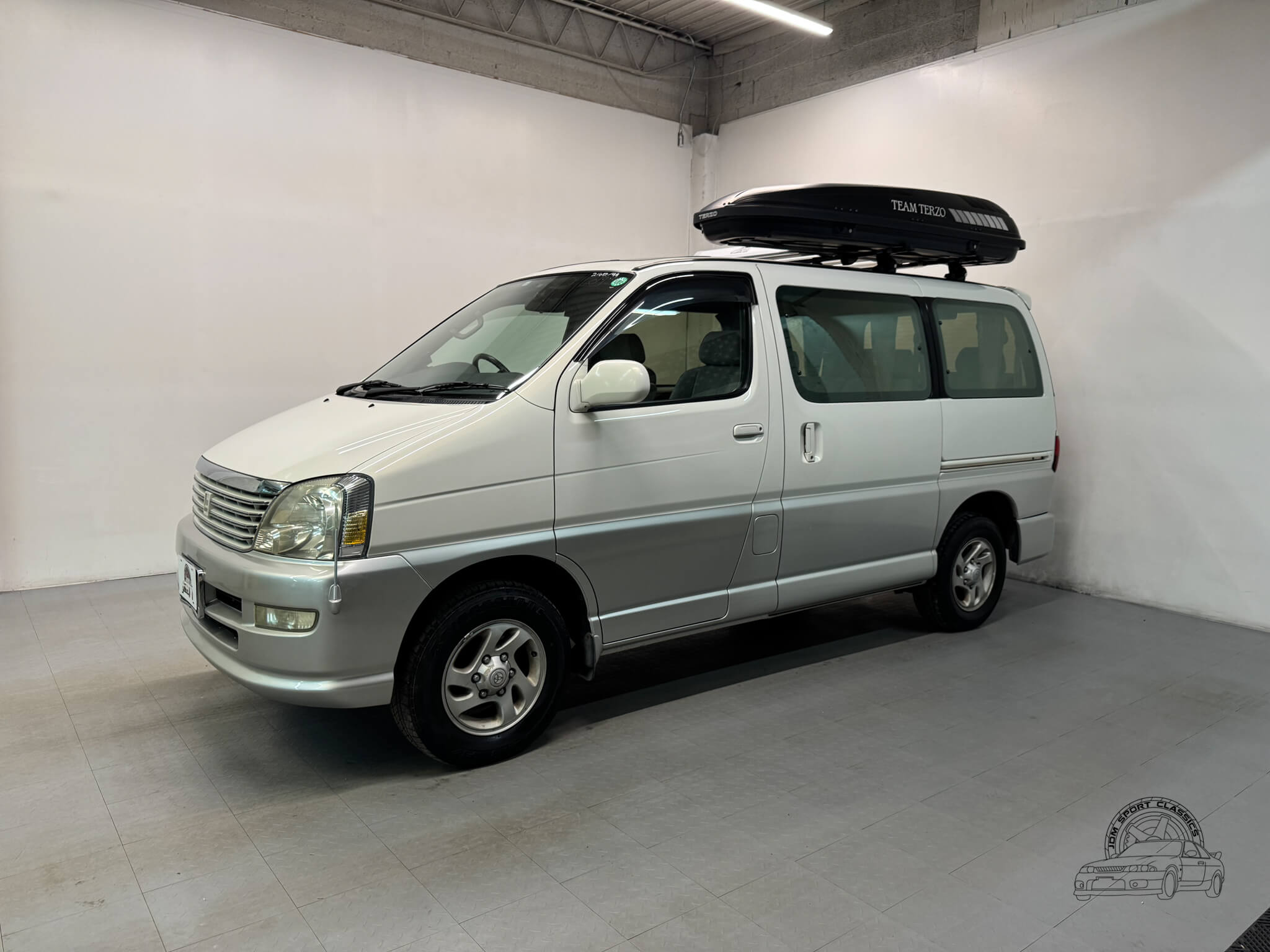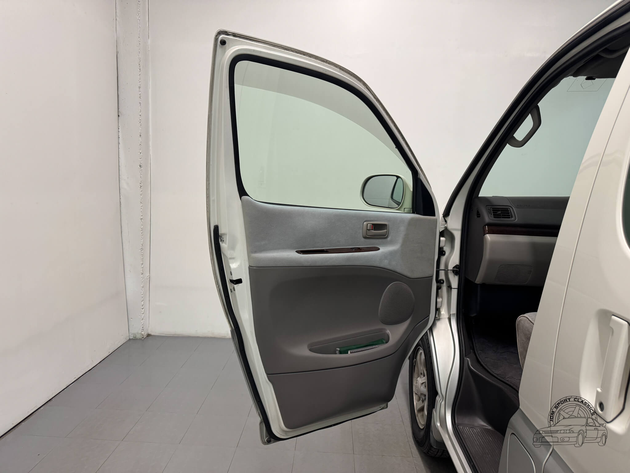 This 1999 Toyota Hiace Regius V L-Package offers a refined take on the traditional Hiace, combining the reliability of the Hiace line with enhanced interior comfort and a more aerodynamic shape. Unlike the typical cab-over model, the Regius features a front-mounted engine design that creates a flat floor, allowing for much easier movement between the front seats and the rear cabin. This 8-seater 4WD example has arrived with only 51,410 verified miles and is finished in a clean two-tone White Mica Pearl and Millennium Silver Metallic. Equipped with full-time 4WD and included rooftop accessories, it is a practical choice for those looking for a functional daily driver, a capable family hauler, or a comfortable foundation for a camping build.