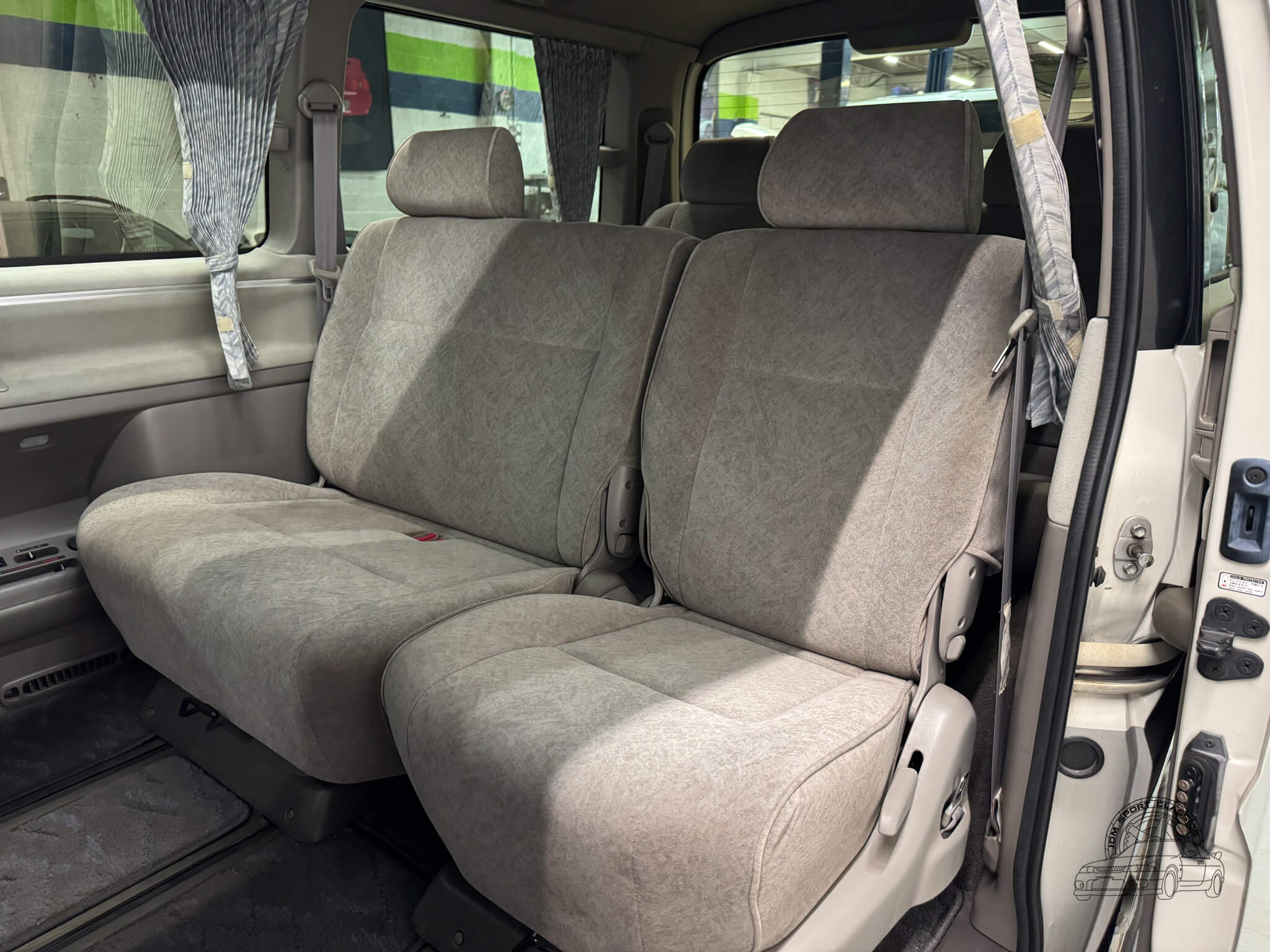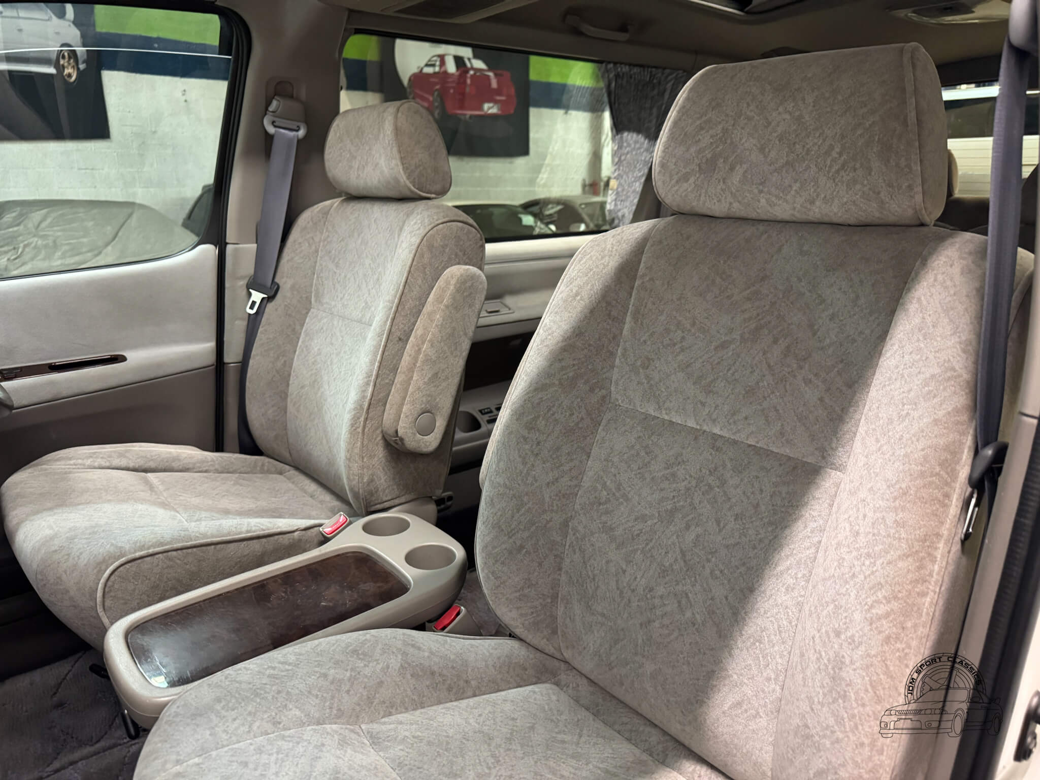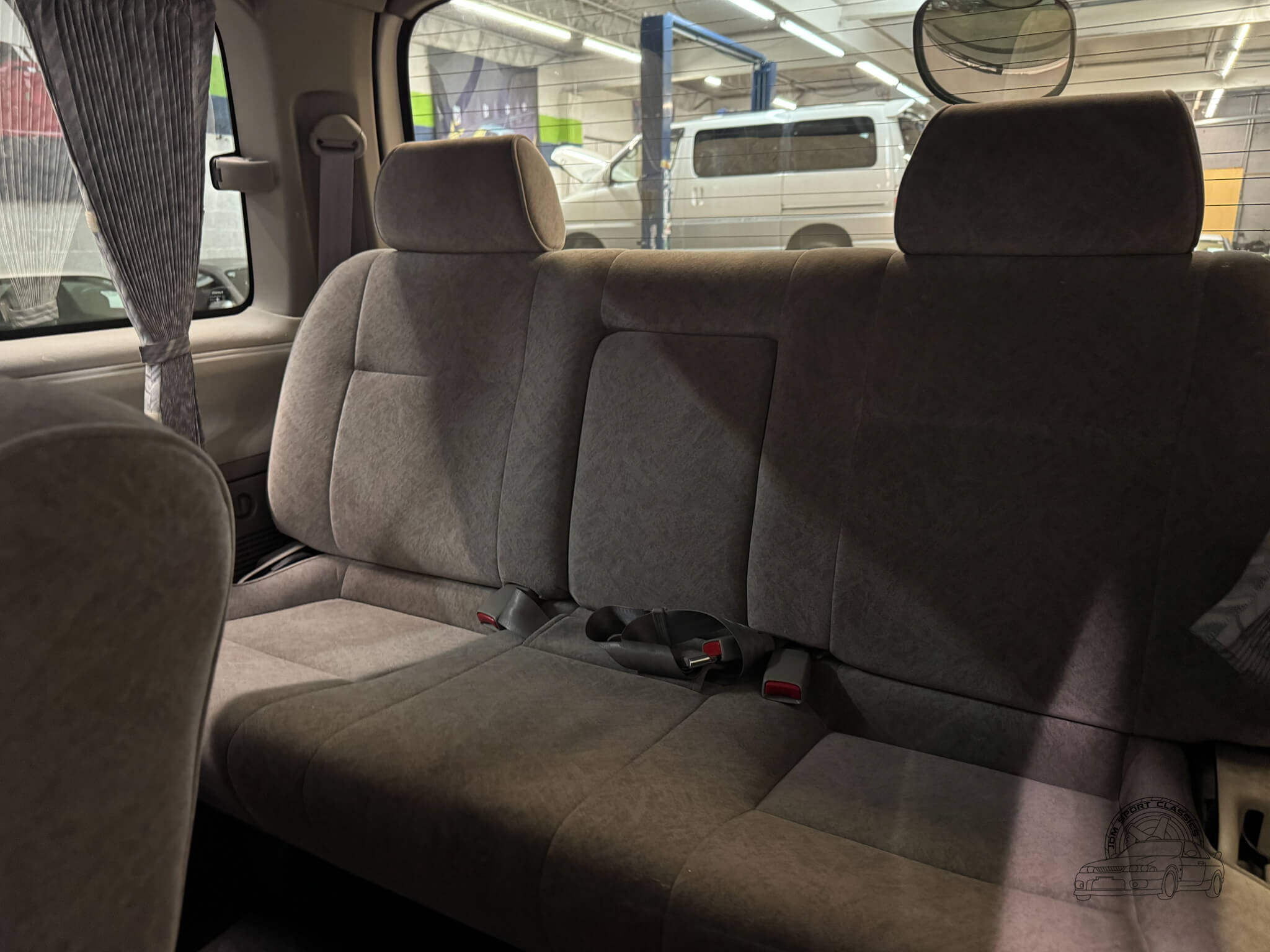 The interior of this Regius is what truly sets it apart, offering a level of versatility and social space that is hard to find in a standard van. The cabin is designed for an 8 passenger layout with gray cloth upholstery and wood grain trim throughout. The middle row features swivel seats that can rotate to face the rear passengers, creating what Toyota marketed as “Joyful Talk” or “Super Lounge” seating to emphasize the social aspect of the vehicle. When the backrest of the middle row is folded down, the molded plastic backing becomes a sturdy dining or work table with built in cupholders, while the second and third rows can fold completely flat to form a full size bed. This interior is equipped with a front manual sunroof and a power sliding rear moonroof, along with rear pop-out windows and privacy curtains for added comfort and privacy. Both front and rear occupants have access to climate control with cold AC and hot heat, complemented by multiple cupholders and a center console tray that can be folded down. Driver conveniences include a reversing camera, power windows, power locks, and power folding and adjusting mirrors. Because of the front mounted engine design, the flat floor allows for much easier movement throughout the interior, making this a highly functional space for travel.