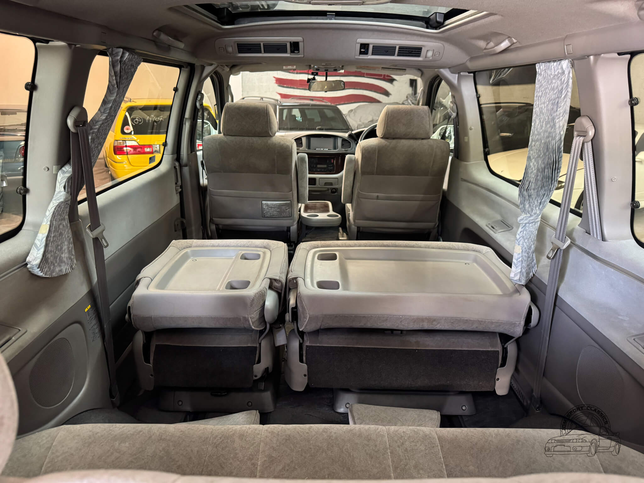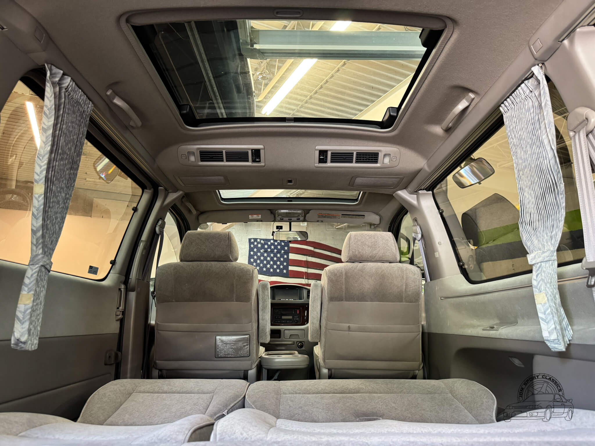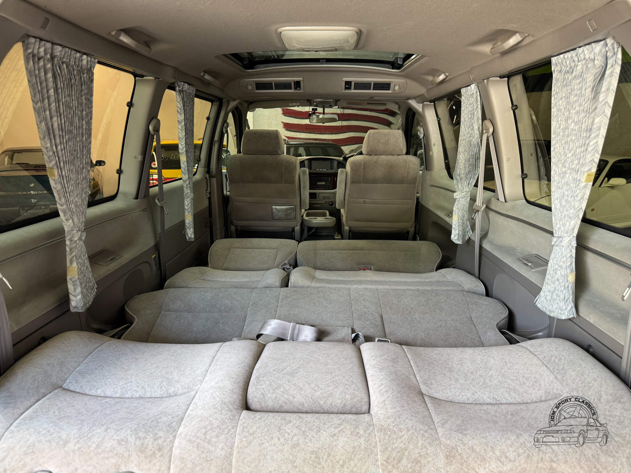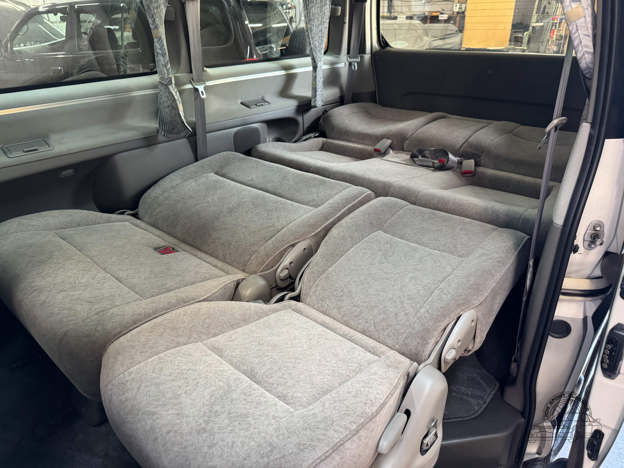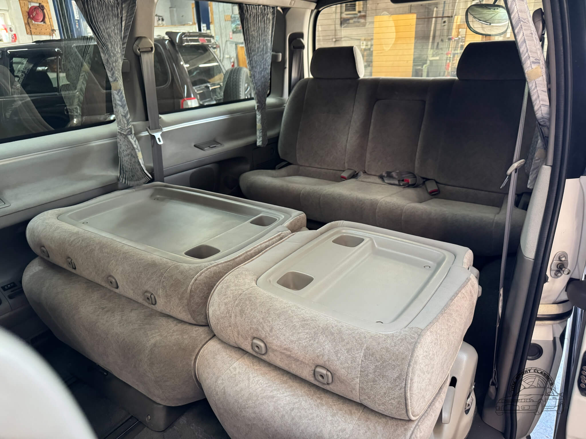 The interior of this Regius is what truly sets it apart, offering a level of versatility and social space that is hard to find in a standard van. The cabin is designed for an 8 passenger layout with gray cloth upholstery and wood grain trim throughout. The middle row features swivel seats that can rotate to face the rear passengers, creating what Toyota marketed as “Joyful Talk” or “Super Lounge” seating to emphasize the social aspect of the vehicle. When the backrest of the middle row is folded down, the molded plastic backing becomes a sturdy dining or work table with built in cupholders, while the second and third rows can fold completely flat to form a full size bed. This interior is equipped with a front manual sunroof and a power sliding rear moonroof, along with rear pop-out windows and privacy curtains for added comfort and privacy. Both front and rear occupants have access to climate control with cold AC and hot heat, complemented by multiple cupholders and a center console tray that can be folded down. Driver conveniences include a reversing camera, power windows, power locks, and power folding and adjusting mirrors. Because of the front mounted engine design, the flat floor allows for much easier movement throughout the interior, making this a highly functional space for travel.