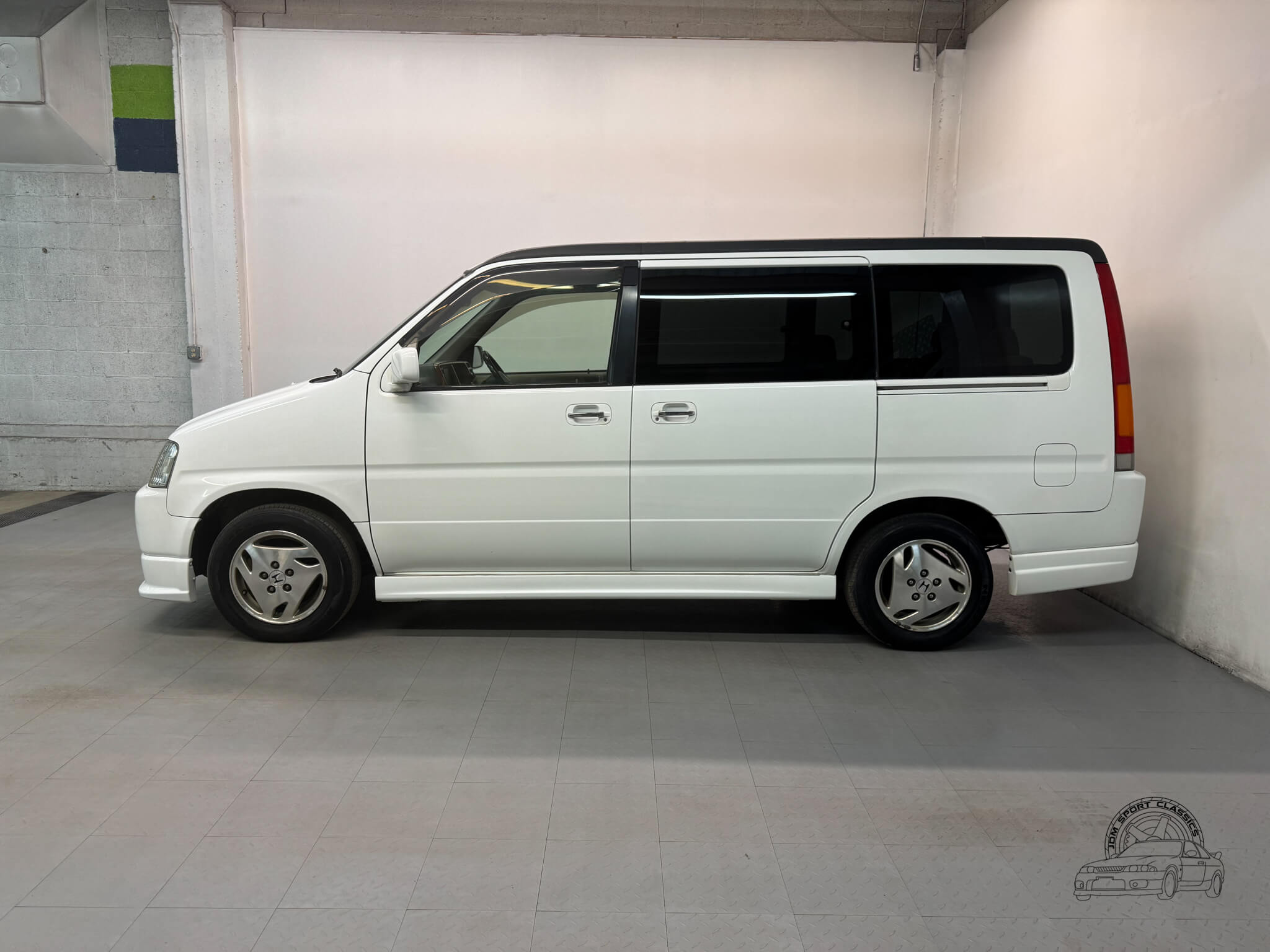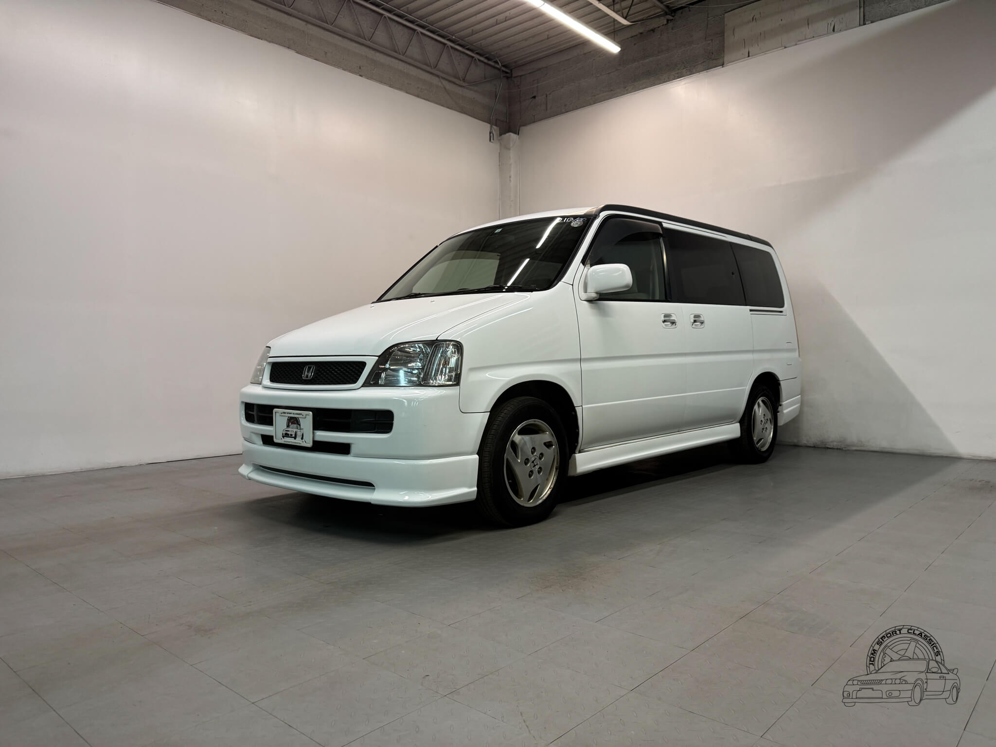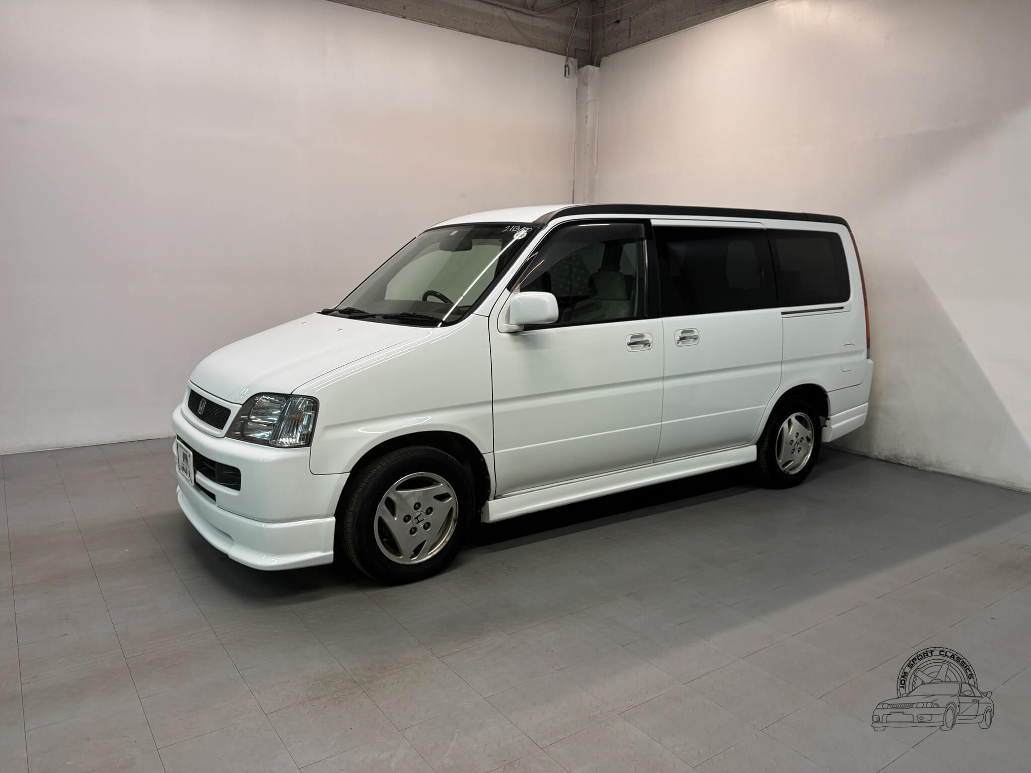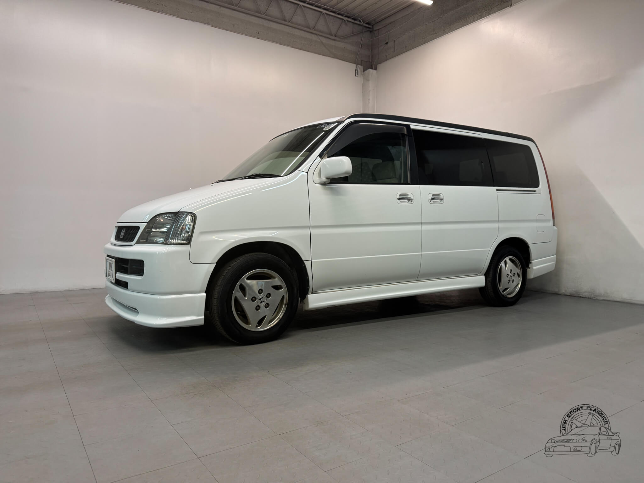 The exterior is finished in Taffeta White (Color Code NH578) and features the factory aero kit, which includes a front lip, side skirts, and rear bumper spats that give the van a more aggressive look. This StepWgn retains its original five spoke alloy wheels and factory rainguards, maintaining a clean OEM look. The body lines are straight, and the Taffeta White paint highlights the classic styling of the RF1 chassis. Tinted rear windows offer additional privacy and complement the factory aero components.