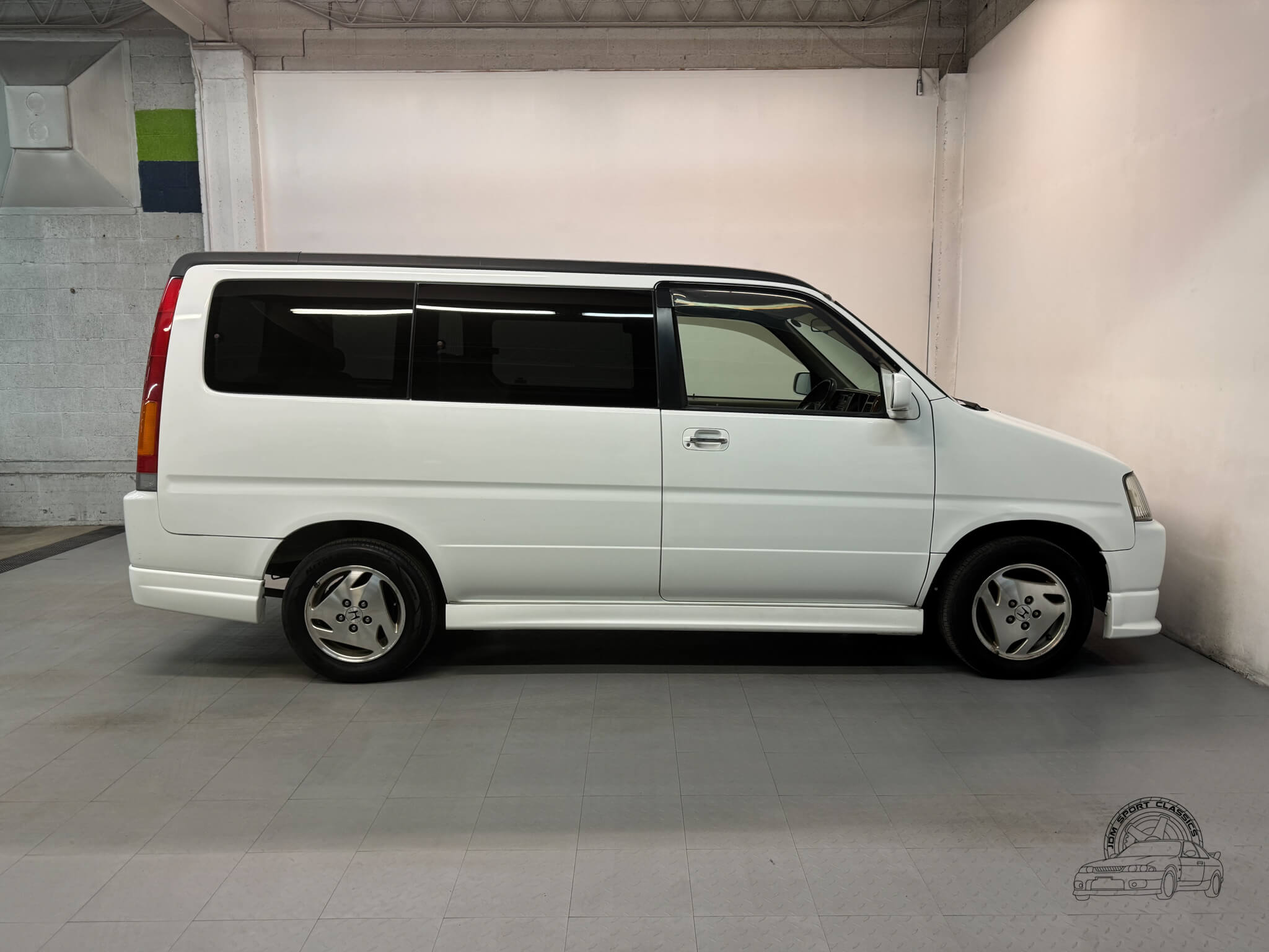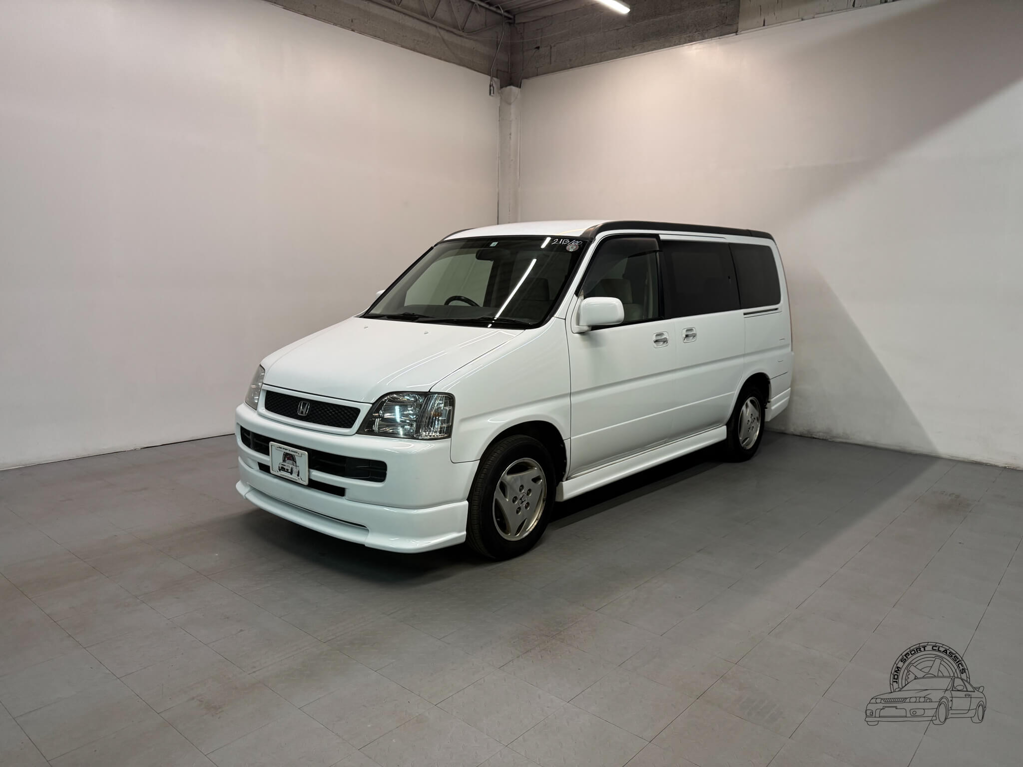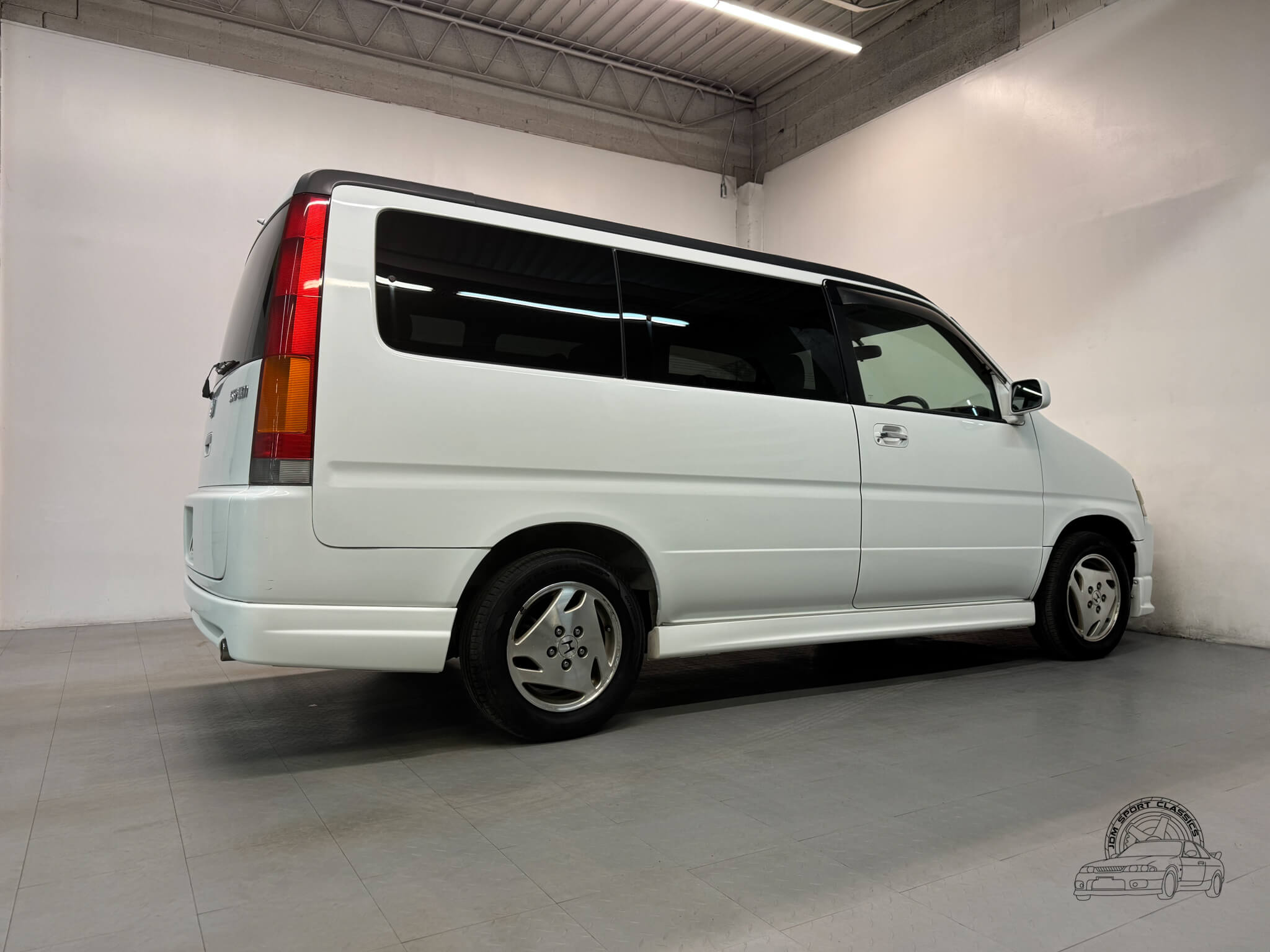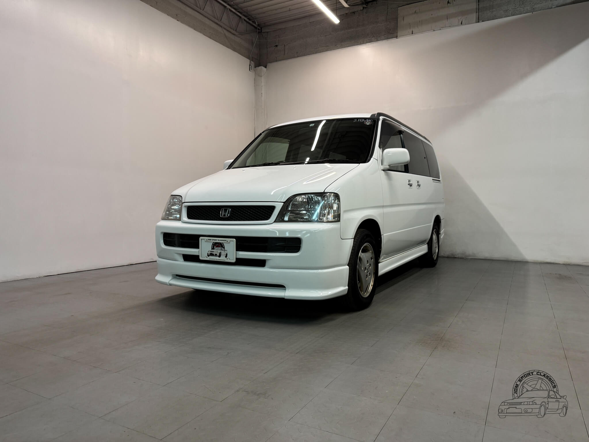 The exterior is finished in Taffeta White (Color Code NH578) and features the factory aero kit, which includes a front lip, side skirts, and rear bumper spats that give the van a more aggressive look. This StepWgn retains its original five spoke alloy wheels and factory rainguards, maintaining a clean OEM look. The body lines are straight, and the Taffeta White paint highlights the classic styling of the RF1 chassis. Tinted rear windows offer additional privacy and complement the factory aero components.