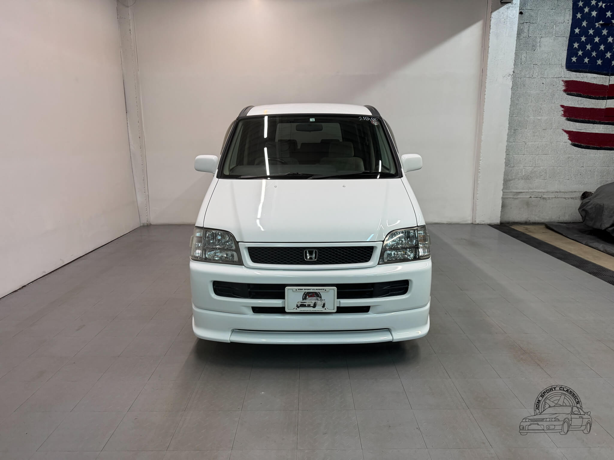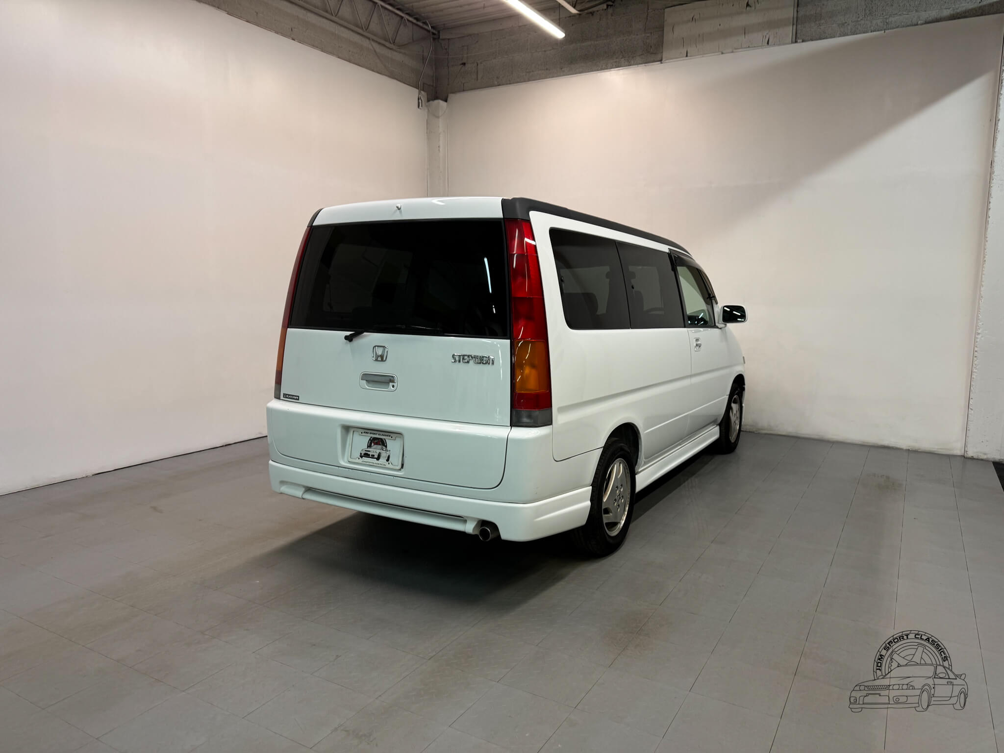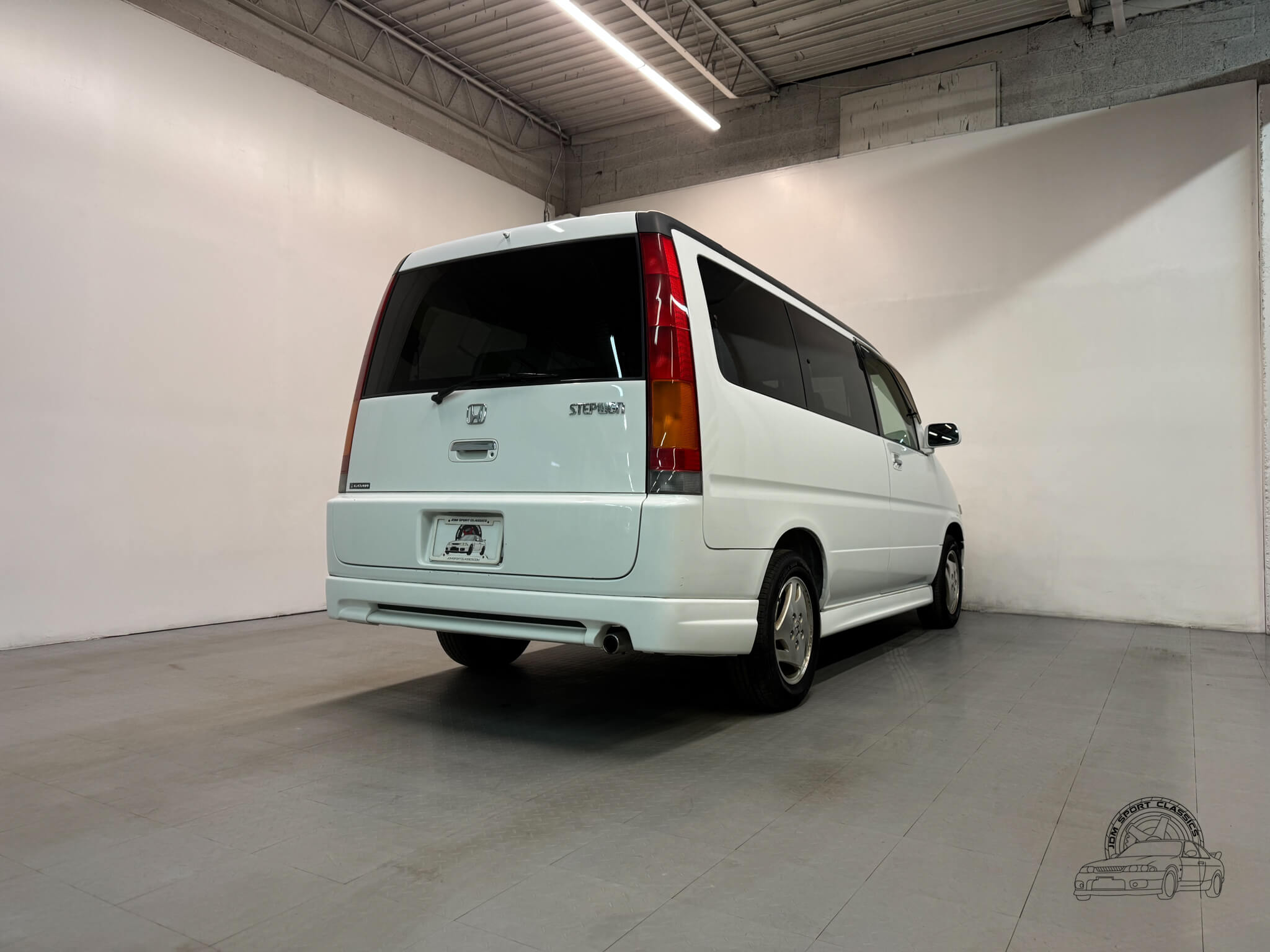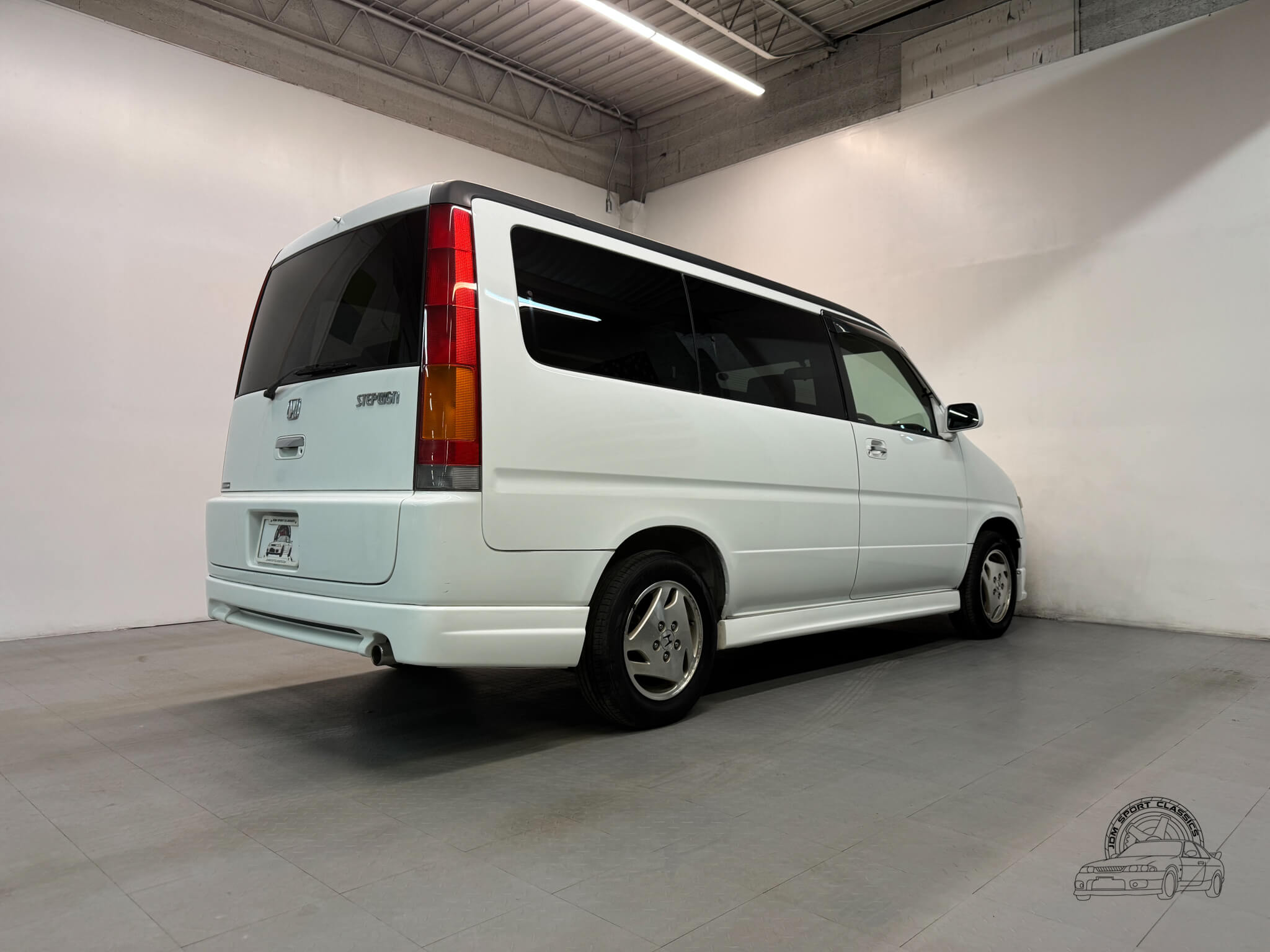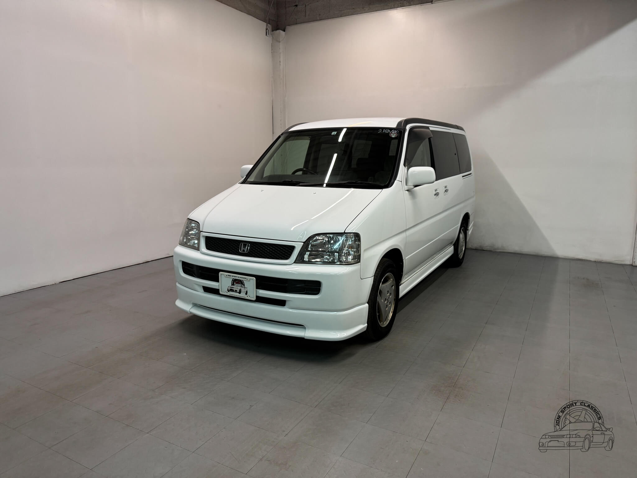 The exterior is finished in Taffeta White (Color Code NH578) and features the factory aero kit, which includes a front lip, side skirts, and rear bumper spats that give the van a more aggressive look. This StepWgn retains its original five spoke alloy wheels and factory rainguards, maintaining a clean OEM look. The body lines are straight, and the Taffeta White paint highlights the classic styling of the RF1 chassis. Tinted rear windows offer additional privacy and complement the factory aero components.