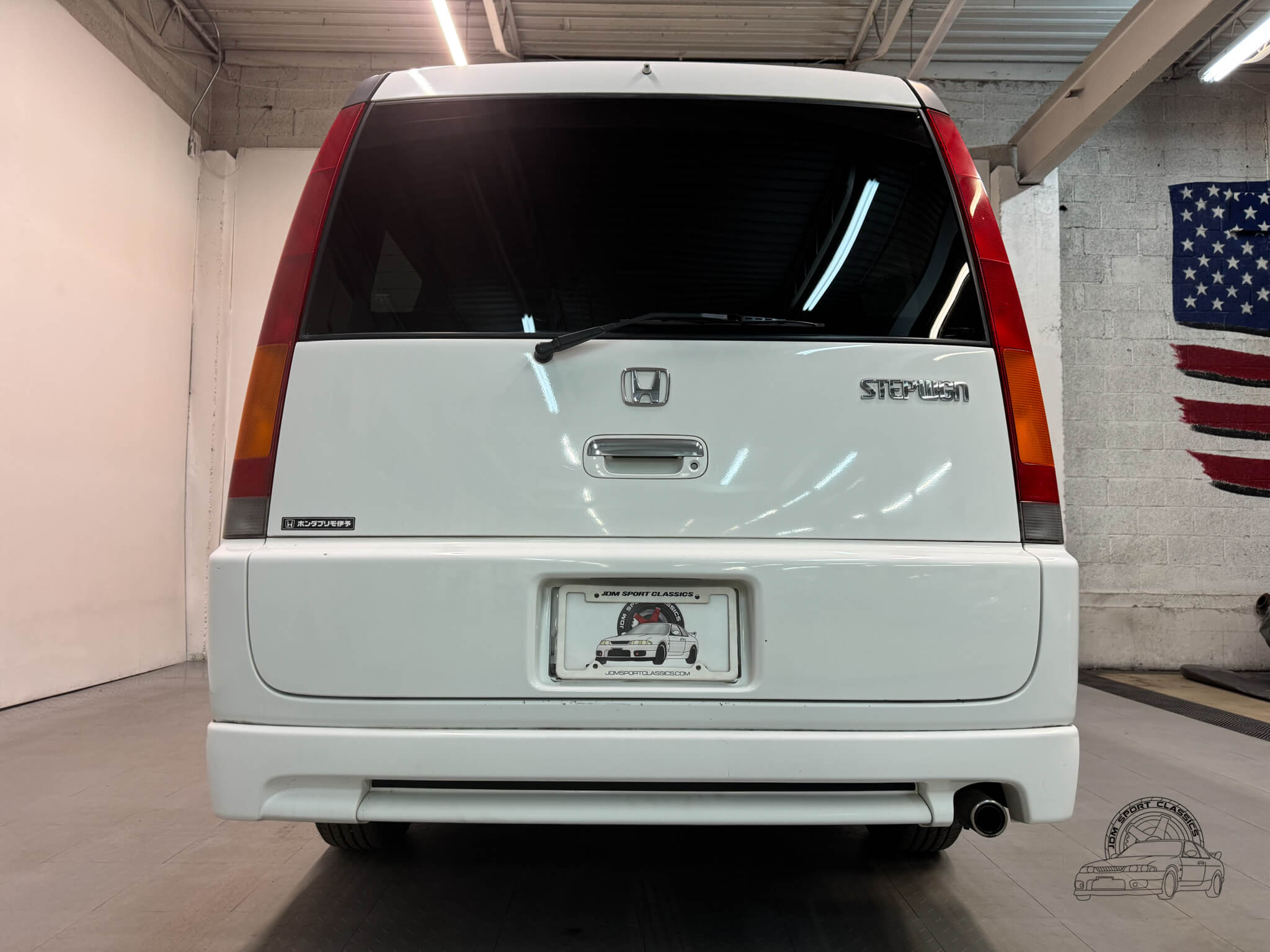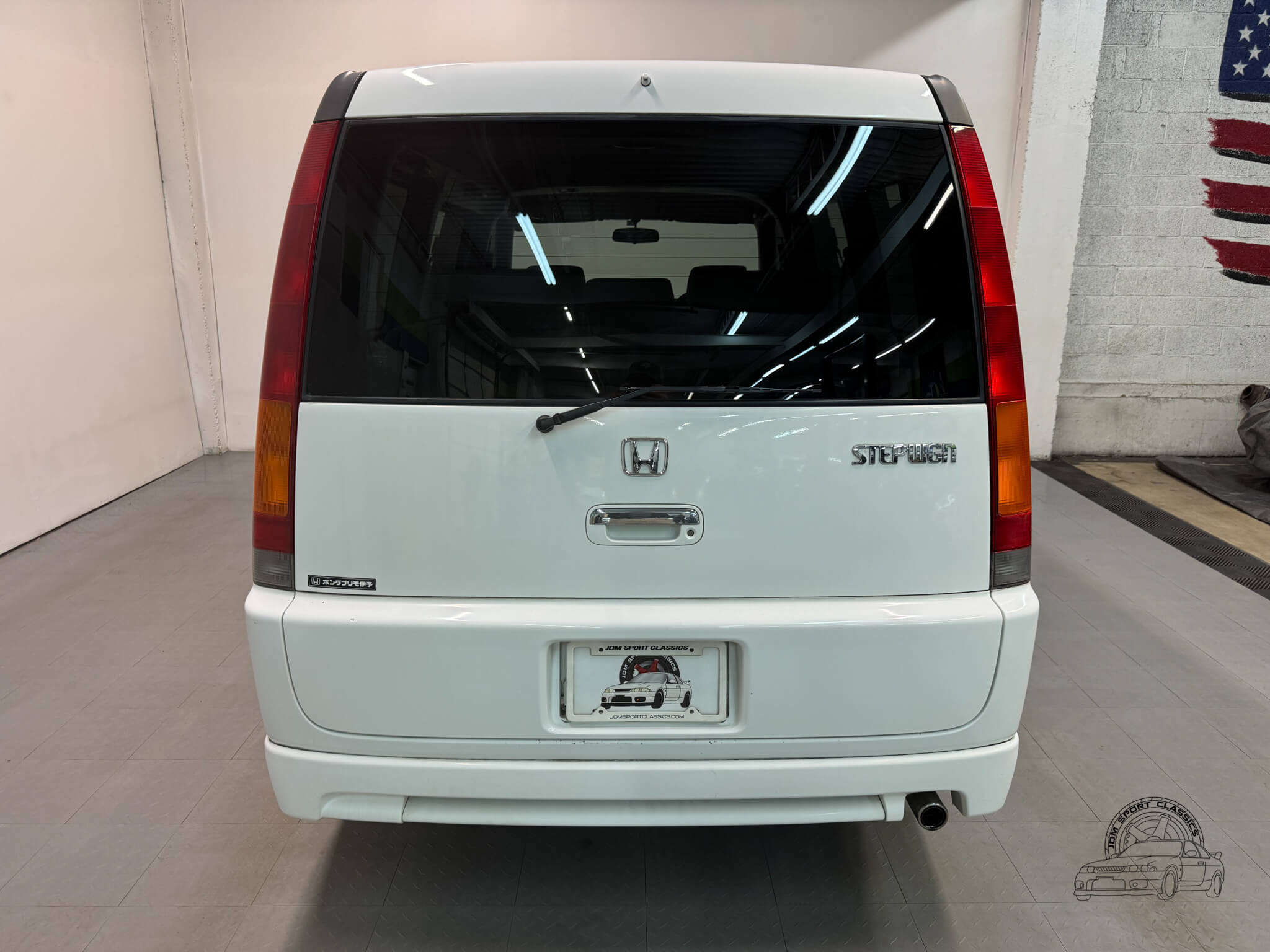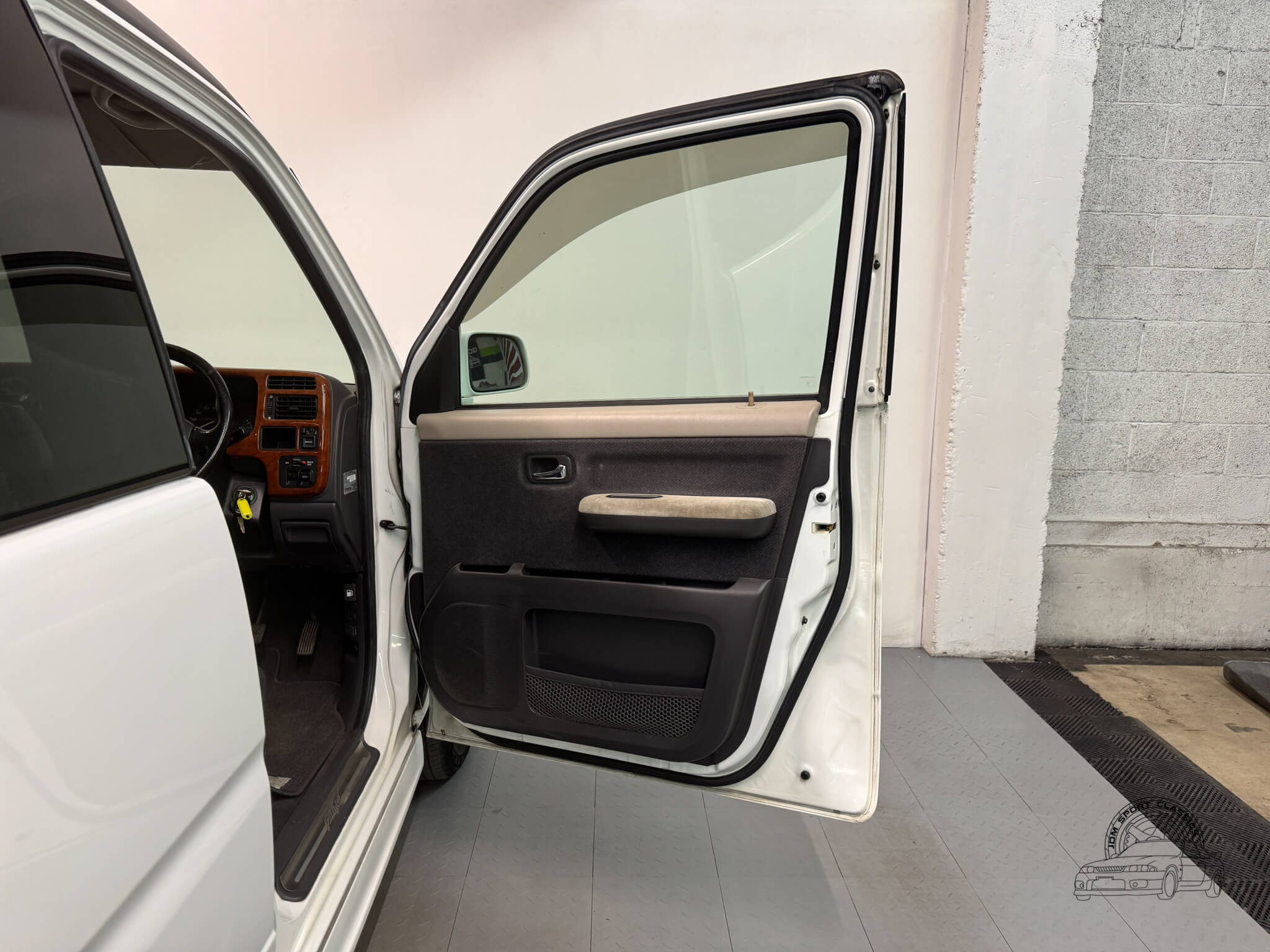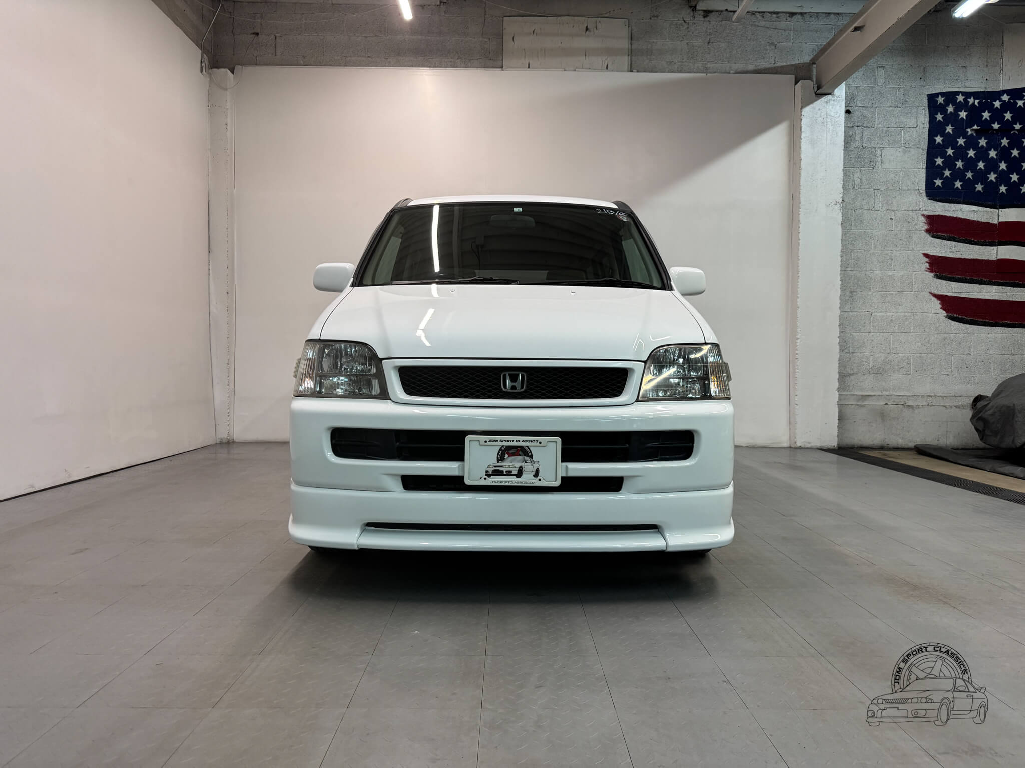 The exterior is finished in Taffeta White (Color Code NH578) and features the factory aero kit, which includes a front lip, side skirts, and rear bumper spats that give the van a more aggressive look. This StepWgn retains its original five spoke alloy wheels and factory rainguards, maintaining a clean OEM look. The body lines are straight, and the Taffeta White paint highlights the classic styling of the RF1 chassis. Tinted rear windows offer additional privacy and complement the factory aero components.