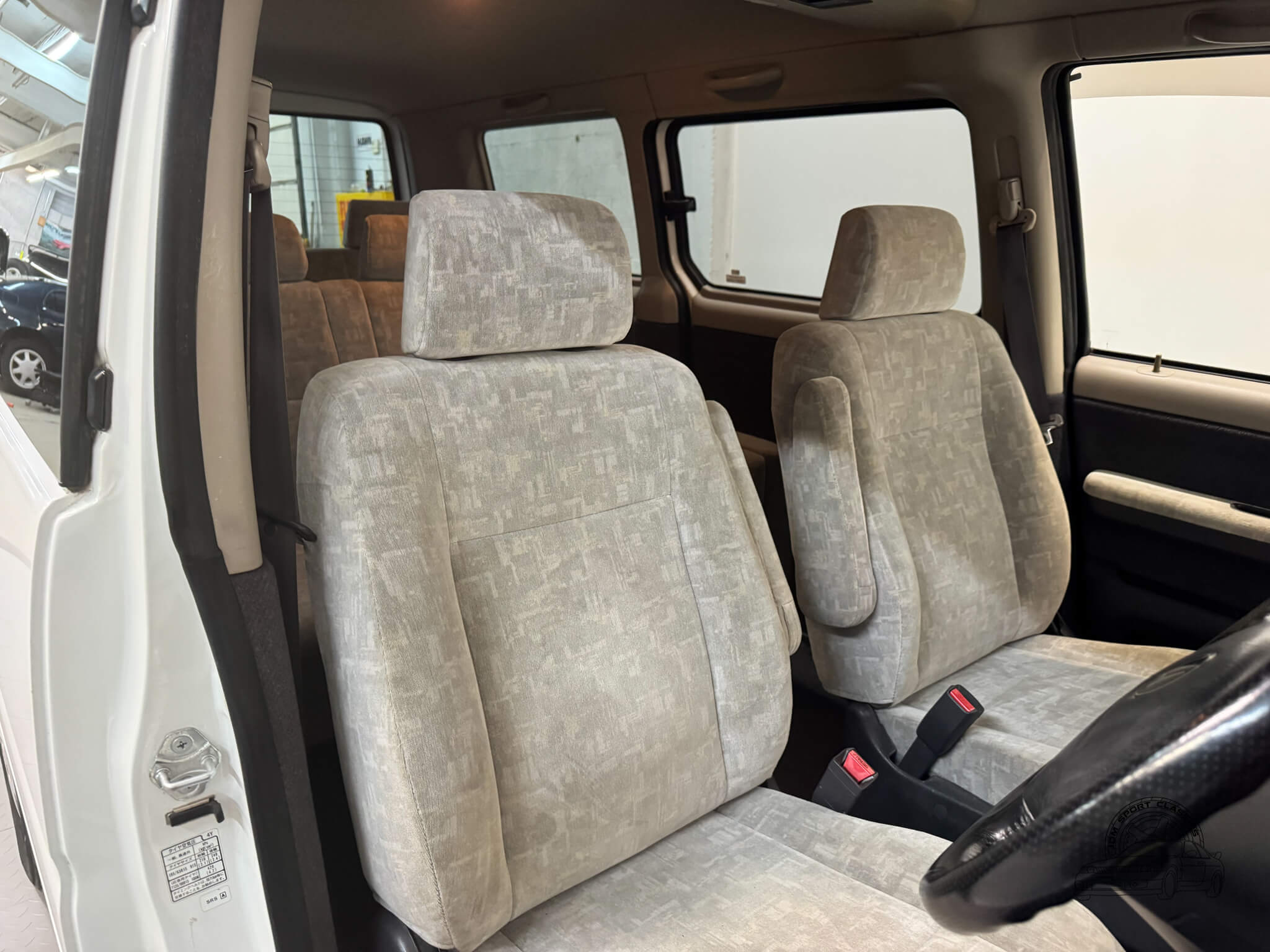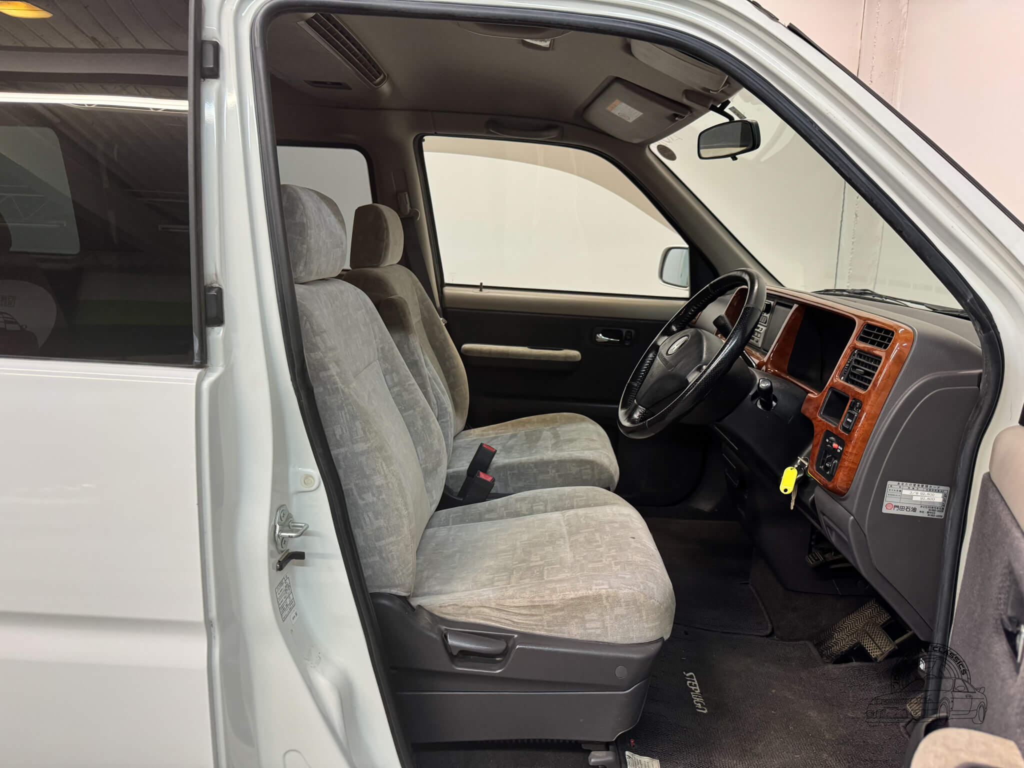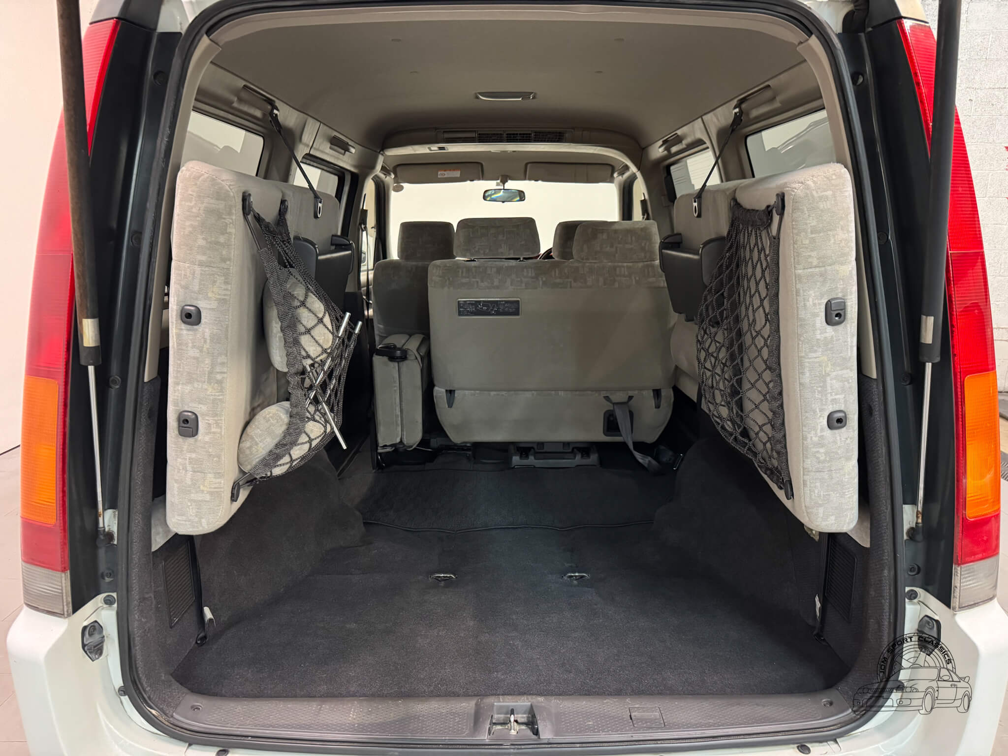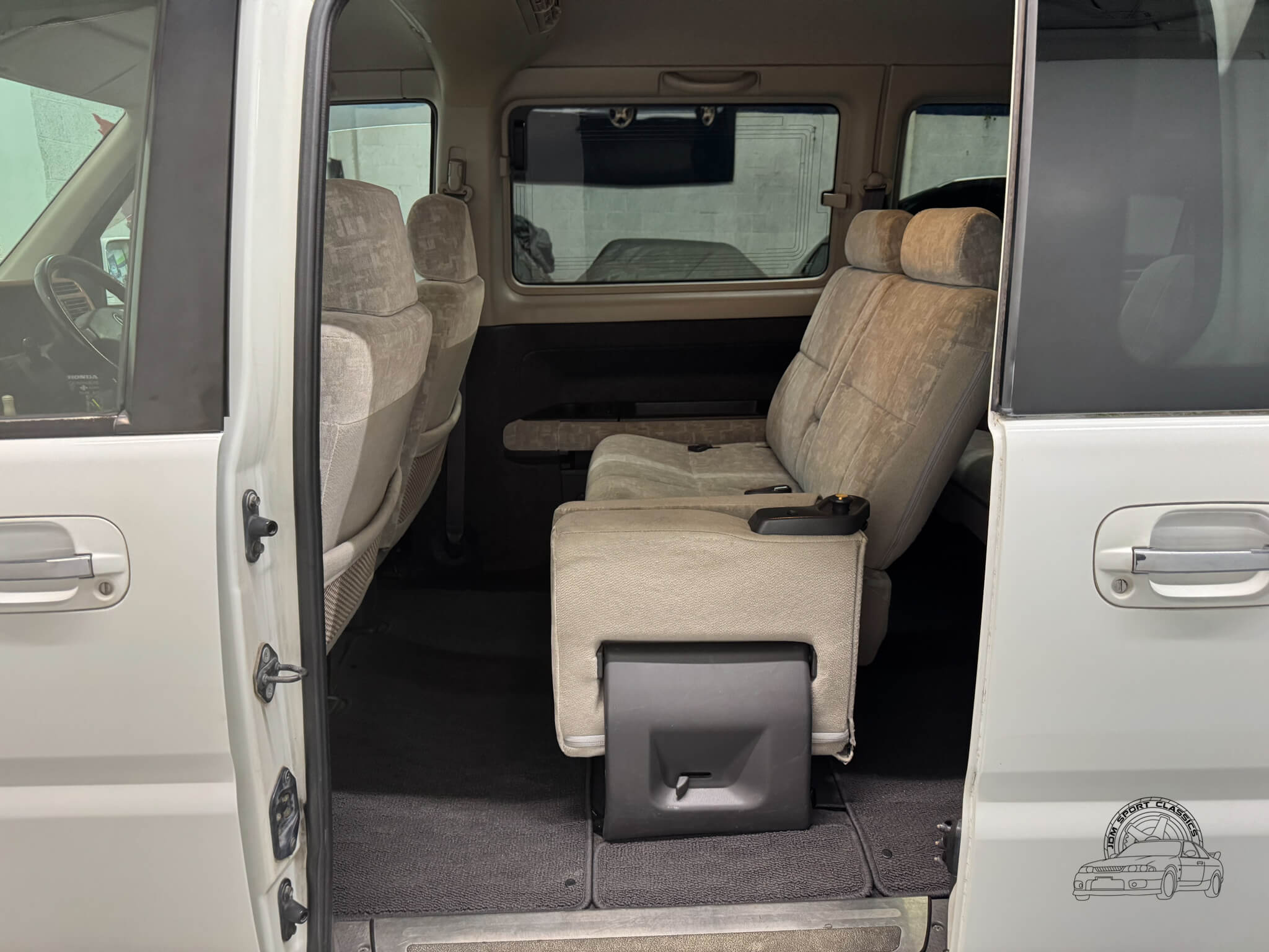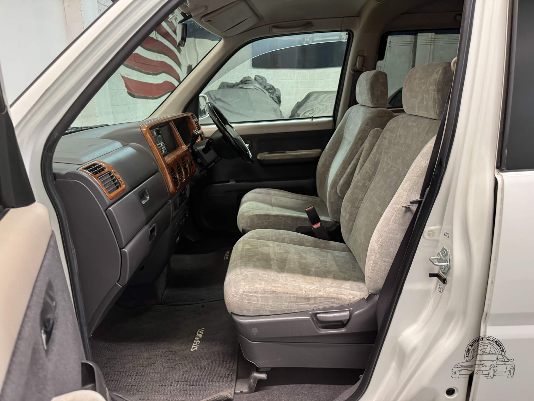 Inside, the cabin is designed for maximum utility and comfort. This 8 passenger van is configured across three rows, featuring rear jump seats that fold away to the sides to prioritize cargo room when needed. As a Goodee trim, the interior includes wood grain dash accents and a leather wrapped tilt steering wheel. The middle row seats can be rotated to face the third row, and both rear rows can be adjusted into multiple configurations, including folding flat to create a sleeping surface. The interior is well appointed with dual zone climate control featuring hot heat and cold air conditioning. Functional amenities include power windows, power adjustable folding mirrors, and rear pop out windows. For added convenience, the cabin features front and rear cupholders, factory StepWgn floor mats, and door panels with integrated storage pockets. Tinted rear windows provide additional privacy, while the original gray cloth remains in good condition and the upright cabin design offers excellent visibility for the driver.