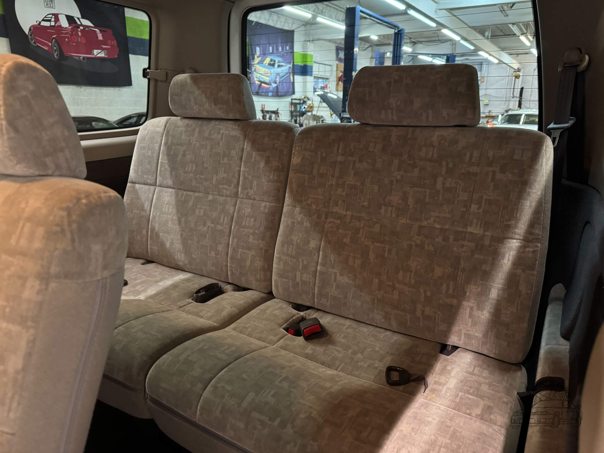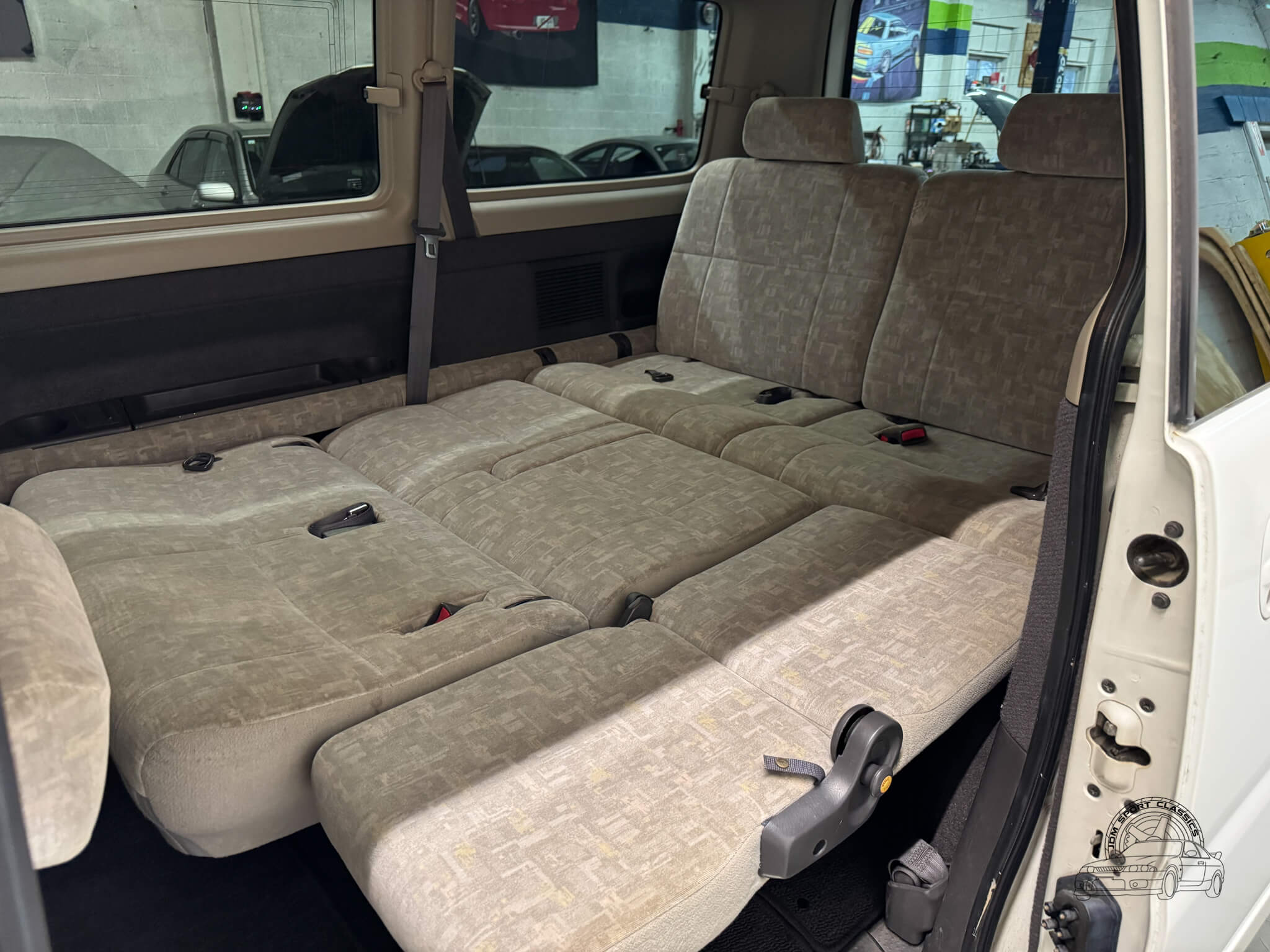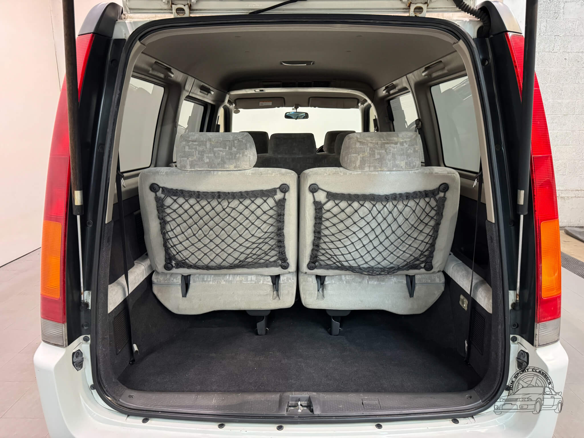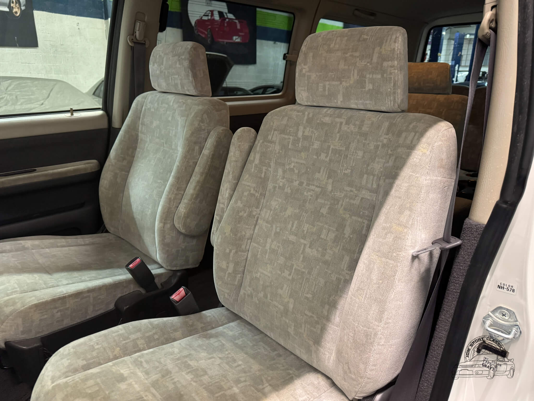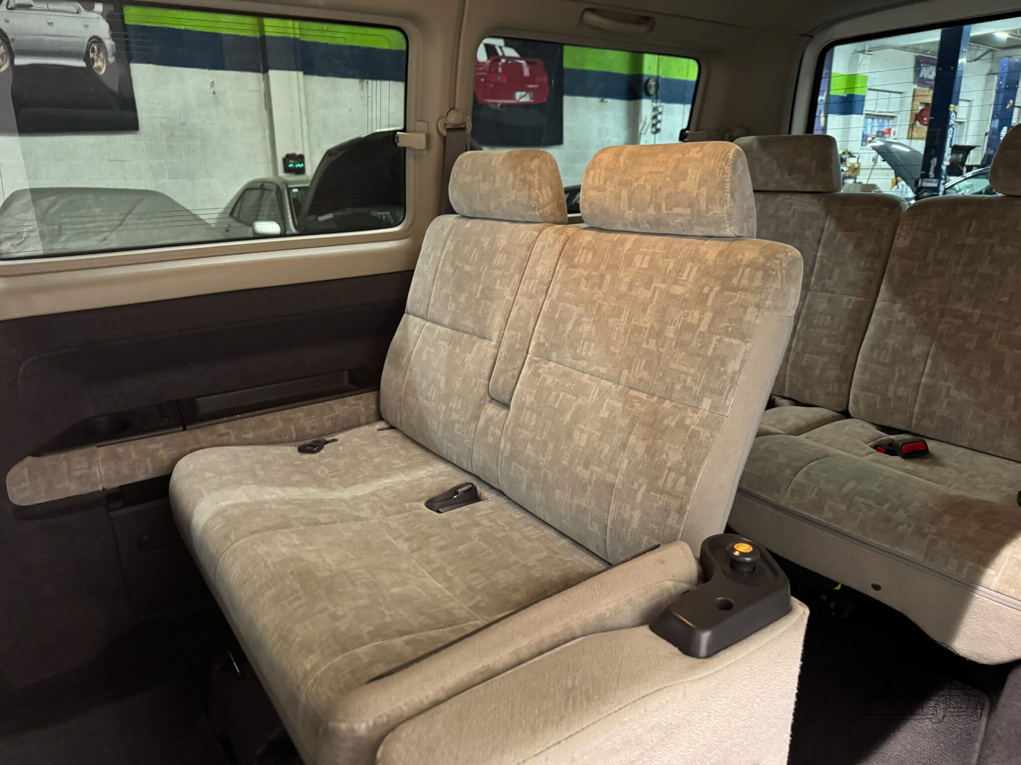 Inside, the cabin is designed for maximum utility and comfort. This 8 passenger van is configured across three rows, featuring rear jump seats that fold away to the sides to prioritize cargo room when needed. As a Goodee trim, the interior includes wood grain dash accents and a leather wrapped tilt steering wheel. The middle row seats can be rotated to face the third row, and both rear rows can be adjusted into multiple configurations, including folding flat to create a sleeping surface. The interior is well appointed with dual zone climate control featuring hot heat and cold air conditioning. Functional amenities include power windows, power adjustable folding mirrors, and rear pop out windows. For added convenience, the cabin features front and rear cupholders, factory StepWgn floor mats, and door panels with integrated storage pockets. Tinted rear windows provide additional privacy, while the original gray cloth remains in good condition and the upright cabin design offers excellent visibility for the driver.