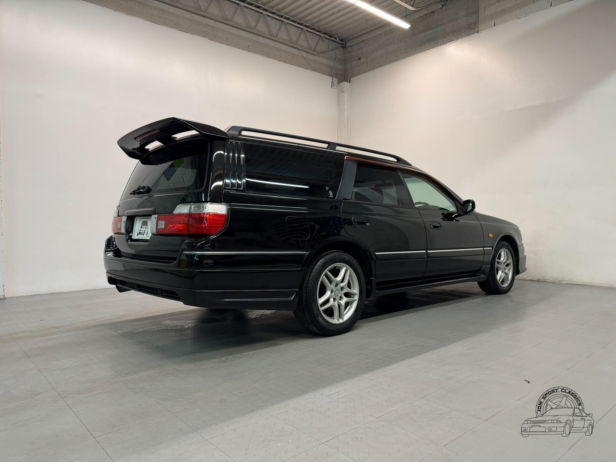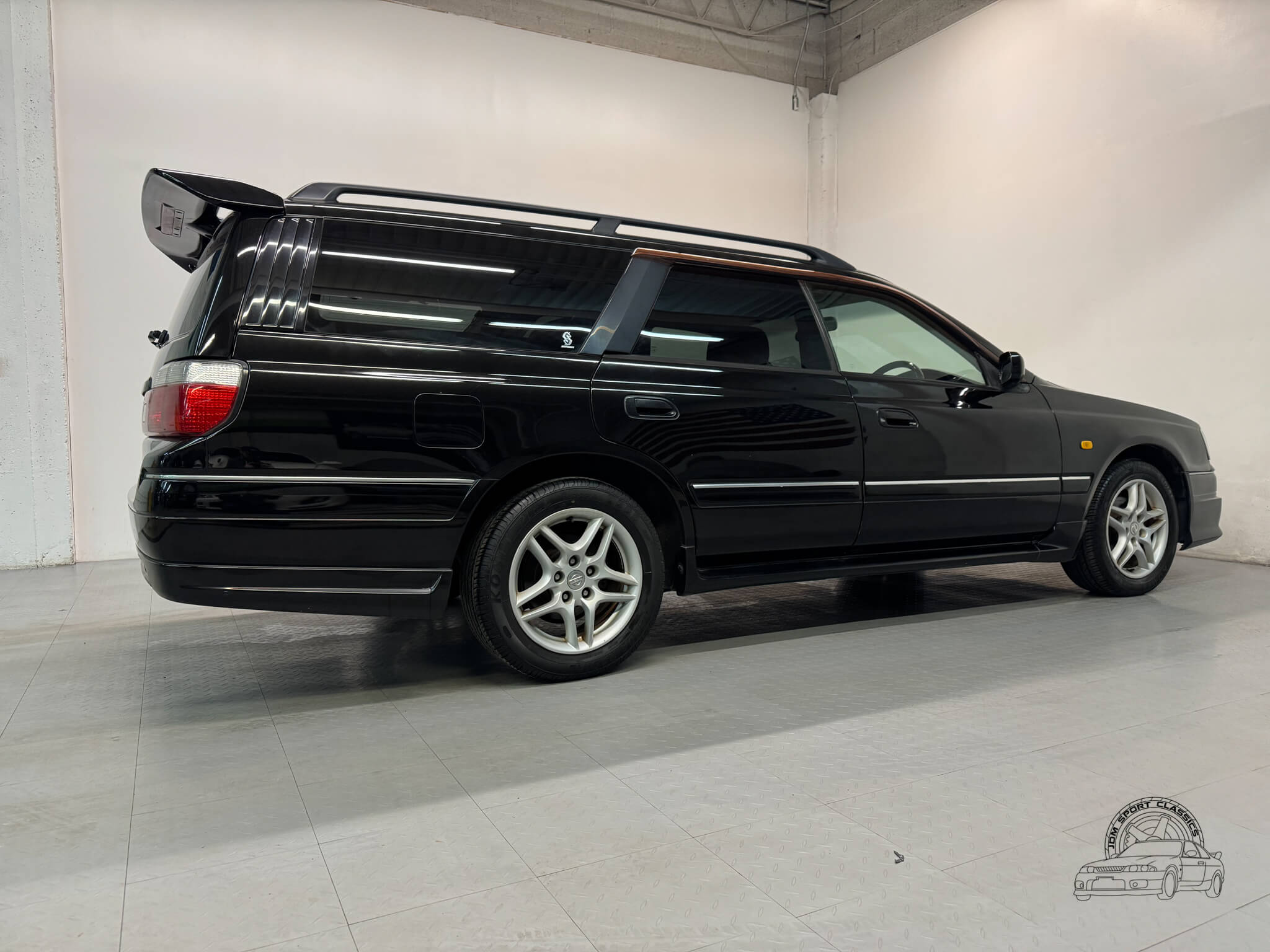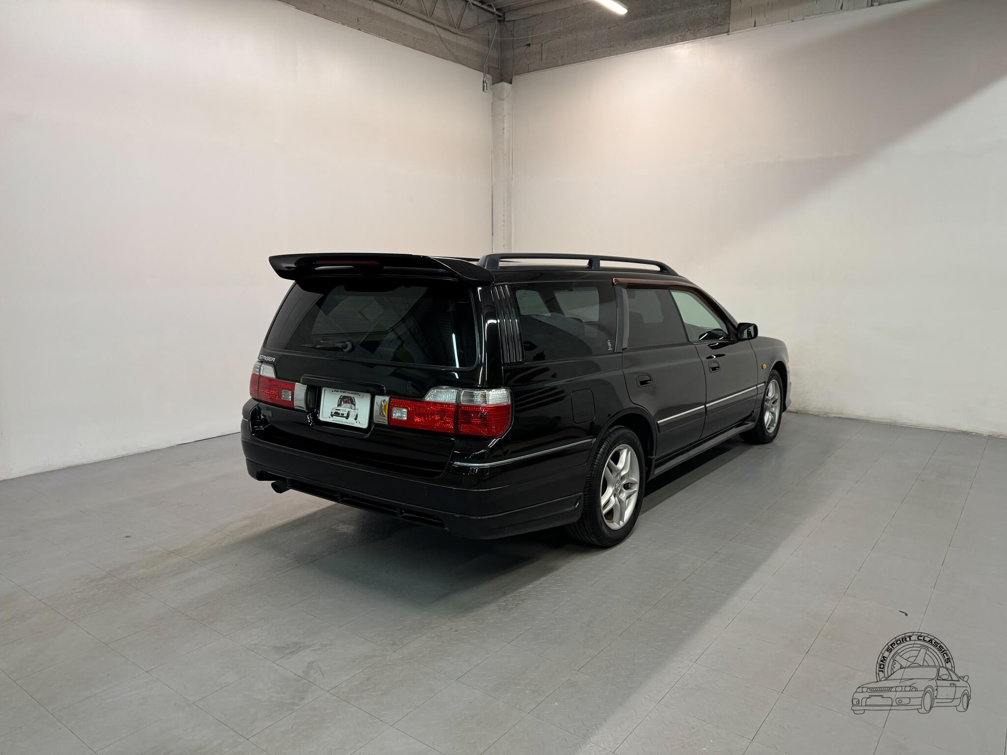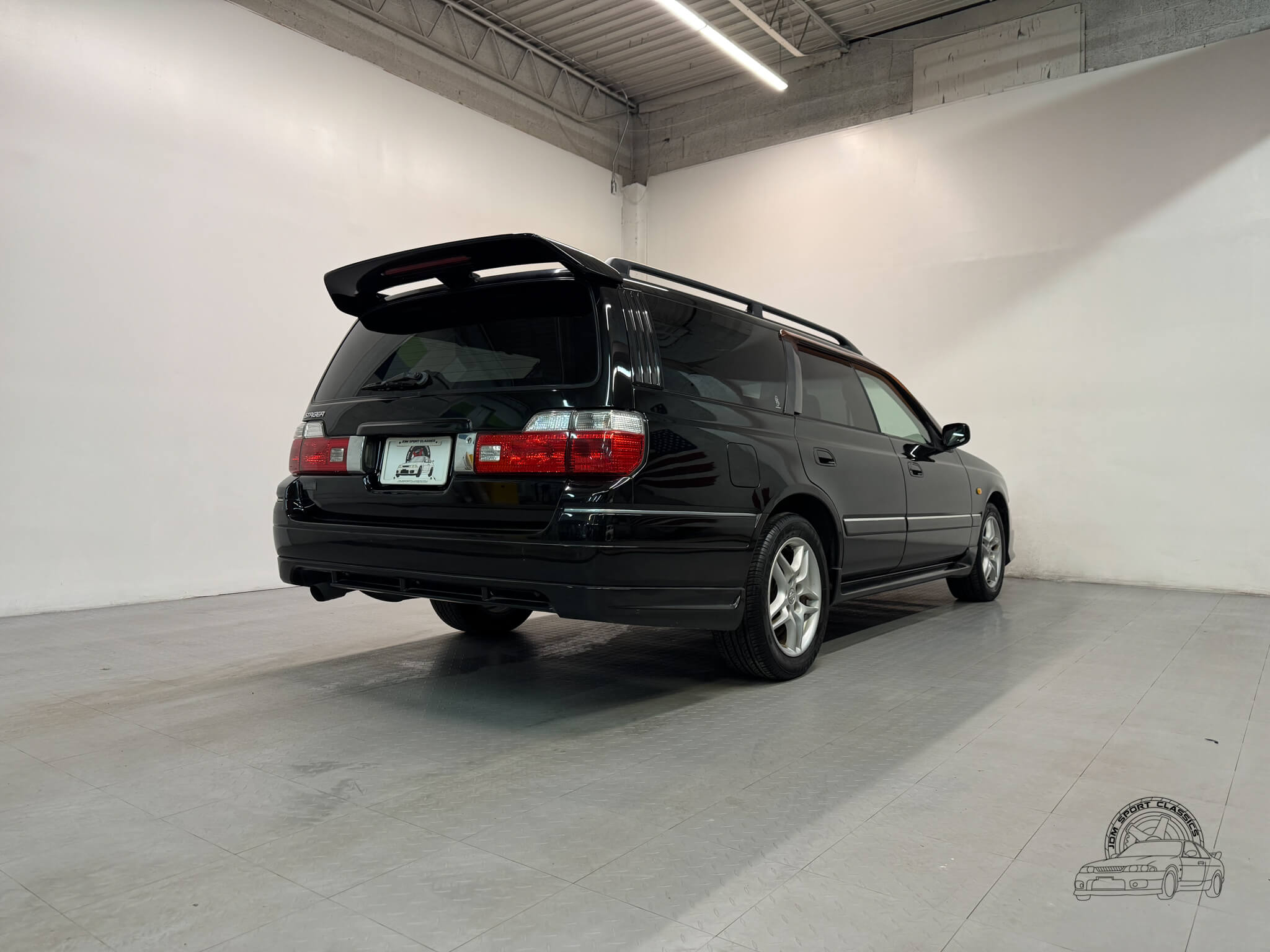 The exterior, finished in Black Pearl (Color Code GV1), remains completely stock while showcasing the upgraded Series 2 Aero styling. Sportier front and rear bumpers, side skirts, and a rear spoiler give the Stagea a sharper, more athletic stance, emphasizing its dynamic lines and timeless body style. Subtle design touches from the Prime Edition complement the aero upgrades, resulting in a cohesive and confident presence that stands out on the road.