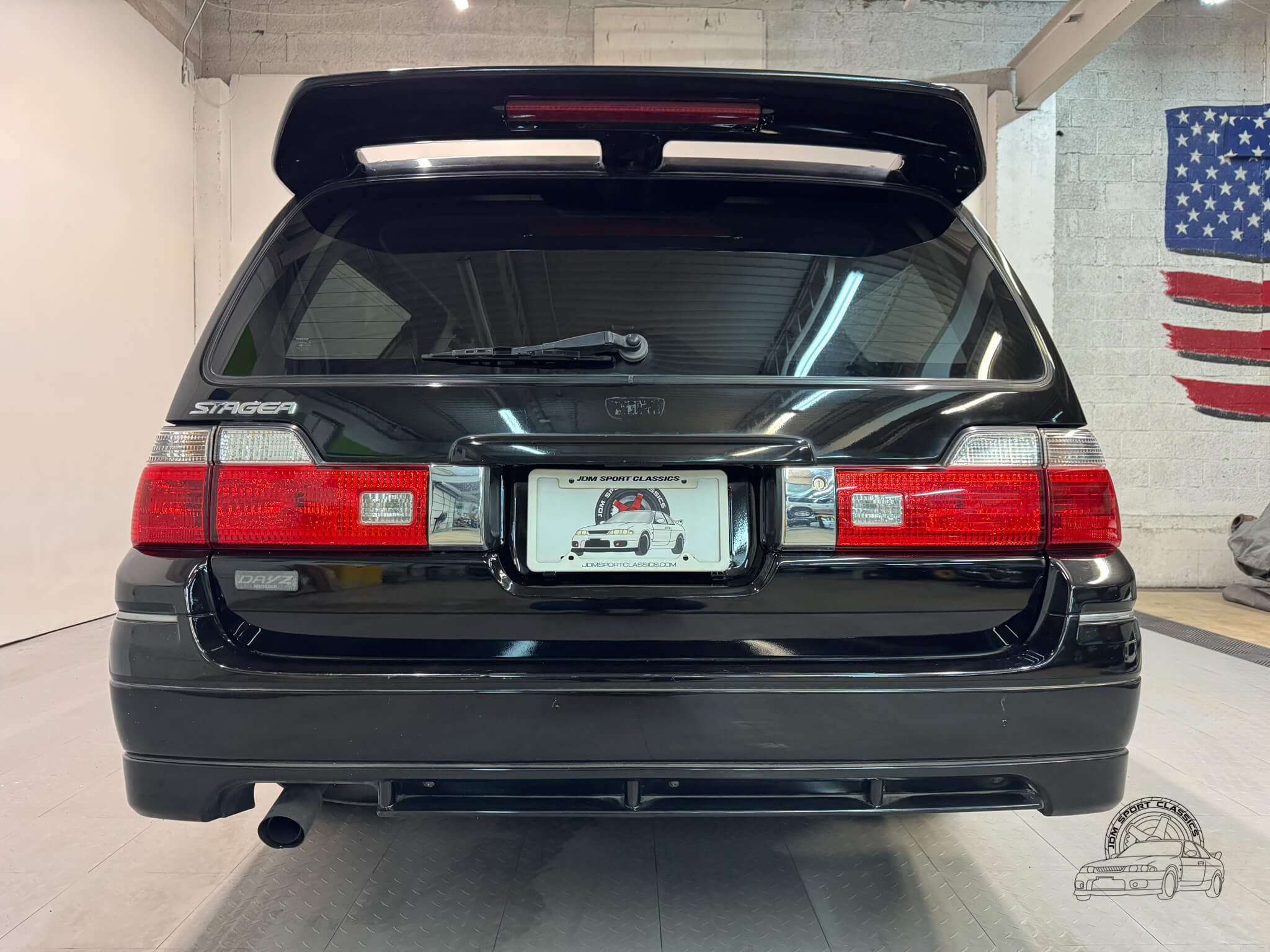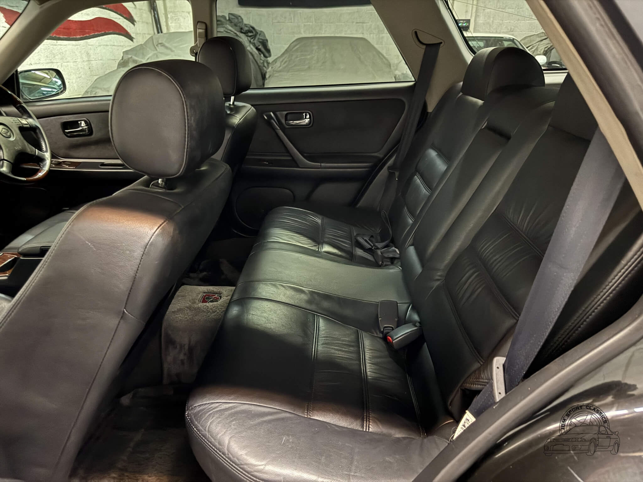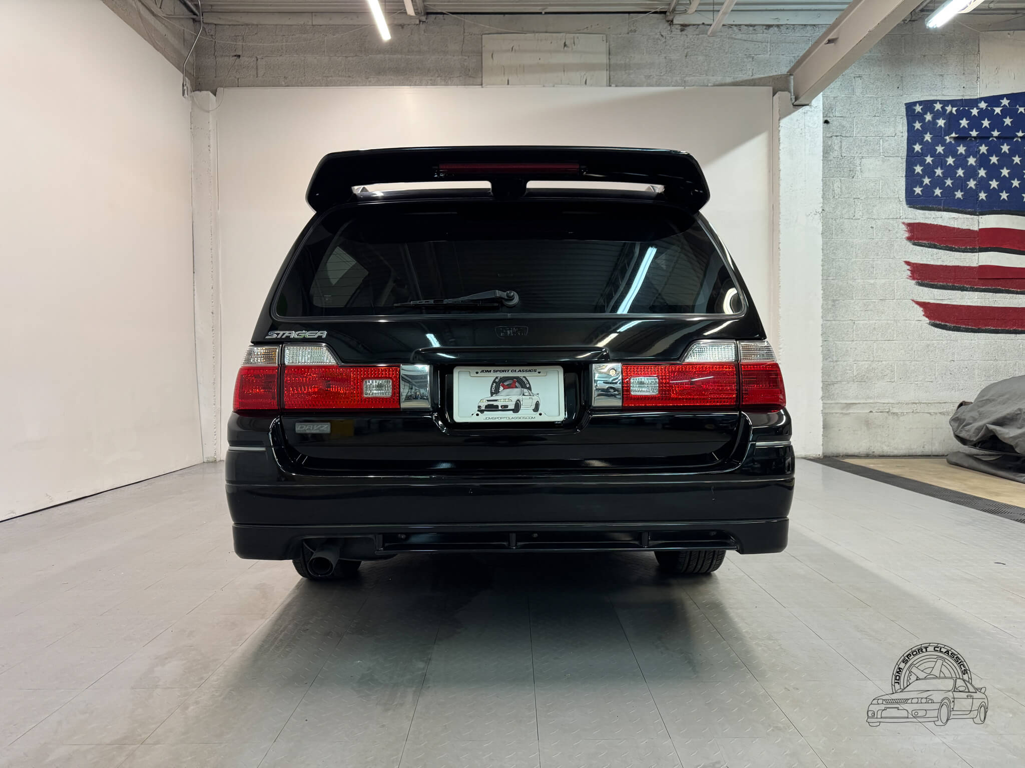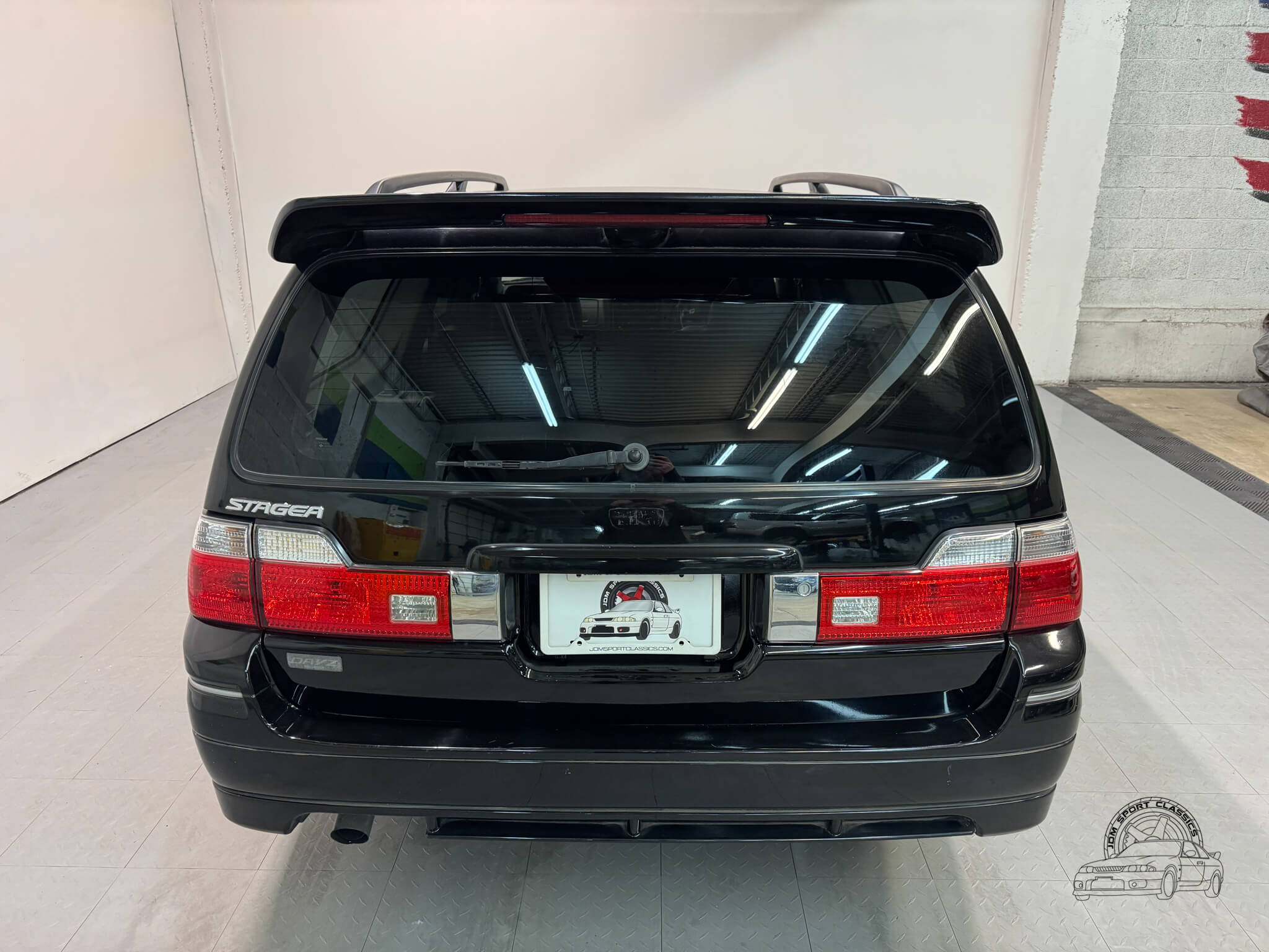 The exterior, finished in Black Pearl (Color Code GV1), remains completely stock while showcasing the upgraded Series 2 Aero styling. Sportier front and rear bumpers, side skirts, and a rear spoiler give the Stagea a sharper, more athletic stance, emphasizing its dynamic lines and timeless body style. Subtle design touches from the Prime Edition complement the aero upgrades, resulting in a cohesive and confident presence that stands out on the road.