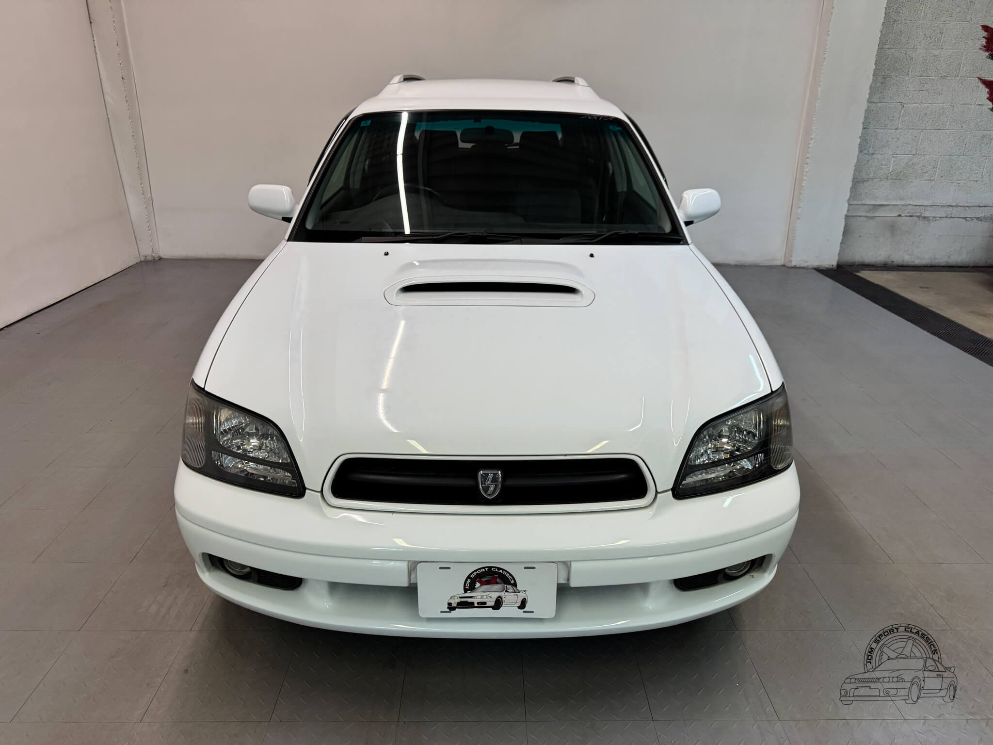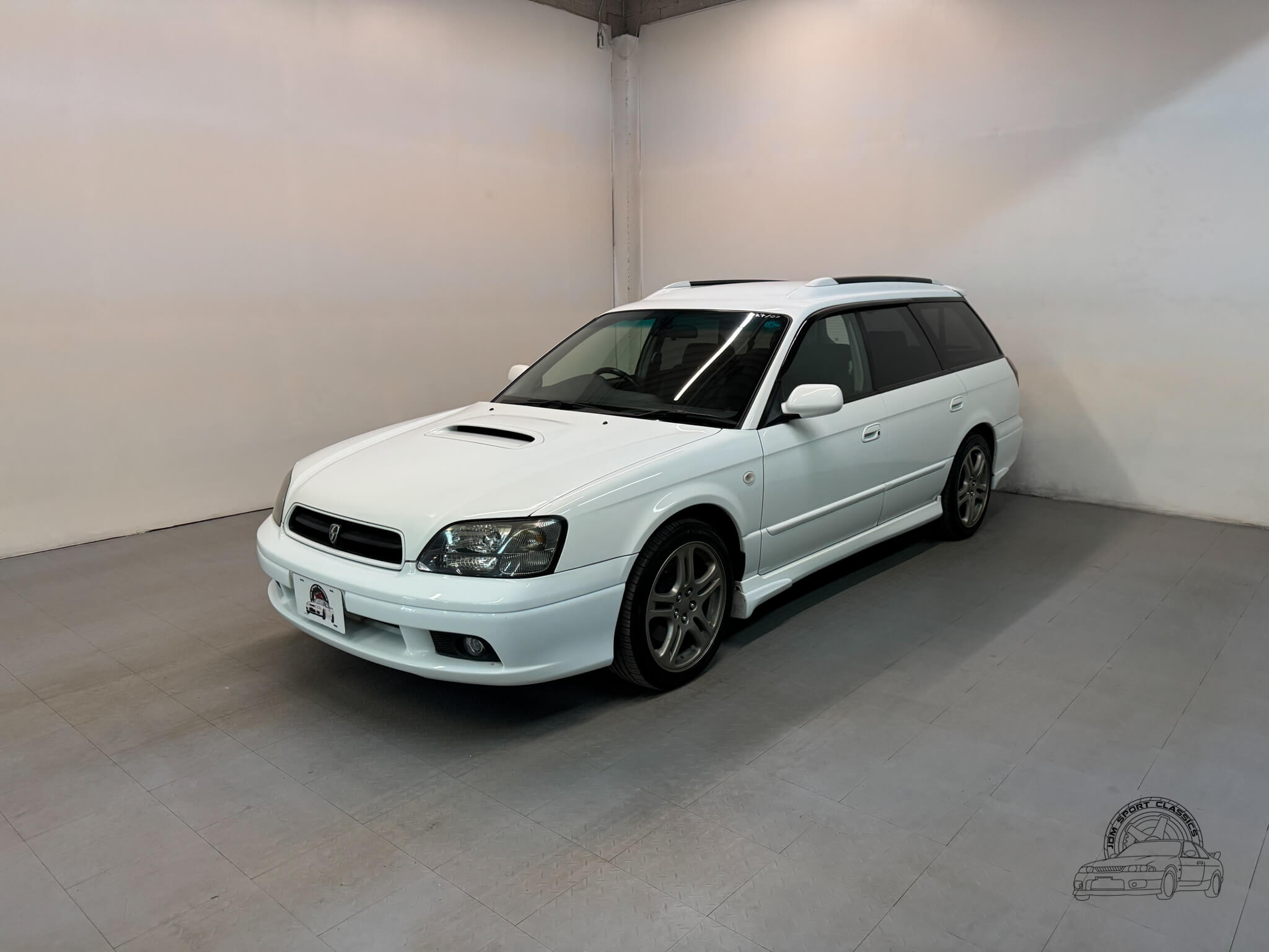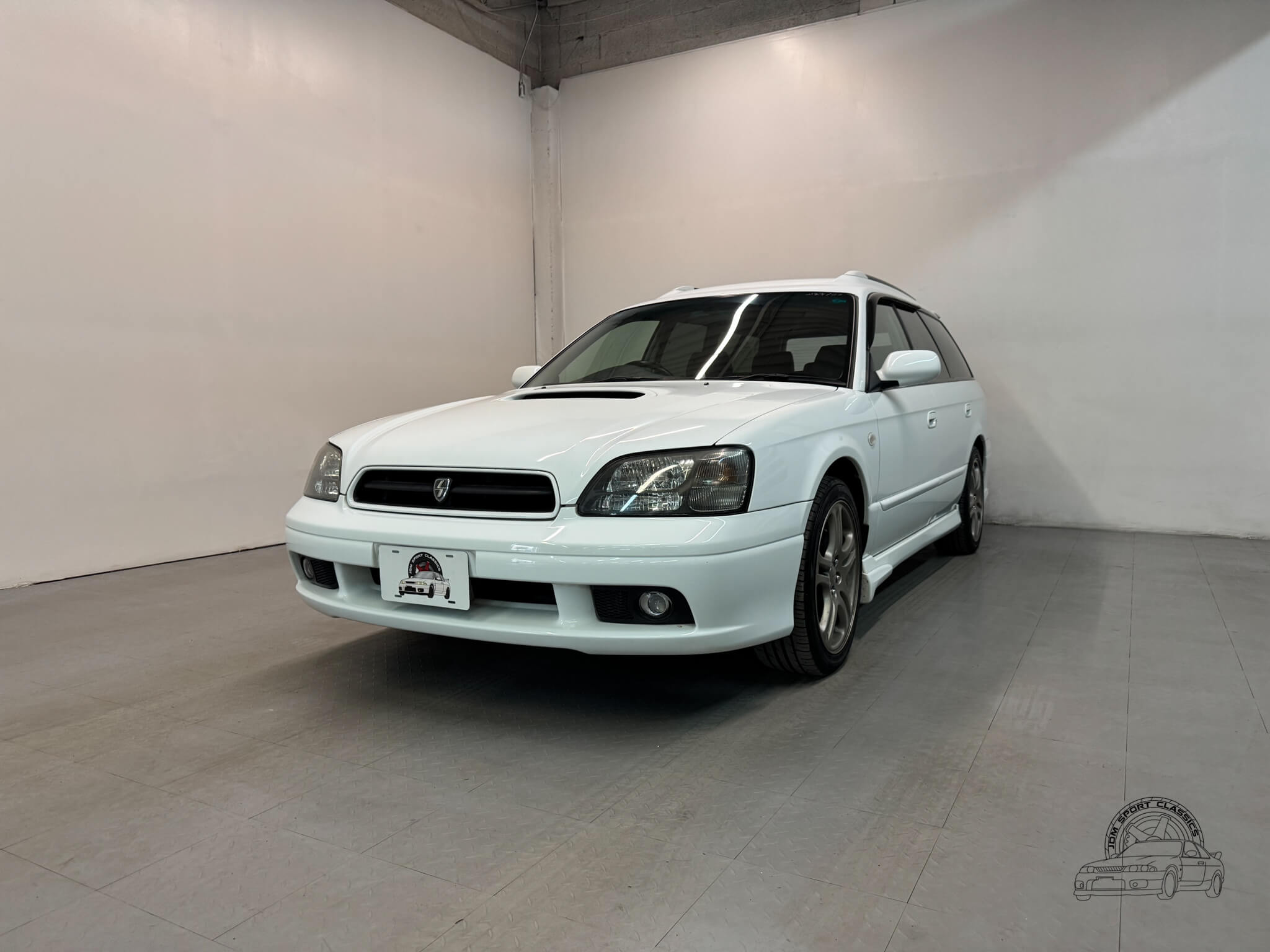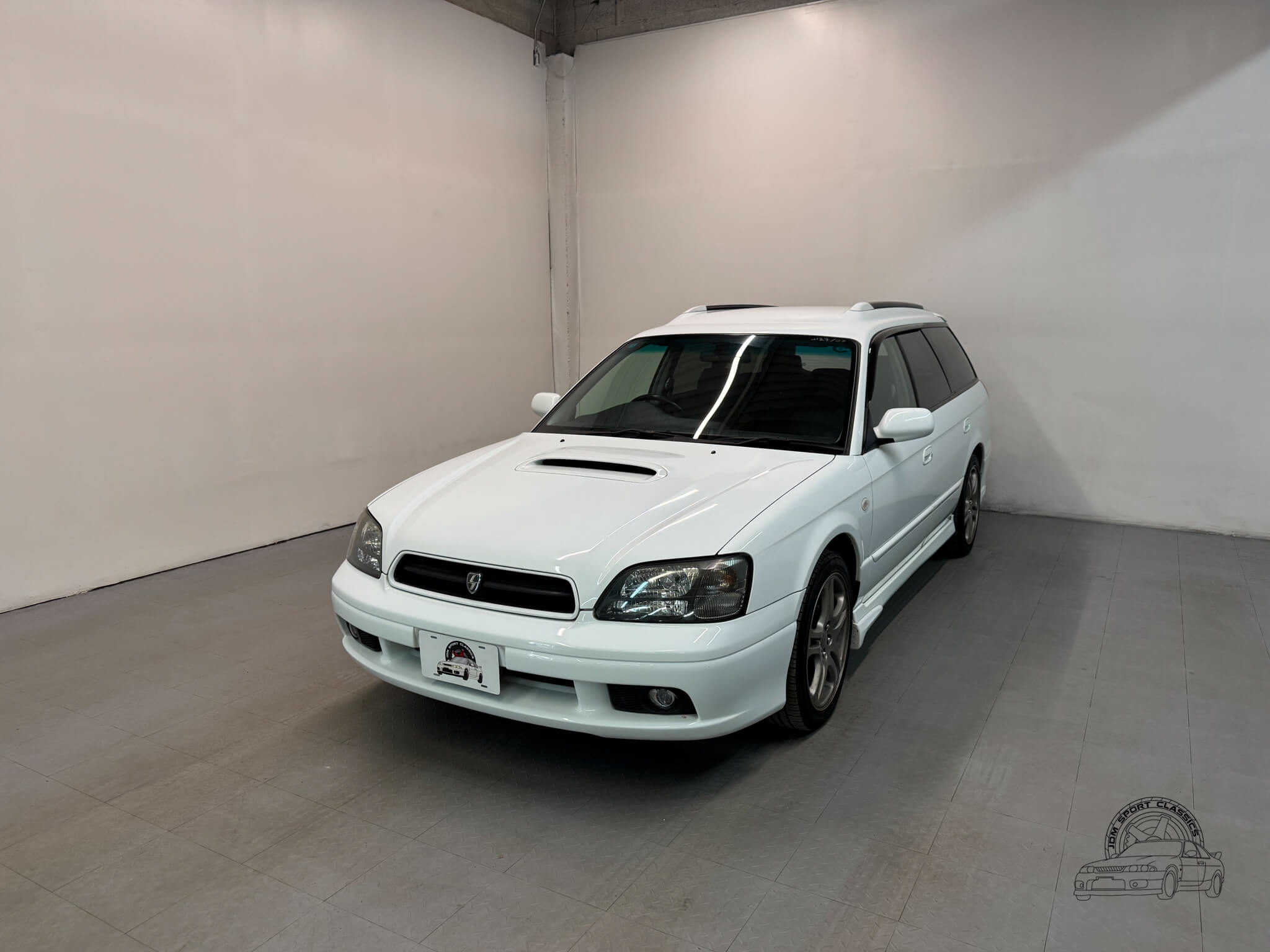 The exterior is finished in the classic Aspen White, which perfectly highlights the sport wagon’s athletic and understated body lines. The design is instantly recognizable to any enthusiast by its functional hood scoop and signature factory fog lights, which serve as a nod to Subaru’s rally heritage. Because this is a GT-B E-Tune, the car features a more aggressive stance from the factory thanks to its Bilstein suspension and original aero kit, including the rear bumper spats and side skirts. JDM-specific details like the factory rain guards, the red Legacy rear center garnish, and the original GT-B and Bilstein badging elevate the look.