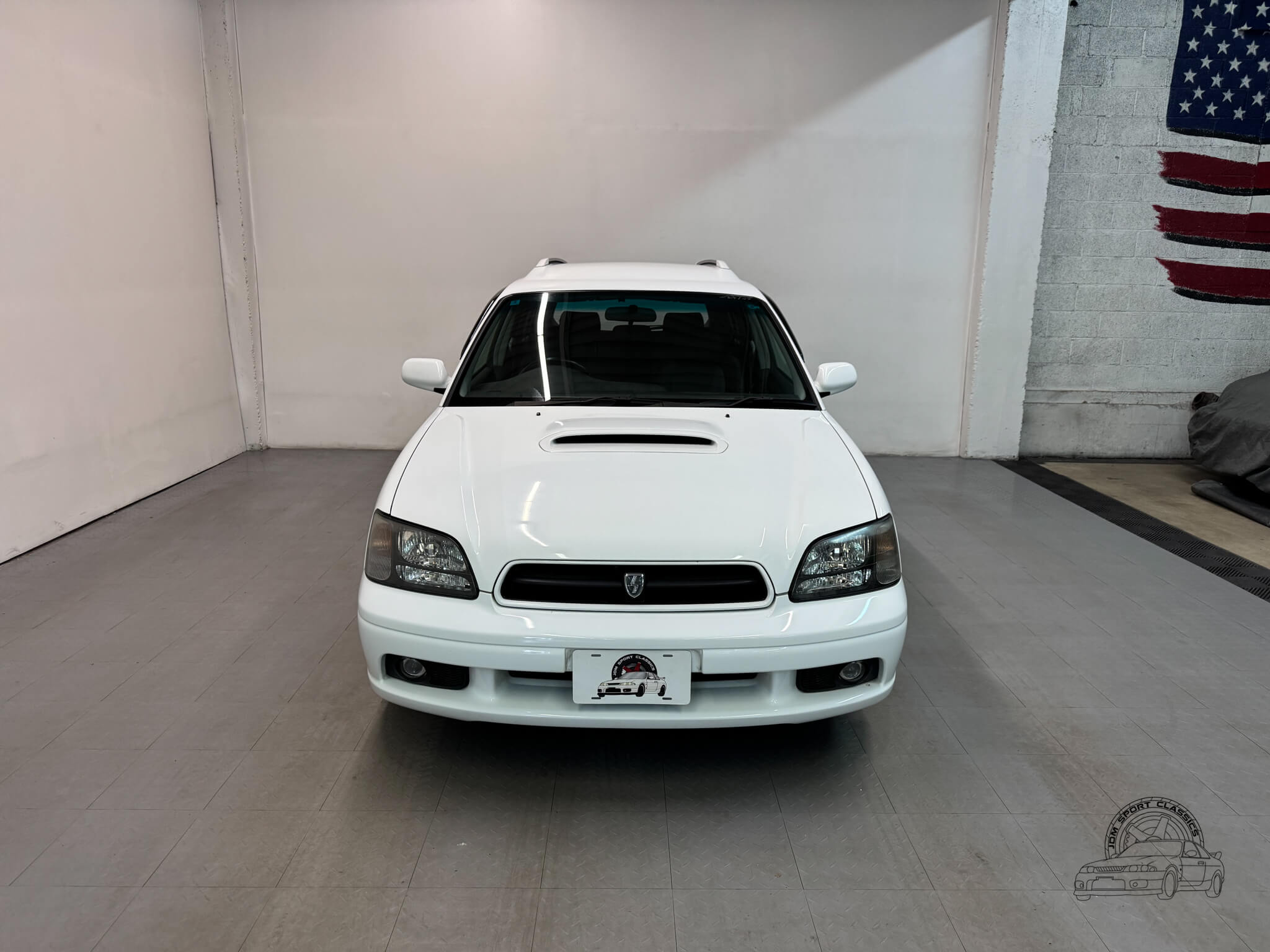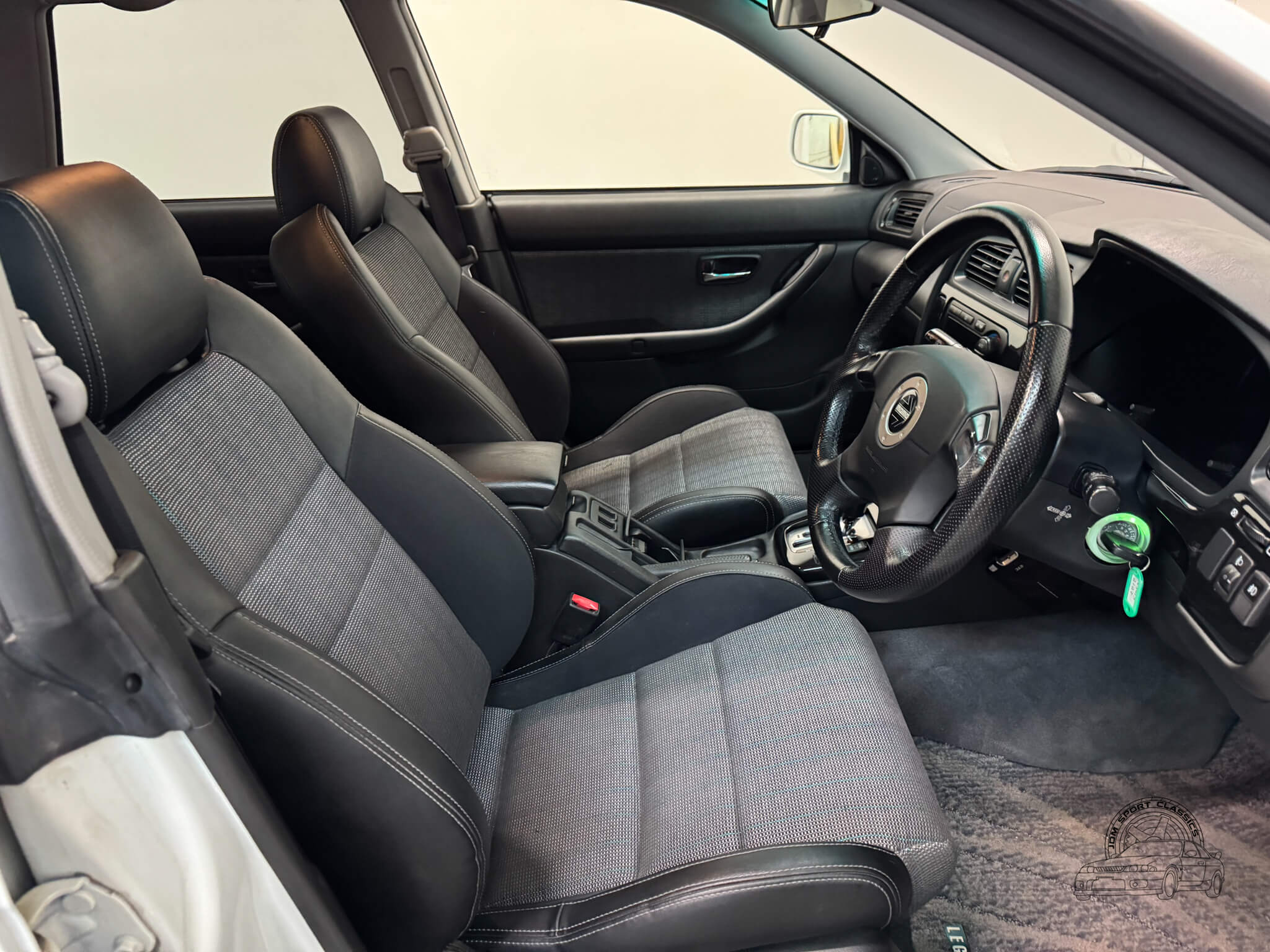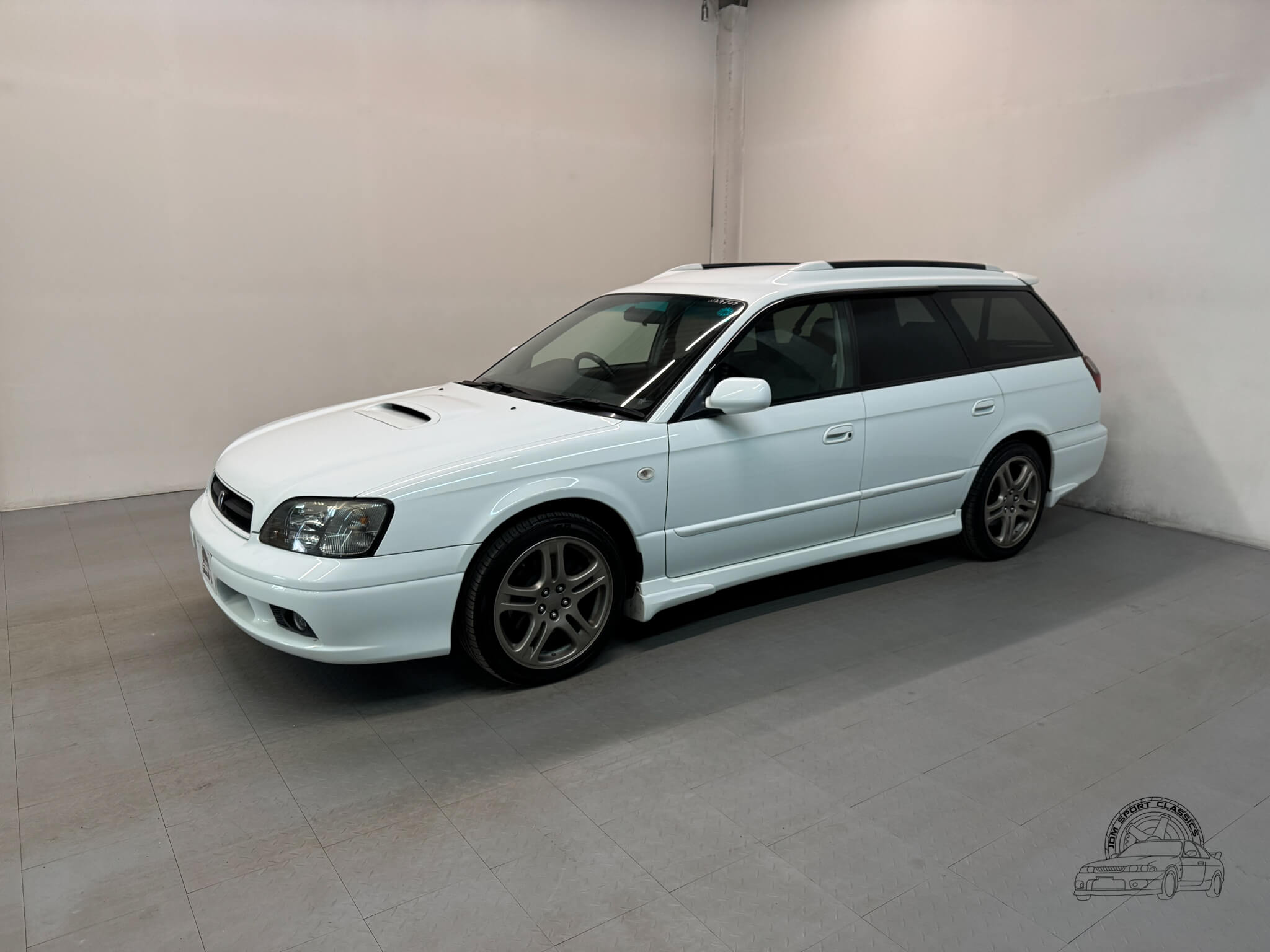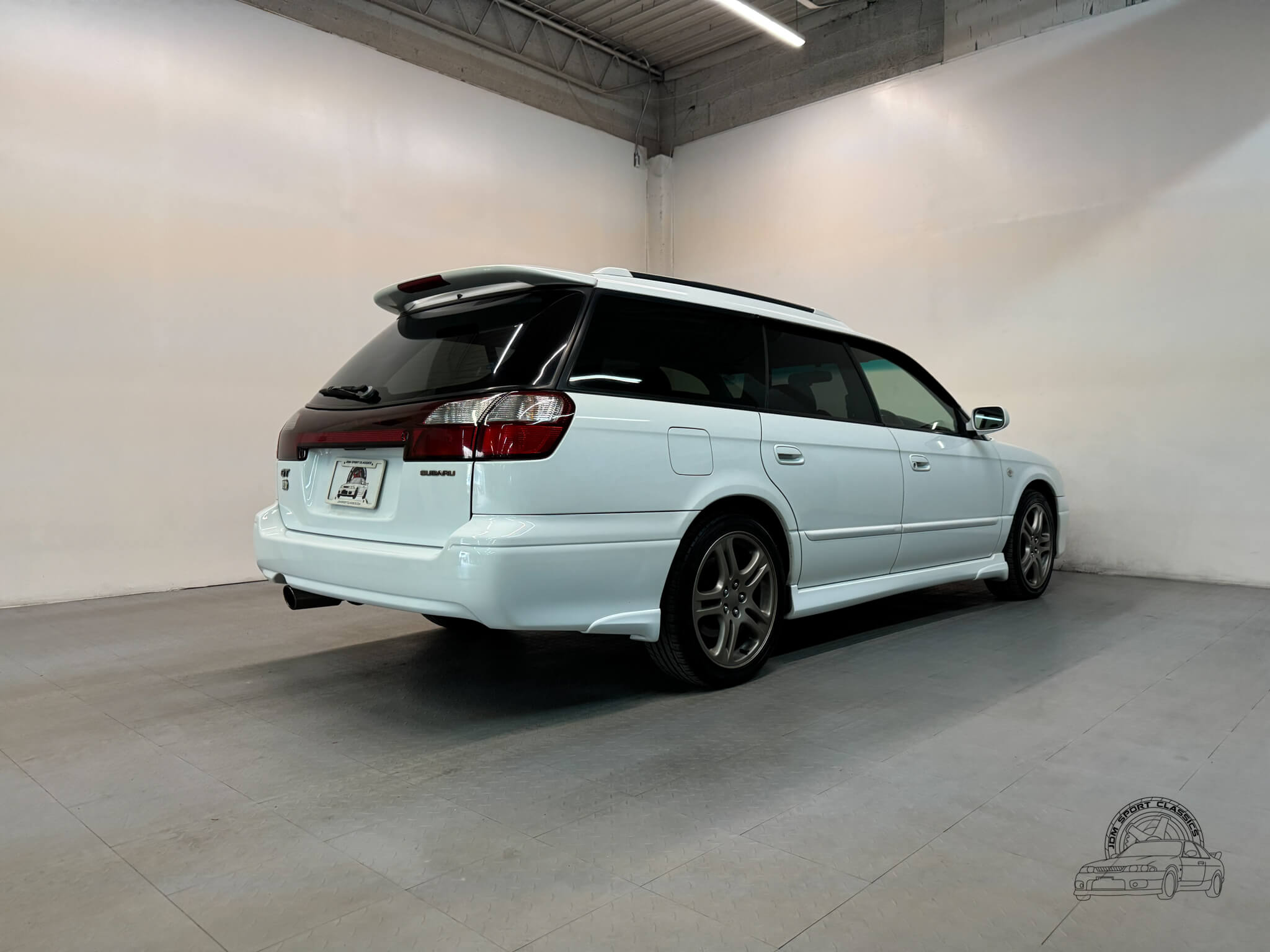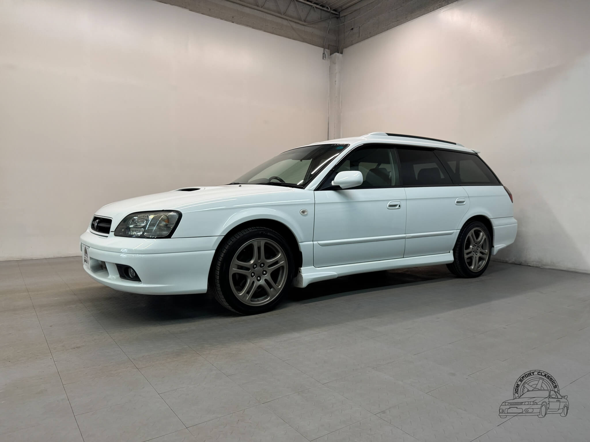 The exterior is finished in the classic Aspen White, which perfectly highlights the sport wagon’s athletic and understated body lines. The design is instantly recognizable to any enthusiast by its functional hood scoop and signature factory fog lights, which serve as a nod to Subaru’s rally heritage. Because this is a GT-B E-Tune, the car features a more aggressive stance from the factory thanks to its Bilstein suspension and original aero kit, including the rear bumper spats and side skirts. JDM-specific details like the factory rain guards, the red Legacy rear center garnish, and the original GT-B and Bilstein badging elevate the look.