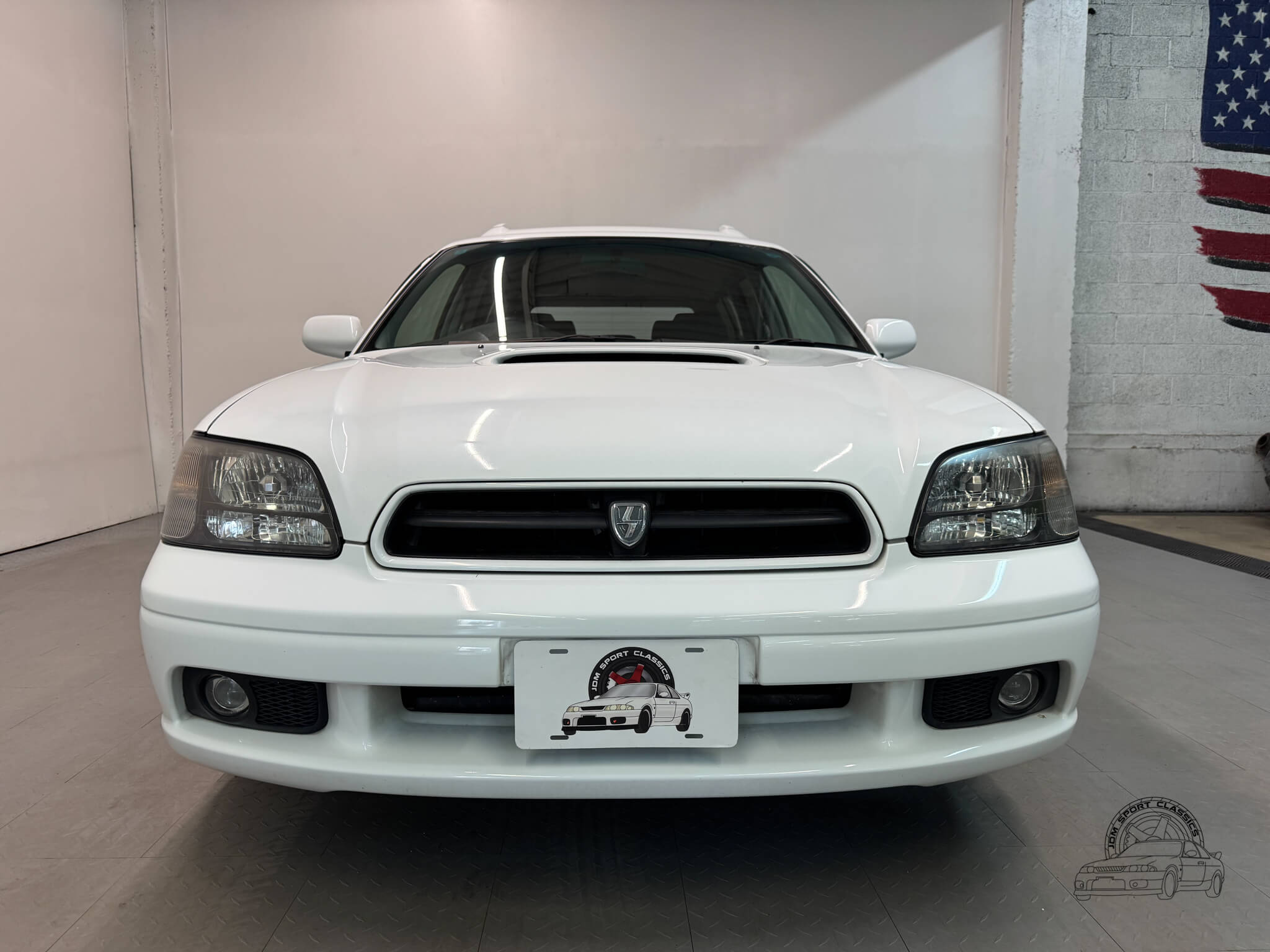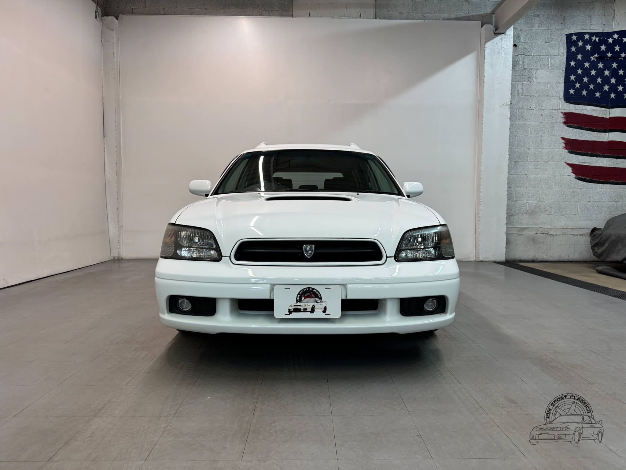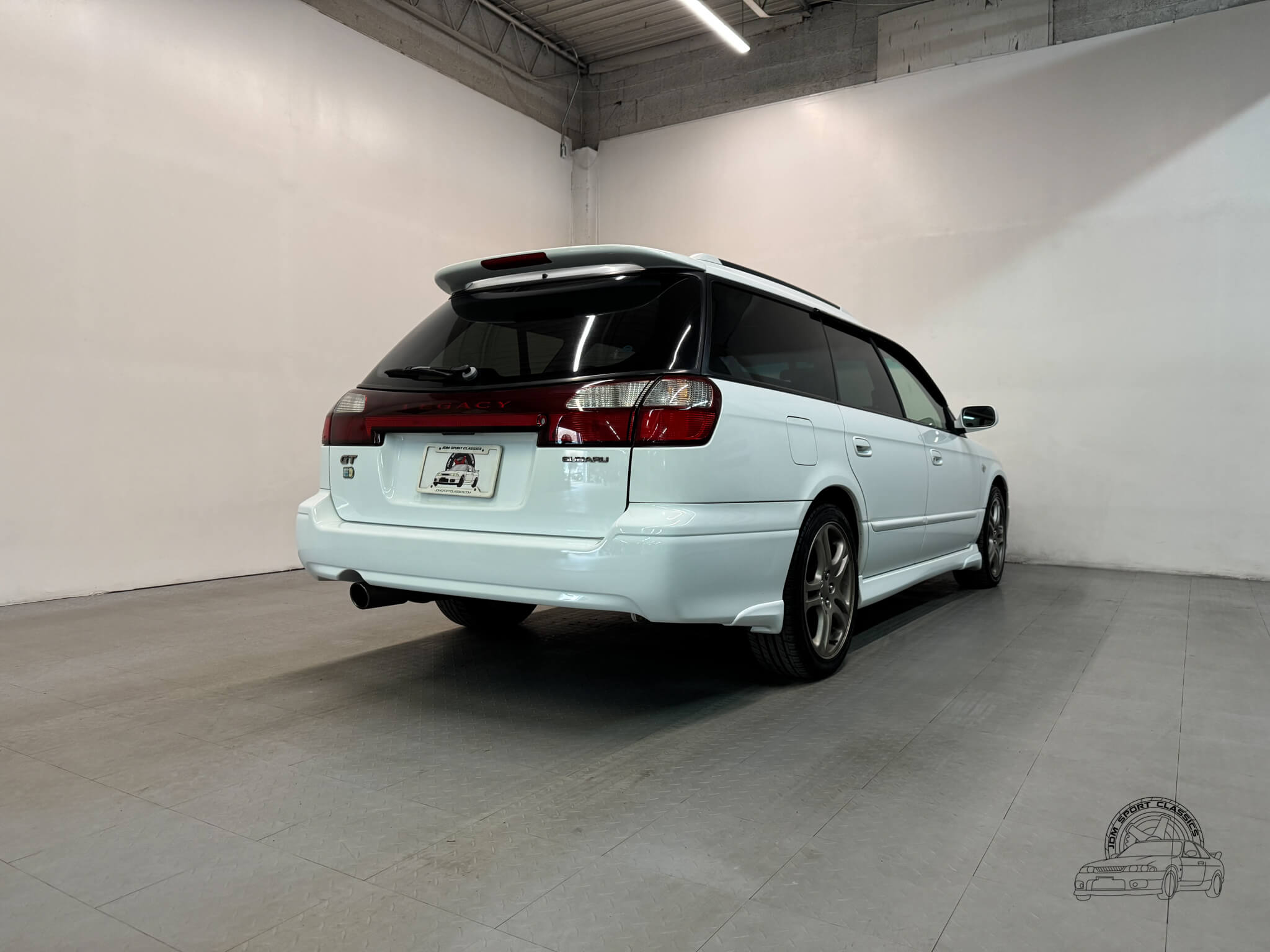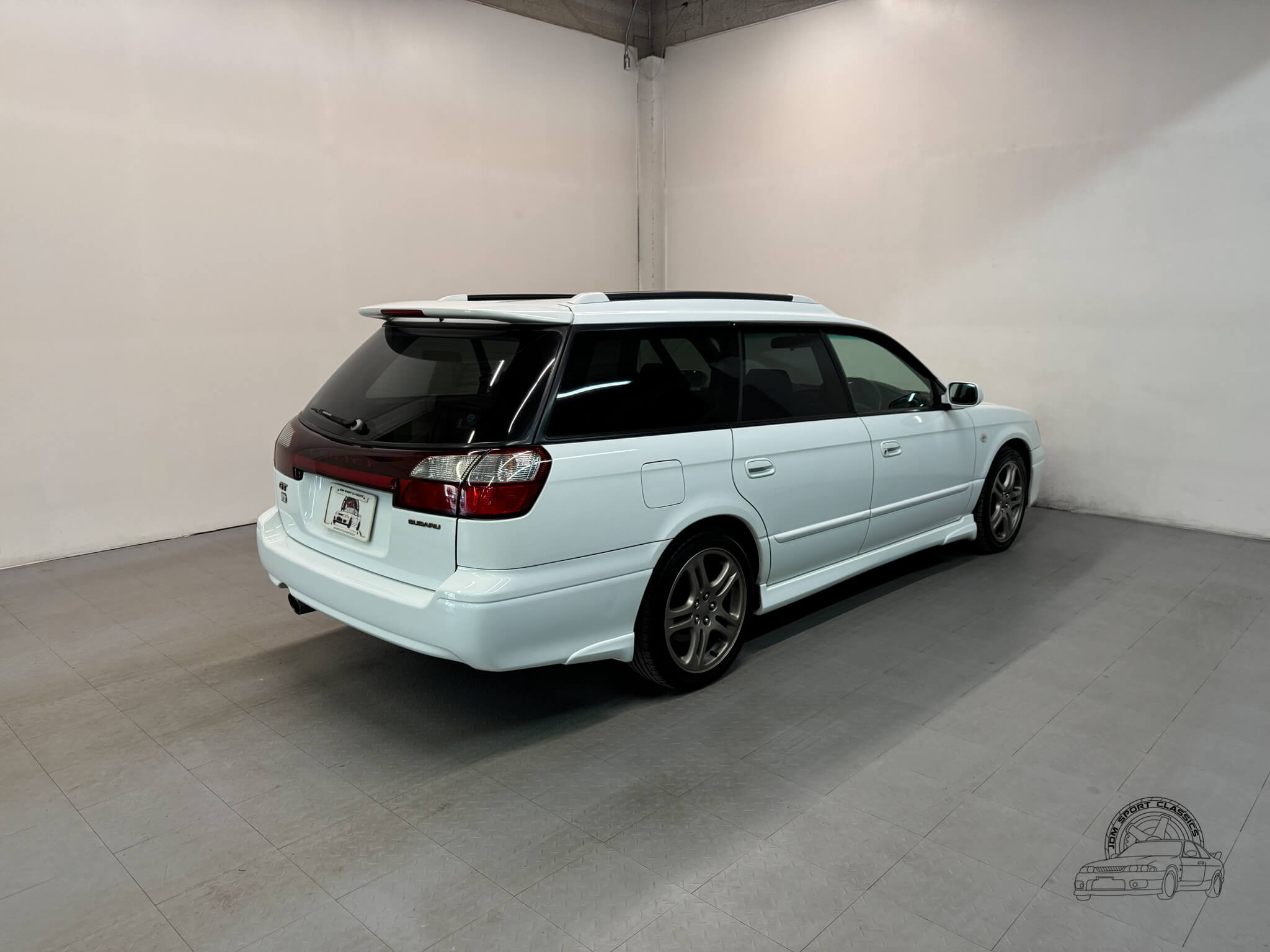 The exterior is finished in the classic Aspen White, which perfectly highlights the sport wagon’s athletic and understated body lines. The design is instantly recognizable to any enthusiast by its functional hood scoop and signature factory fog lights, which serve as a nod to Subaru’s rally heritage. Because this is a GT-B E-Tune, the car features a more aggressive stance from the factory thanks to its Bilstein suspension and original aero kit, including the rear bumper spats and side skirts. JDM-specific details like the factory rain guards, the red Legacy rear center garnish, and the original GT-B and Bilstein badging elevate the look.