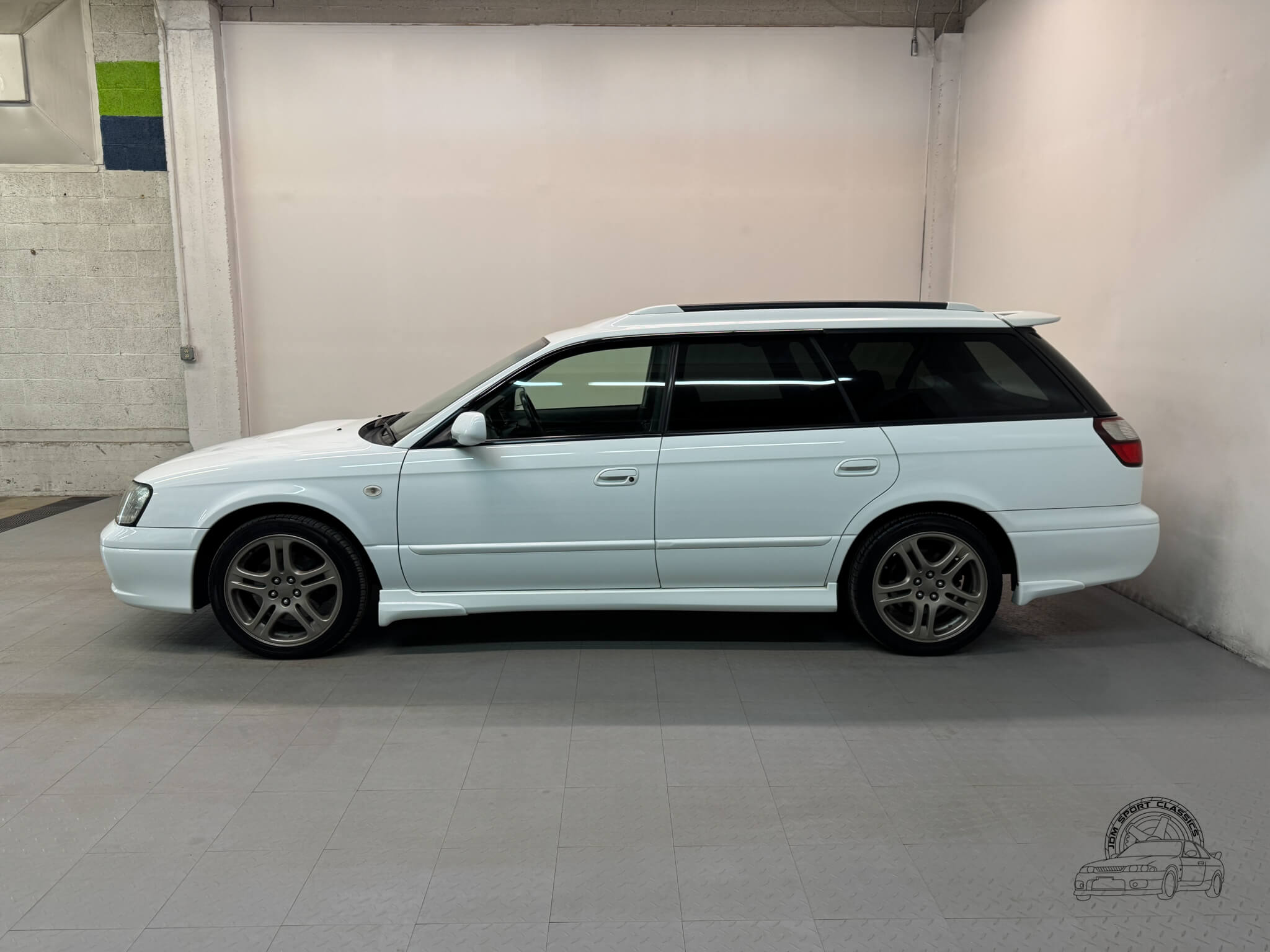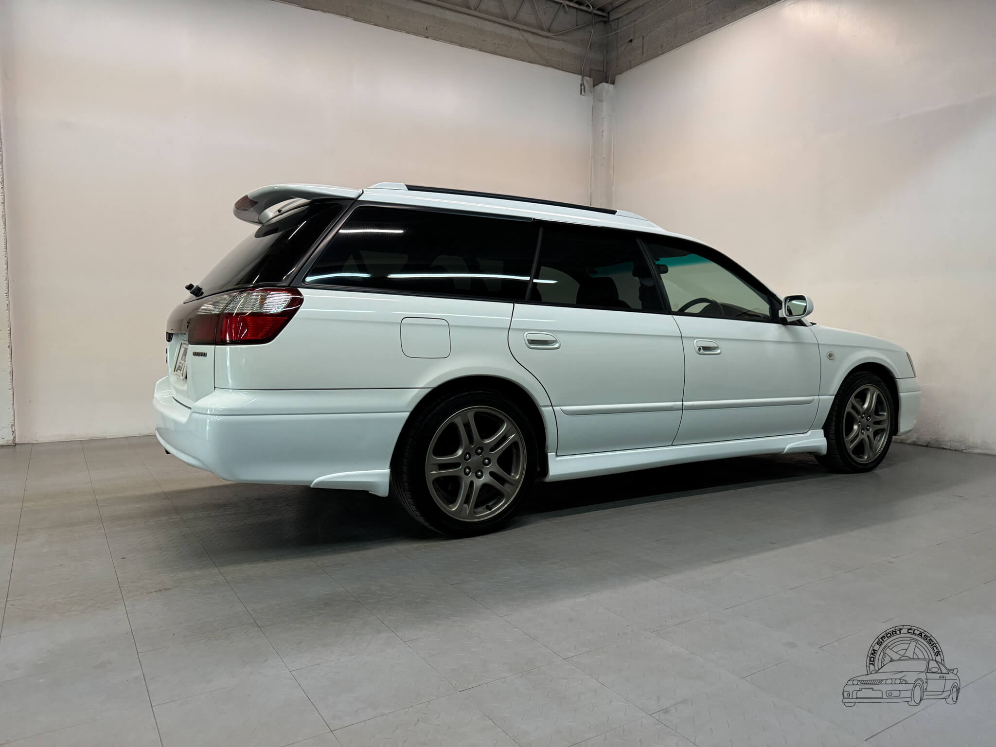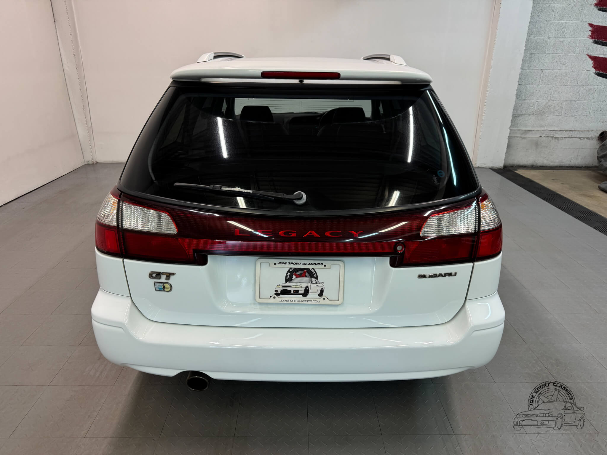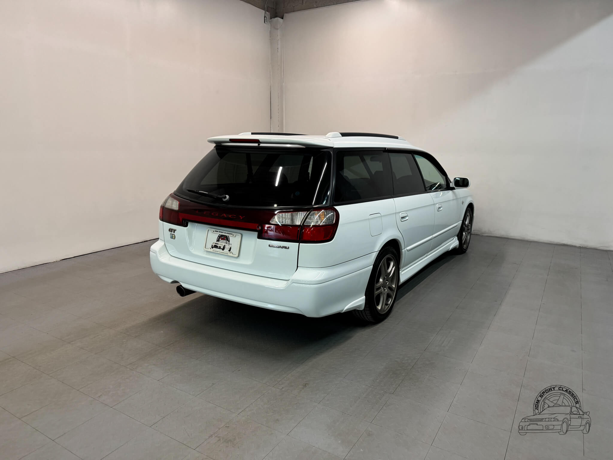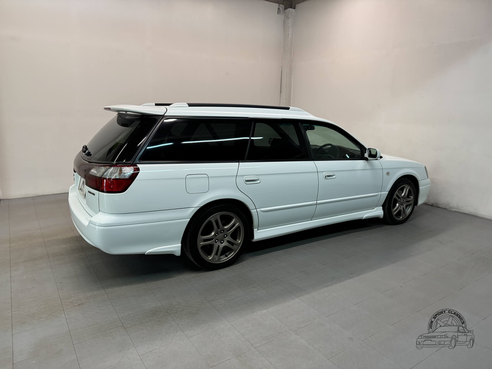 The exterior is finished in the classic Aspen White, which perfectly highlights the sport wagon’s athletic and understated body lines. The design is instantly recognizable to any enthusiast by its functional hood scoop and signature factory fog lights, which serve as a nod to Subaru’s rally heritage. Because this is a GT-B E-Tune, the car features a more aggressive stance from the factory thanks to its Bilstein suspension and original aero kit, including the rear bumper spats and side skirts. JDM-specific details like the factory rain guards, the red Legacy rear center garnish, and the original GT-B and Bilstein badging elevate the look.