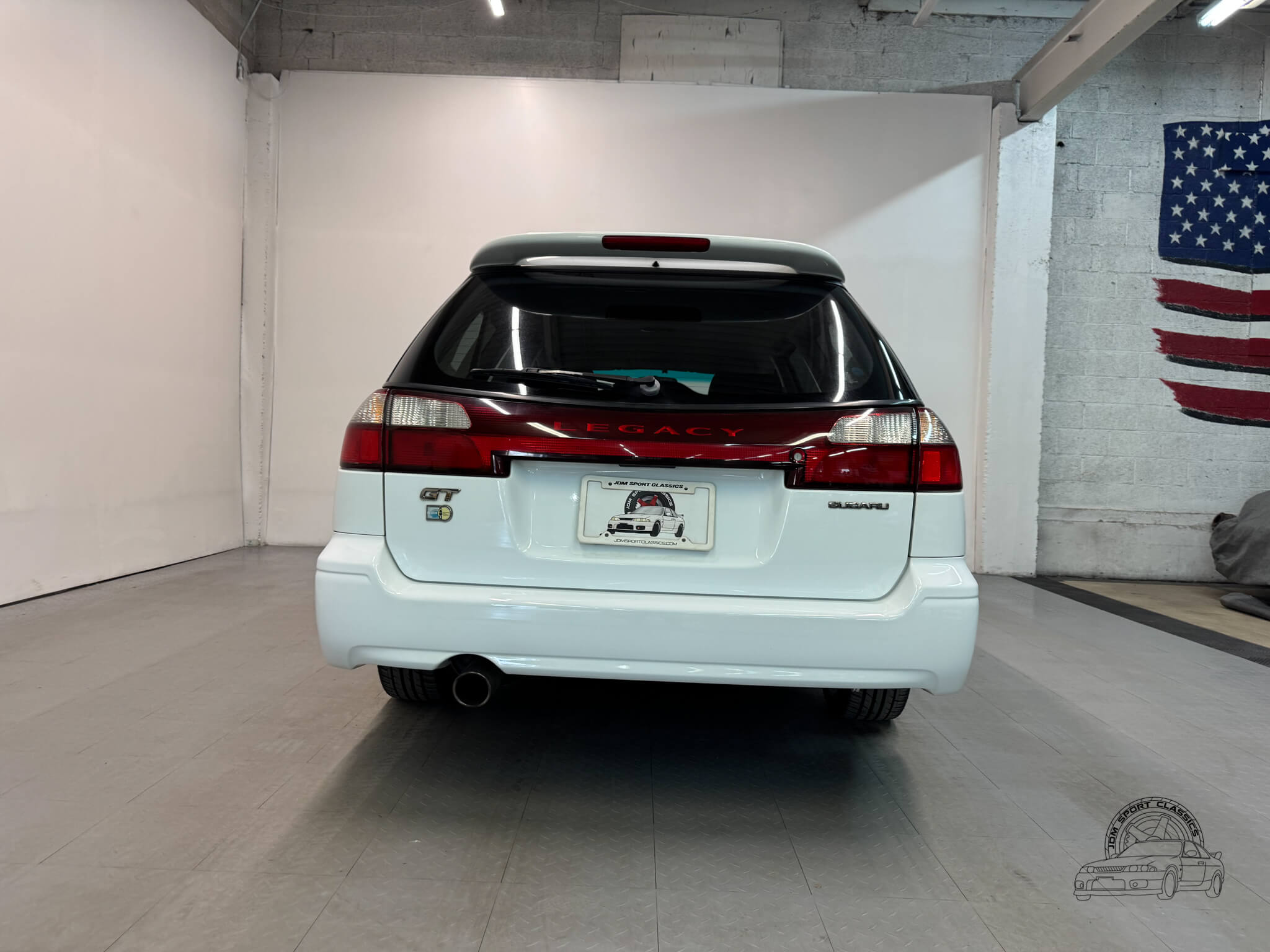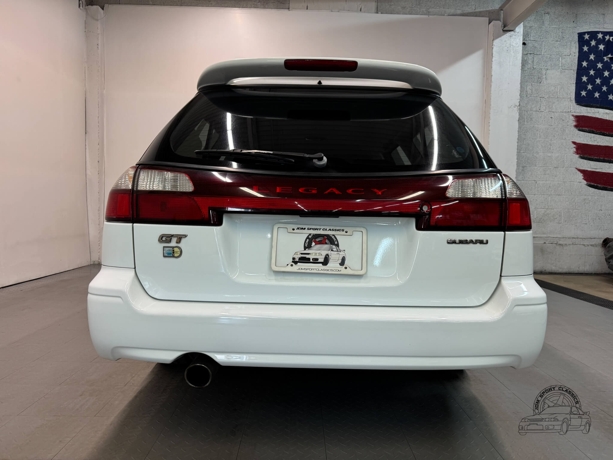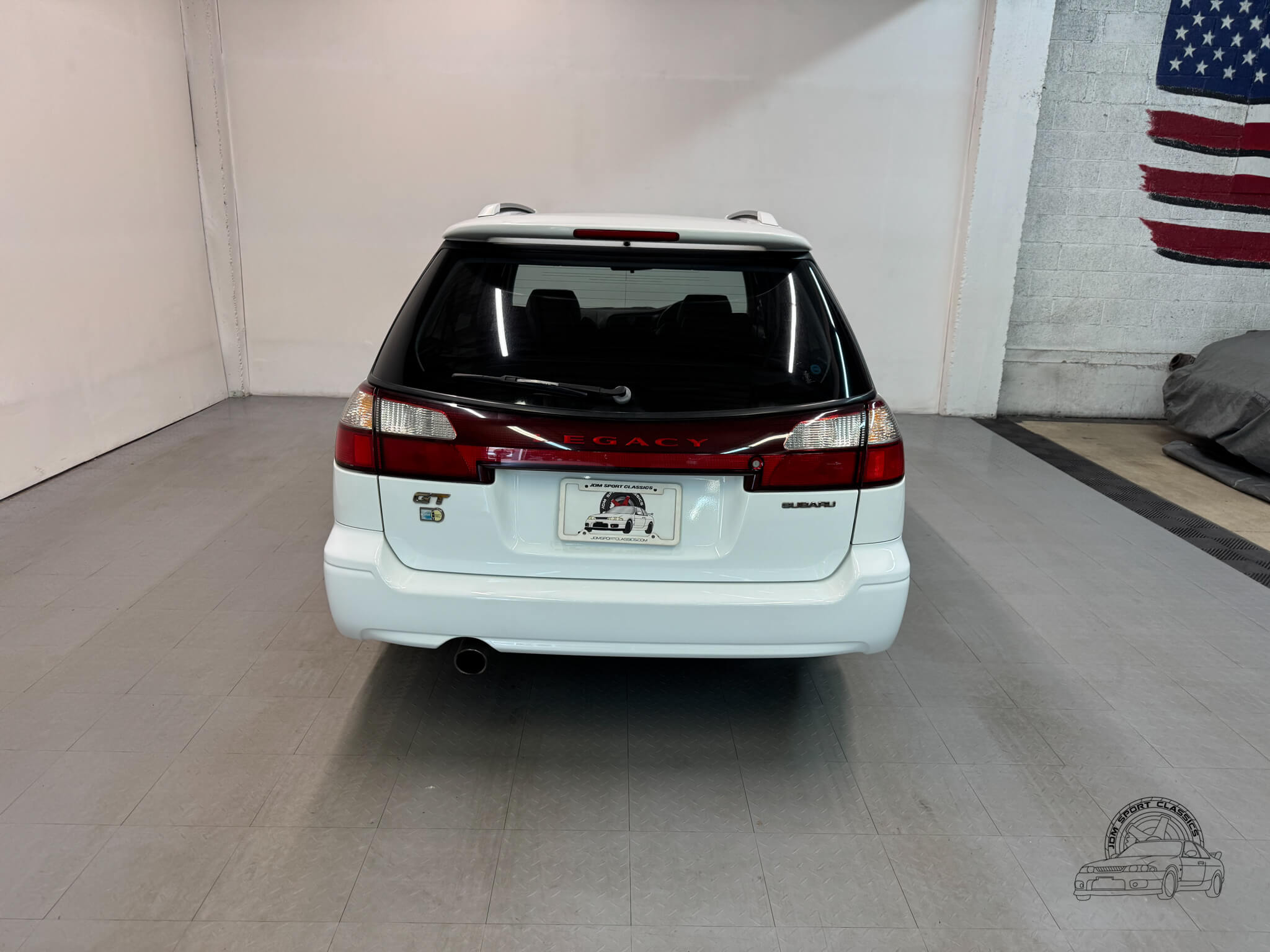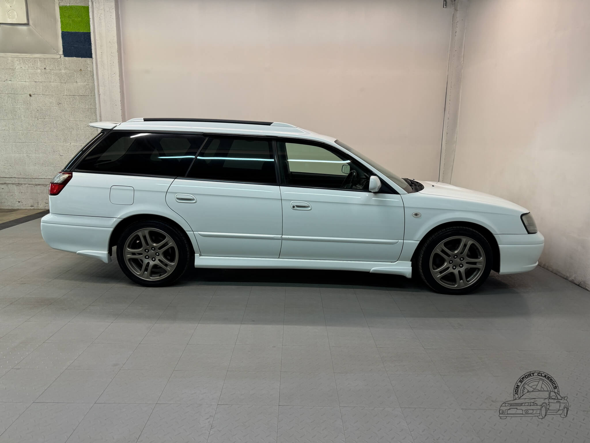 The exterior is finished in the classic Aspen White, which perfectly highlights the sport wagon’s athletic and understated body lines. The design is instantly recognizable to any enthusiast by its functional hood scoop and signature factory fog lights, which serve as a nod to Subaru’s rally heritage. Because this is a GT-B E-Tune, the car features a more aggressive stance from the factory thanks to its Bilstein suspension and original aero kit, including the rear bumper spats and side skirts. JDM-specific details like the factory rain guards, the red Legacy rear center garnish, and the original GT-B and Bilstein badging elevate the look.