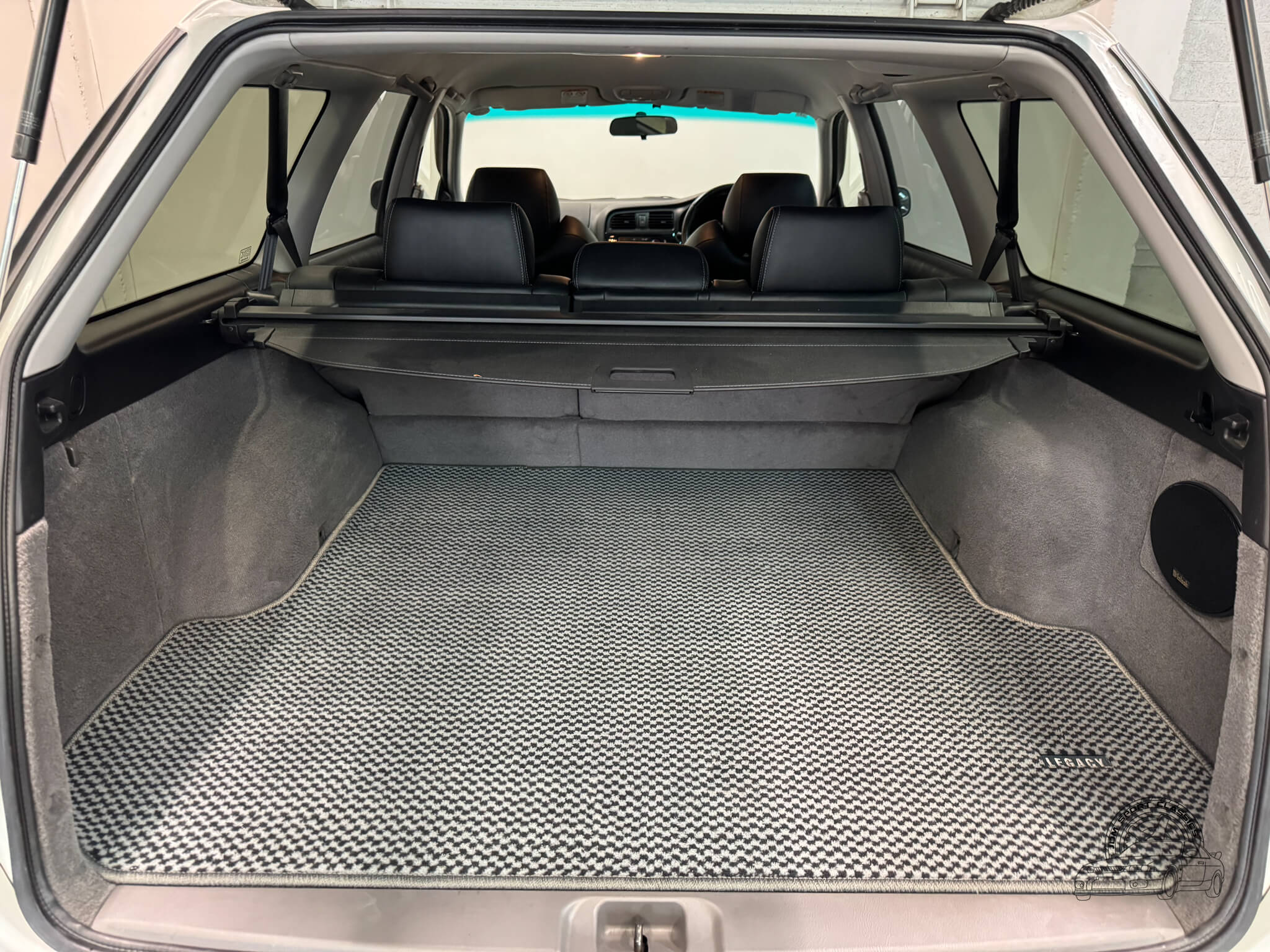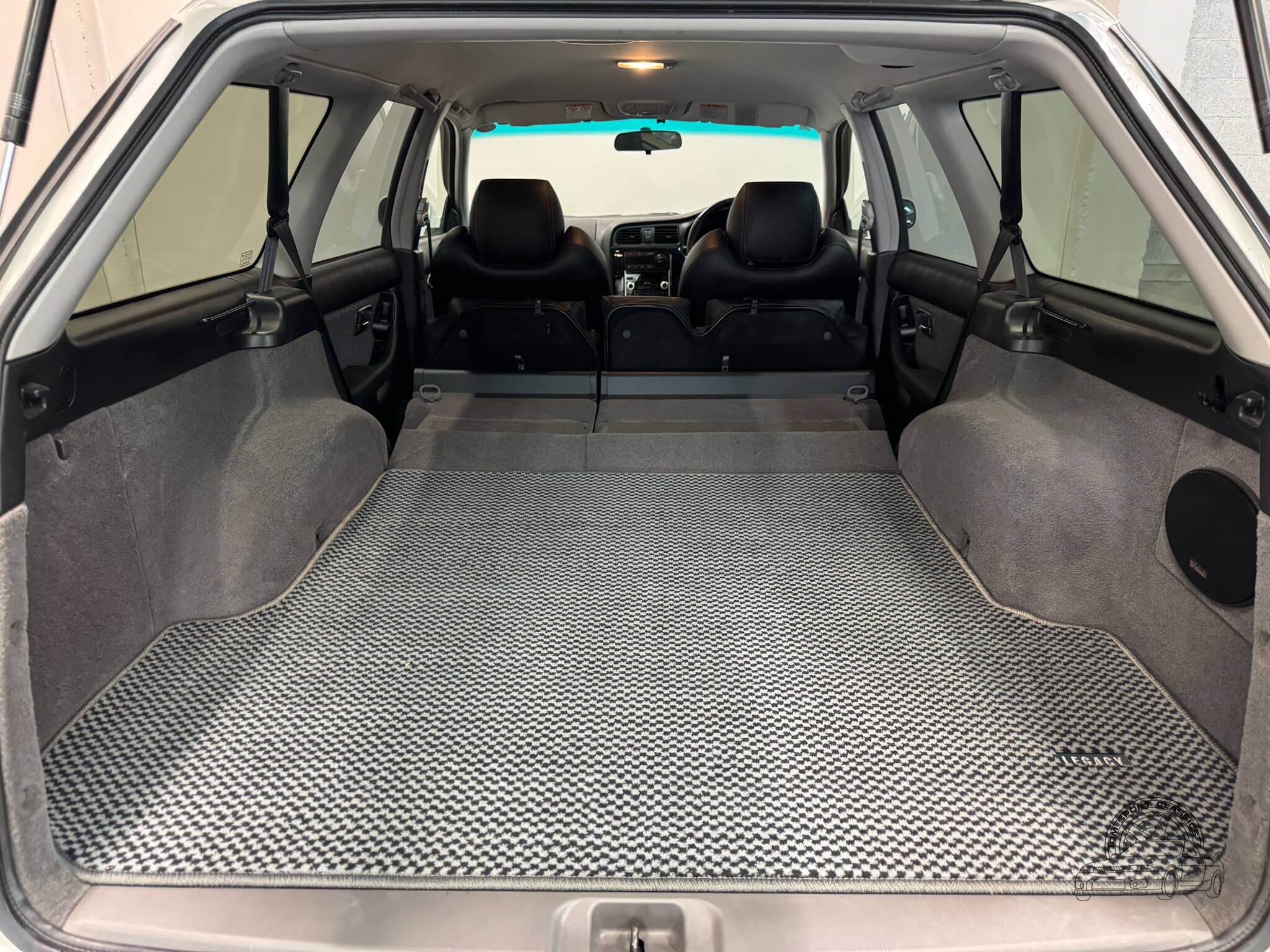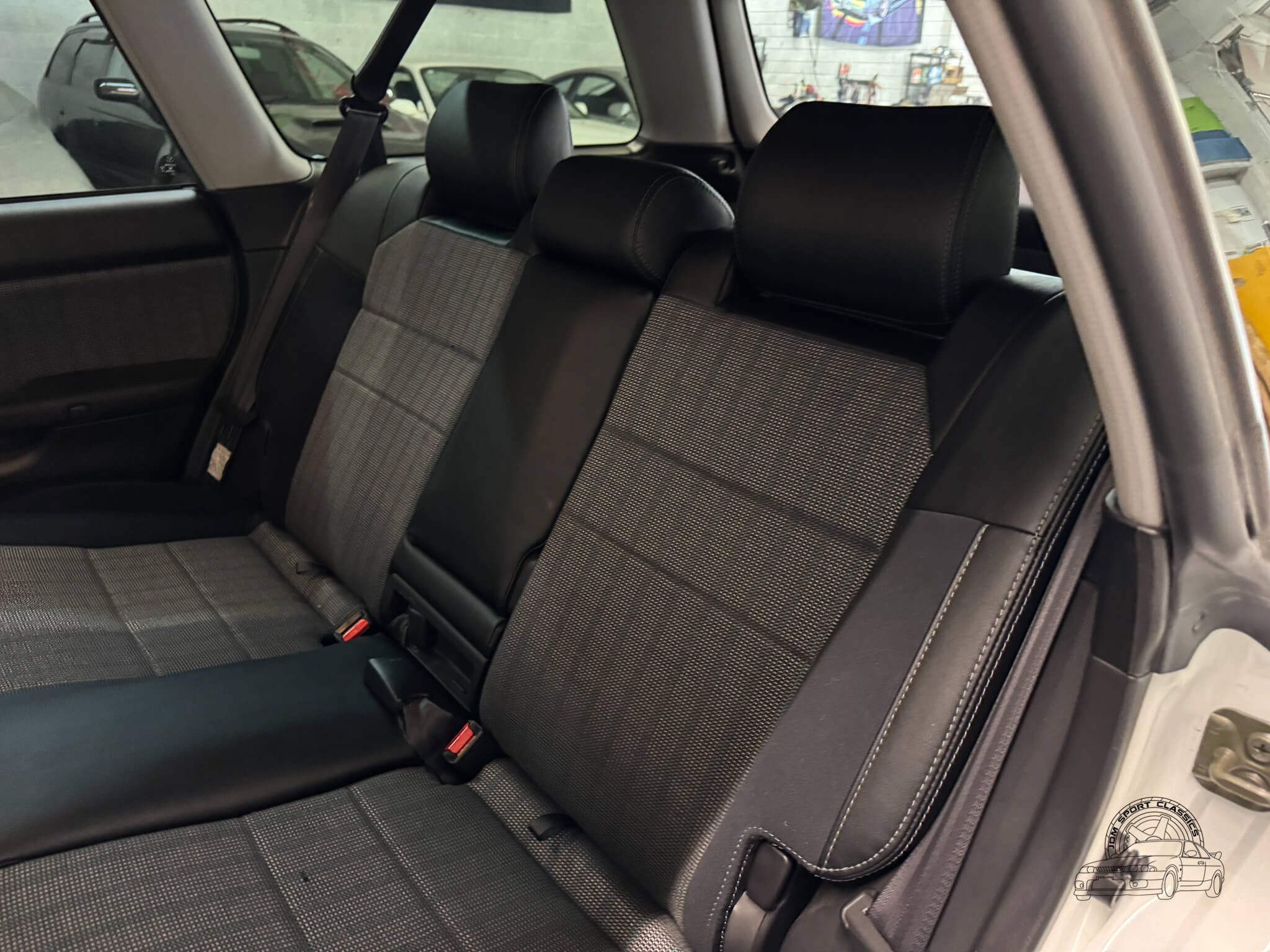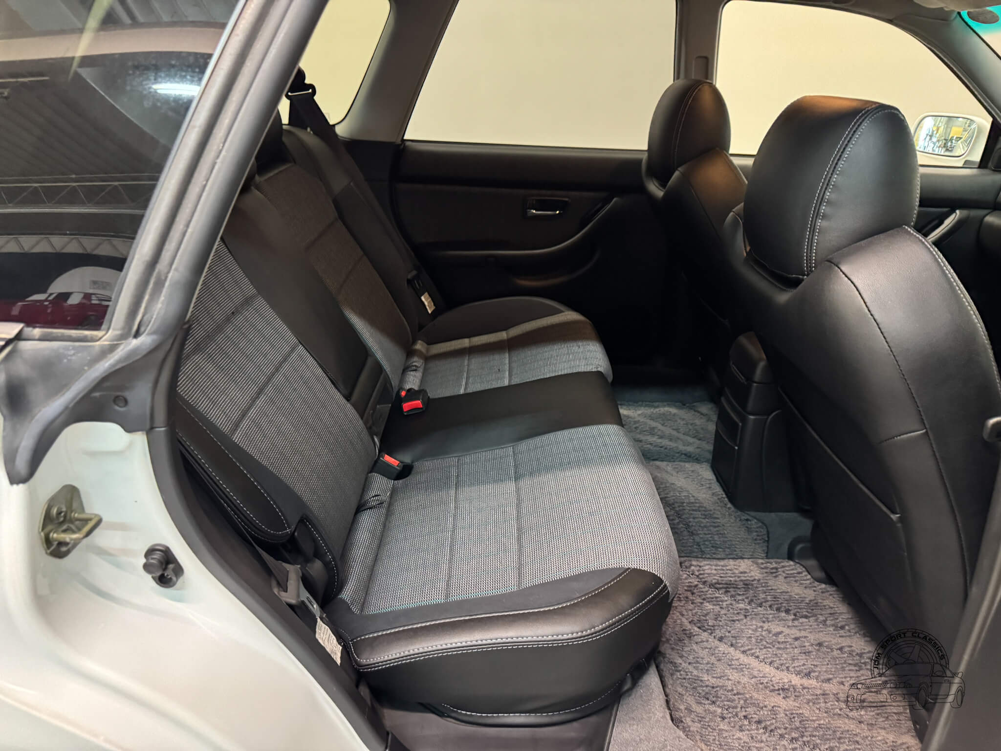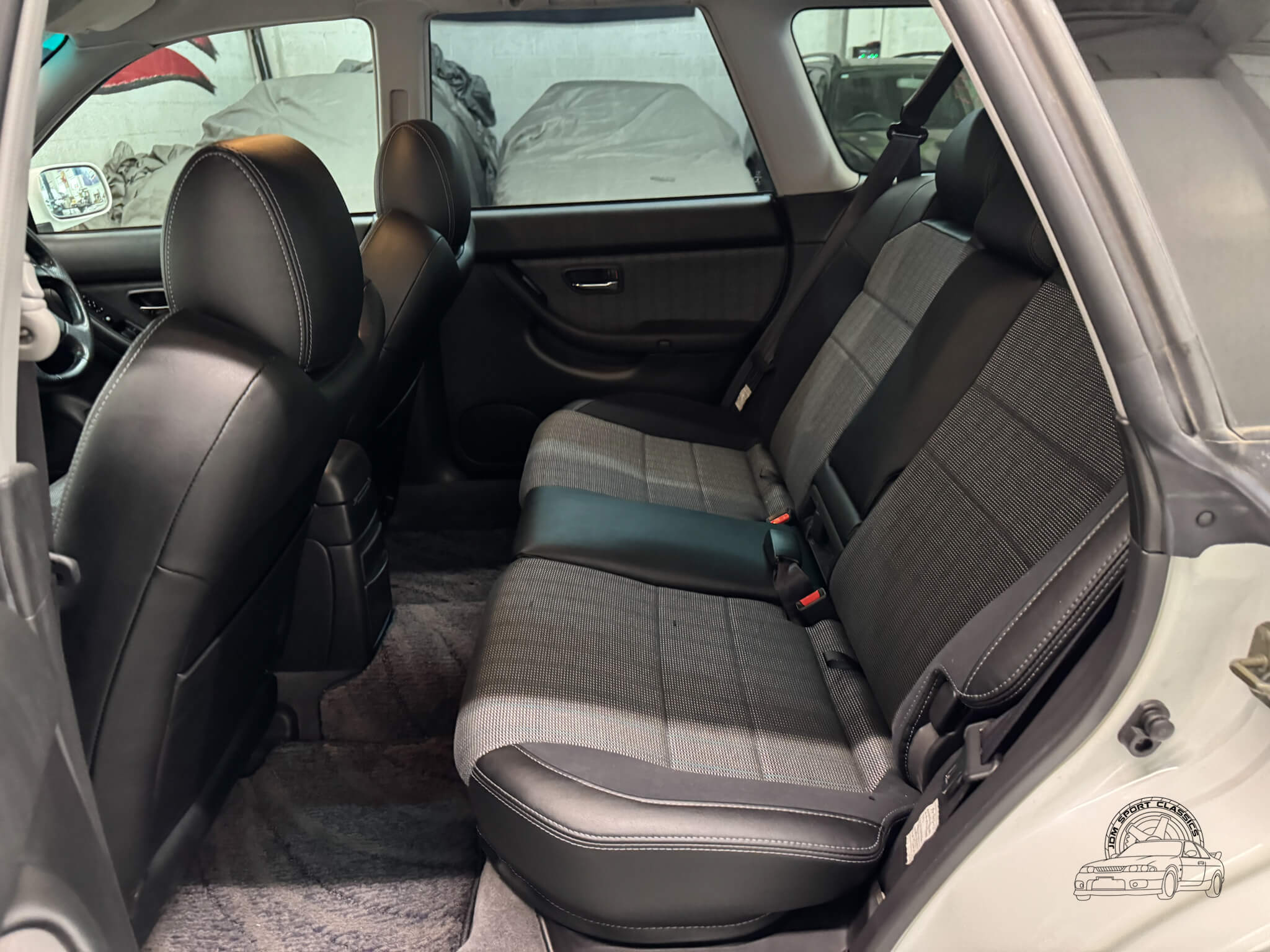 The cabin is built for the driver, balancing functional ergonomics with the refined feel of a high spec JDM sport wagon. This E-Tune features the factory half leather bolstered seats, which offer great lateral support for spirited driving without sacrificing comfort on long hauls. The driver’s seat is power adjustable with lumbar support, allowing for a precise driving position. Everything inside works as it should, from the ice cold A/C and powerful heater to the power folding mirrors and windows. Ample storage options like rear cubbies, a cargo net, and a privacy cover make it a versatile daily, while the folding rear seats provide the extra utility expected from a Legacy. It is a clean, well cared for interior that clearly reflects its one owner history.