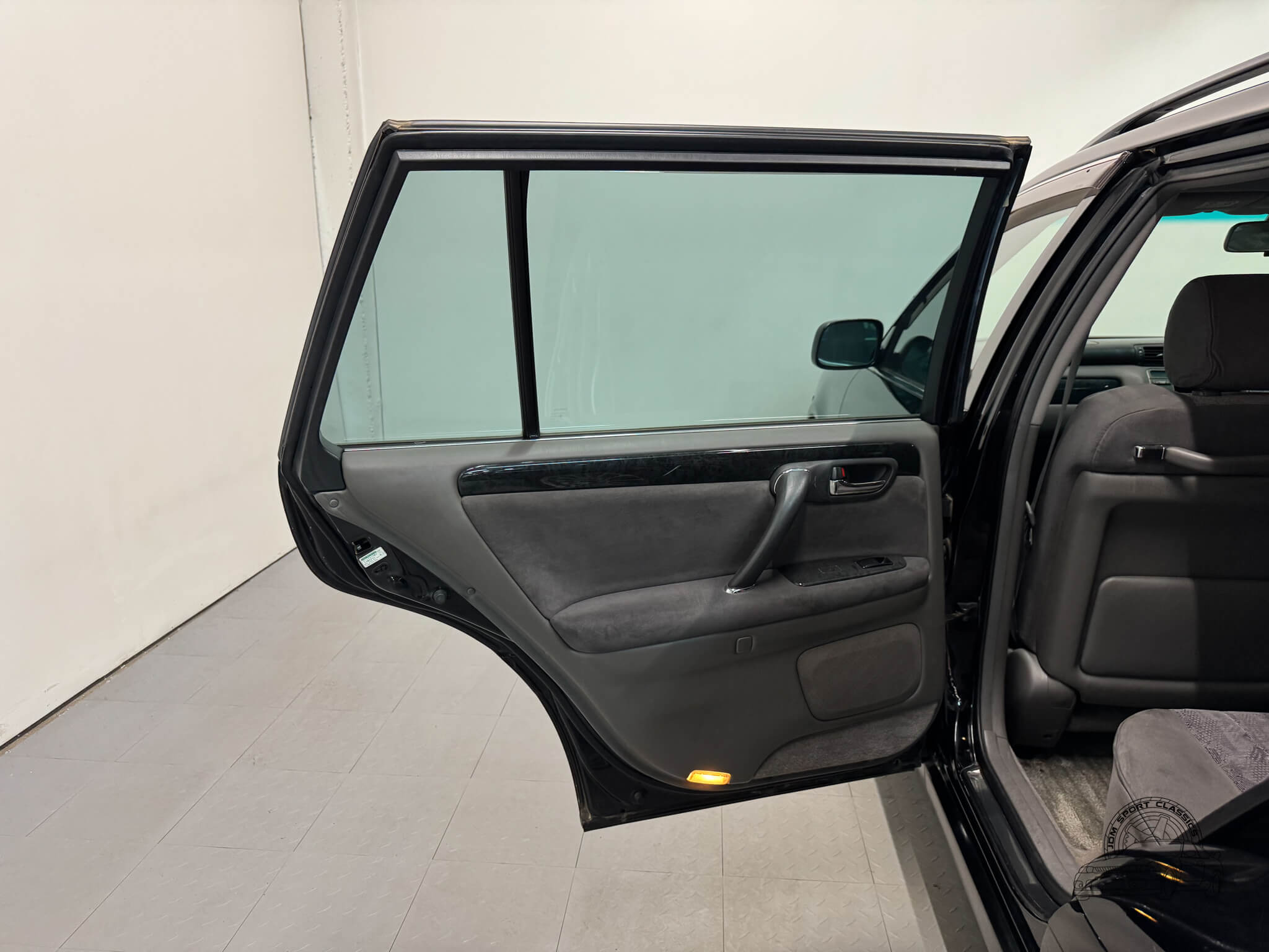 The exterior is finished in Onyx Black, featuring the darkened chrome grille and factory Athlete badging. This example has been modified with custom smoked finish headlight and taillight housings, which tie in with the paint for a more monochromatic appearance. It sits on 17-inch Bridgestone ECO FORME SE-12 wheels; the silver finish of the alloys combined with the chrome door handles provides a sharp contrast against the deep black paint. While the body is straight and the car shows well, it is an honest example with typical age related wear, including minor scratches and some clear coat fade on the roof. It retains the original integrated roof rails, which emphasize the long, boxy styling that makes these 170 series wagons so iconic.
