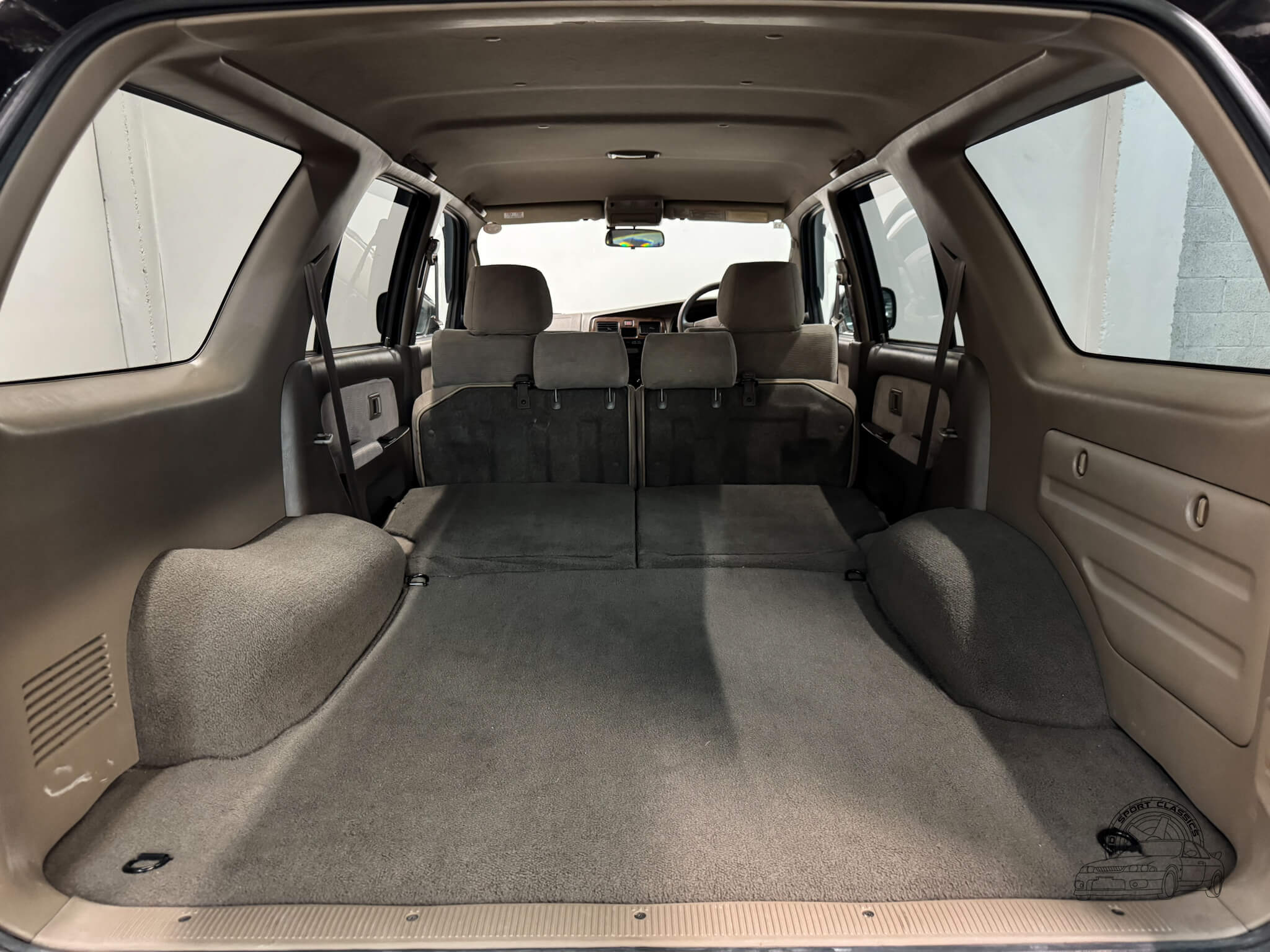 The SSR-G cabin presents a higher level of factory trim and a layout built for long term durability. This example features specific SSR-G touches like factory woodgrain trim and mixed media door cards that distinguish the interior from base configurations. The cabin is fully equipped with power windows including the signature power down rear hatch window along with power locks, power adjustable folding mirrors, and a tilt steering wheel. A unique JDM functional detail is the power-retractable rear under-mirror which deploys from the rear spoiler to assist with visibility while reversing. Occupants are served by a digital climate control system providing ice cold air conditioning and responsive heat, complemented by both front and rear cupholders. The rear of the vehicle offers a large, versatile cargo area, making it a highly practical platform for gear heavy trips or daily use.