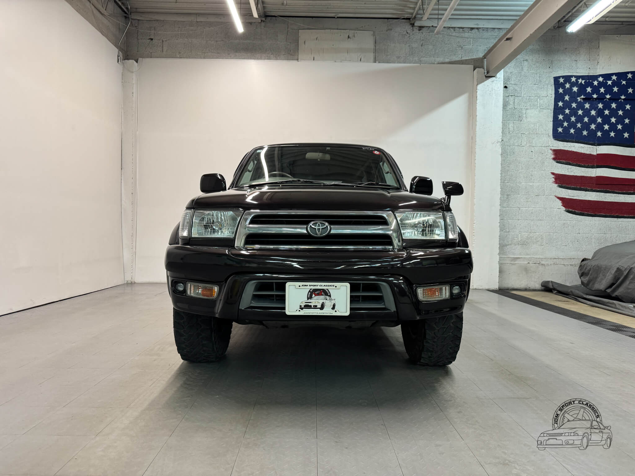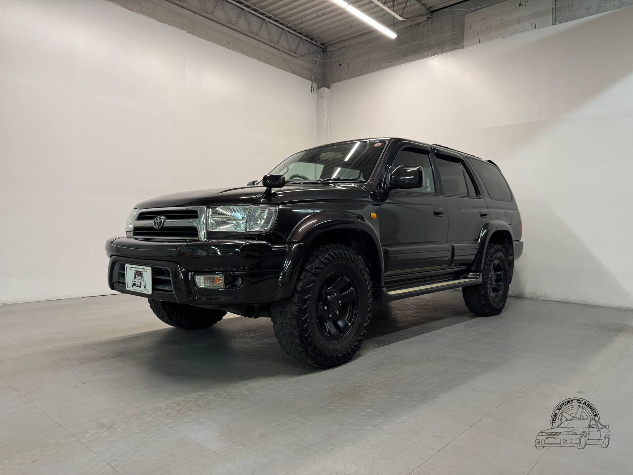 The standout feature of this Hilux Surf is its custom Midnight Amethyst Metallic paint, a deep shade that appears black in the shade but reveals a rich violet hue in direct light. The body remains straight and clean, accented by factory wide body fender flares and original 16 inch alloy wheels. This example is equipped with several functional accessories including factory rain guards, side steps, and the classic JDM fender mirror for improved forward visibility. At the rear, the vehicle features the factory tire swing arm with a full-sized spare, providing a simple rugged look. From the iconic front end styling to the unique color, this is a sharp looking example of the N185 chassis.