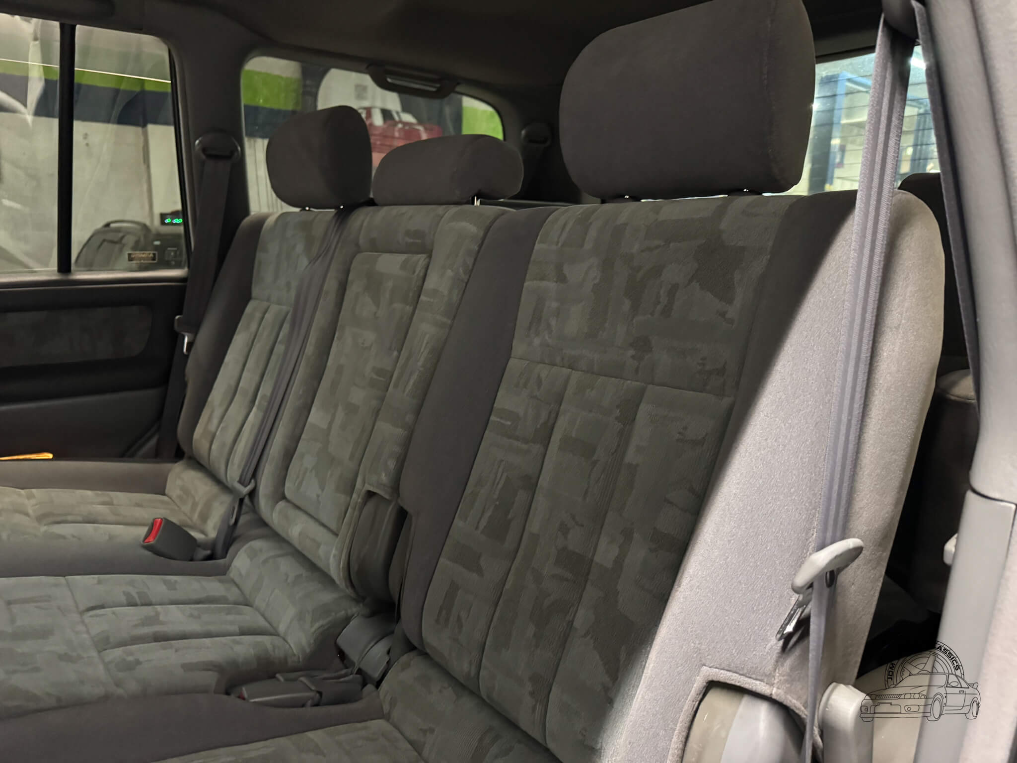 The interior of the G-Selection cabin reflects the premium status of the 100 Series, offering a spacious 8 seater layout that remains a comfortable place for long trips. The seats are finished in a high grade Moquette cloth that many enthusiasts prefer over the leather found in domestic models because it stays cooler in the summer, warmer in the winter, and is much more resistant to cracking or wear over time. Up front, both the driver and passenger have power adjustable heated seats, surrounded by classic wood grain trim on the dash and door panels. This cabin comes loaded with features like dual zone front and rear climate control, power windows, power locks, and a tilt steering wheel with integrated cruise control. For safety and convenience, the truck is equipped with dual front airbags, ABS, a dedicated sunglasses holder, and cupholders for both front and rear passengers. The rear section features pop-out windows and factory tinted glass for privacy, and the third row jump seats fold up and stow against the side windows so you can quickly switch from a passenger hauler to a large cargo area without having to take the seats out of the truck. Controls for the Active Height Control (AHC) and center differential lock are right at your fingertips, making the vehicle’s capability easy to manage. Please note that the power sunroof and the power folding and adjusting functions of the side mirrors are currently inoperable, and these items have been factored into the listing price.